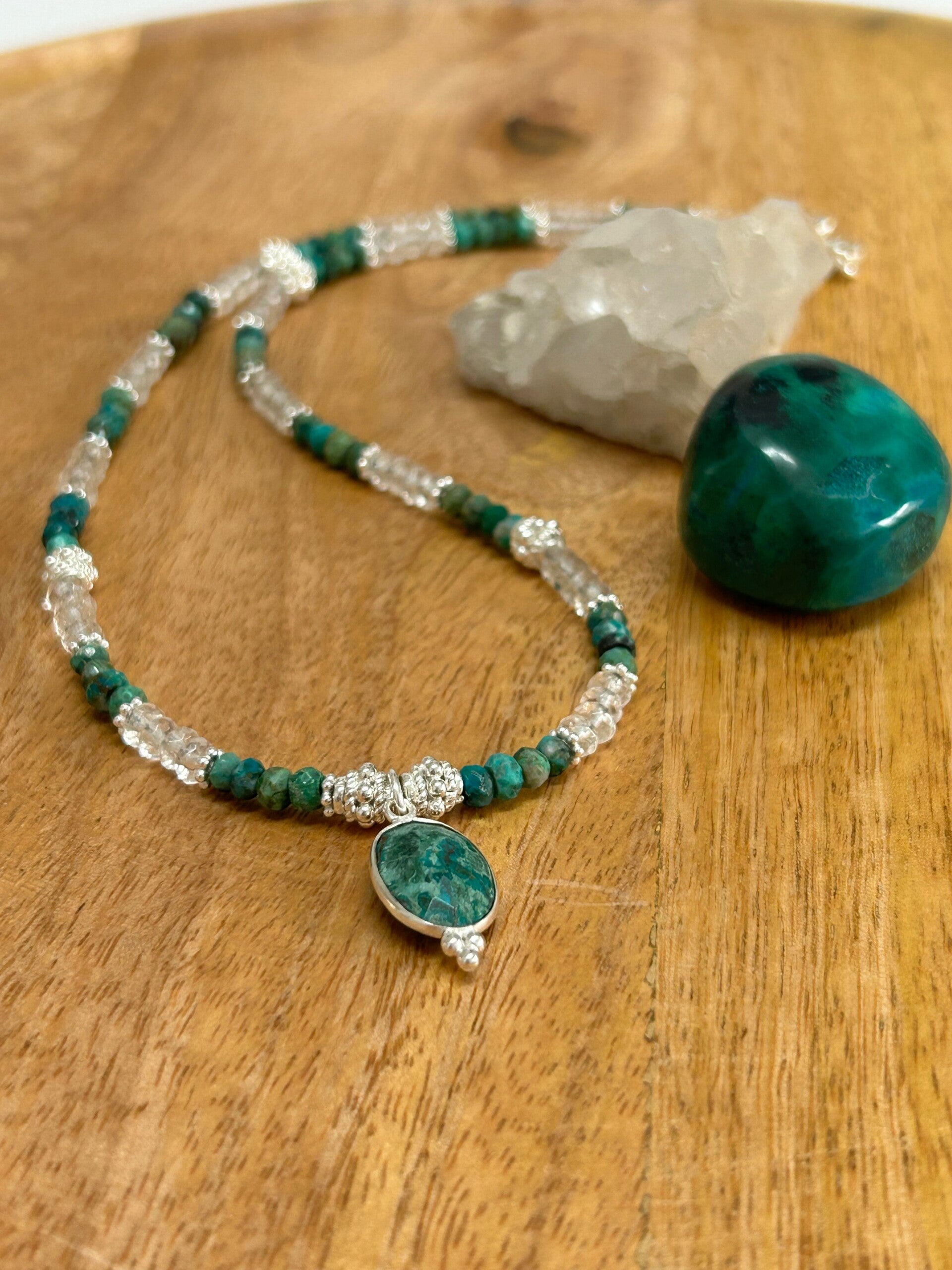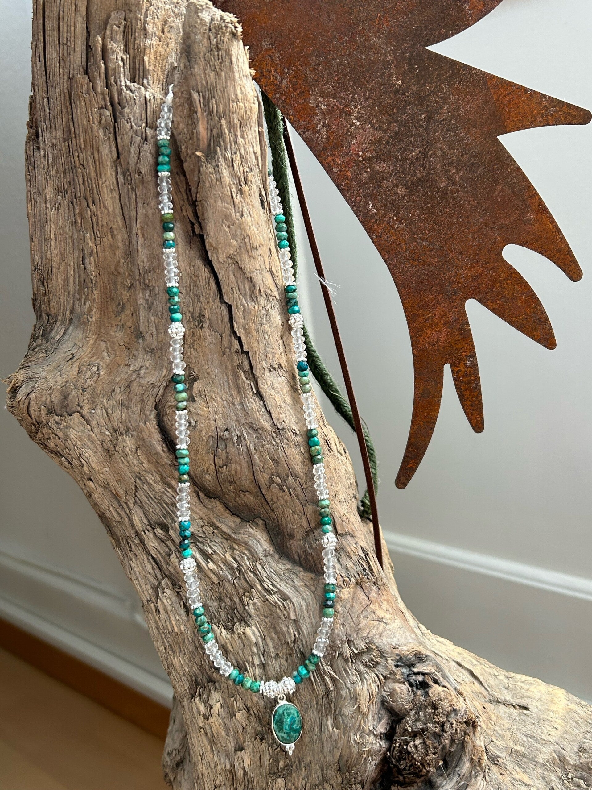 Länge auf dem Bild: 43cm (Deine Wunschlänge in den Kommentar eintragen und entsprechende Preisklasse wählen!); Zwischenteile und Anhänger Silber 925; Kugeln 4mm facettiert; Anhänger Chrysokoll 18 x 11mm