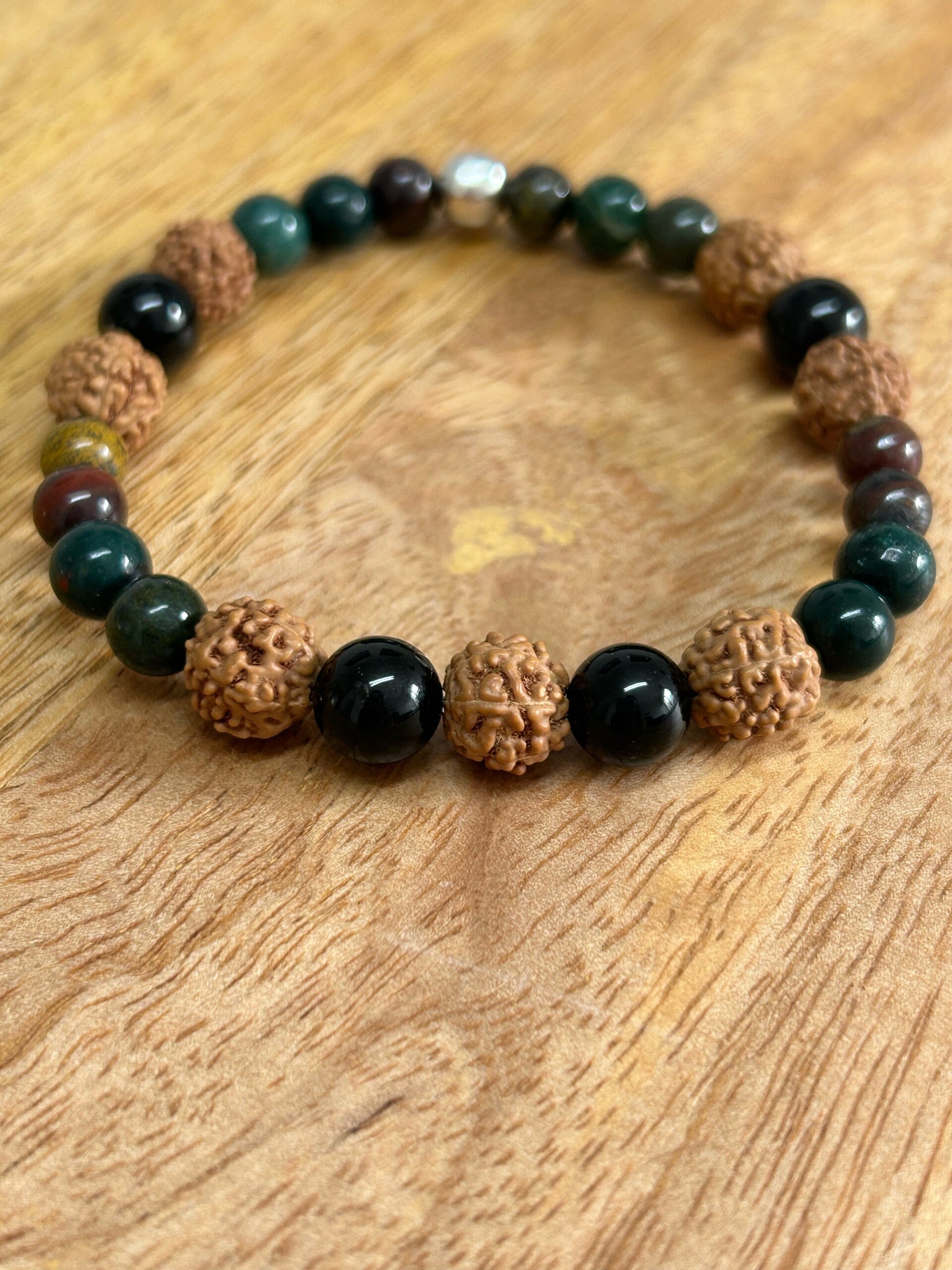 Rudraksha: schenkt Ruhe, Schutz, Glück und Klarheit; wirkt beruhigend auf das Nervensystem und reguliert den Blutdruck; absorbiert die Energie ihres Trägers und hüllt ihn dadurch in einen Kokon seiner eigenen Energie