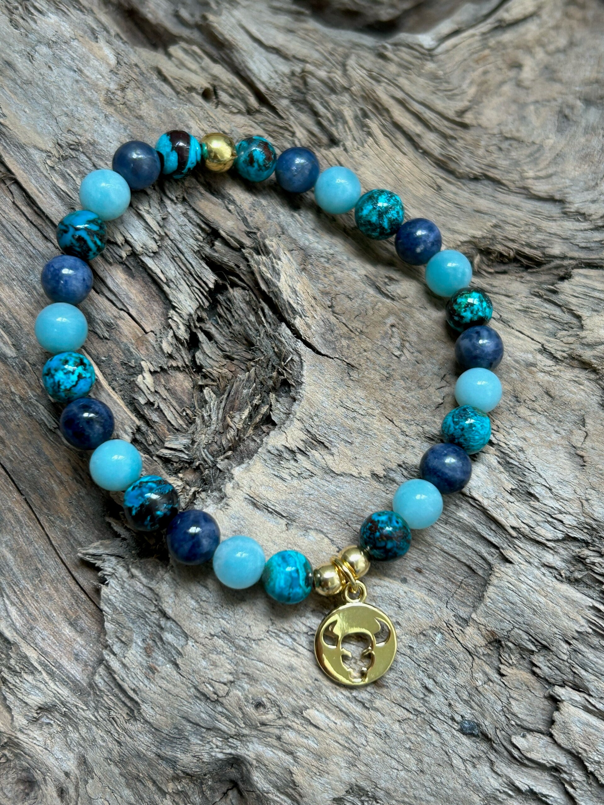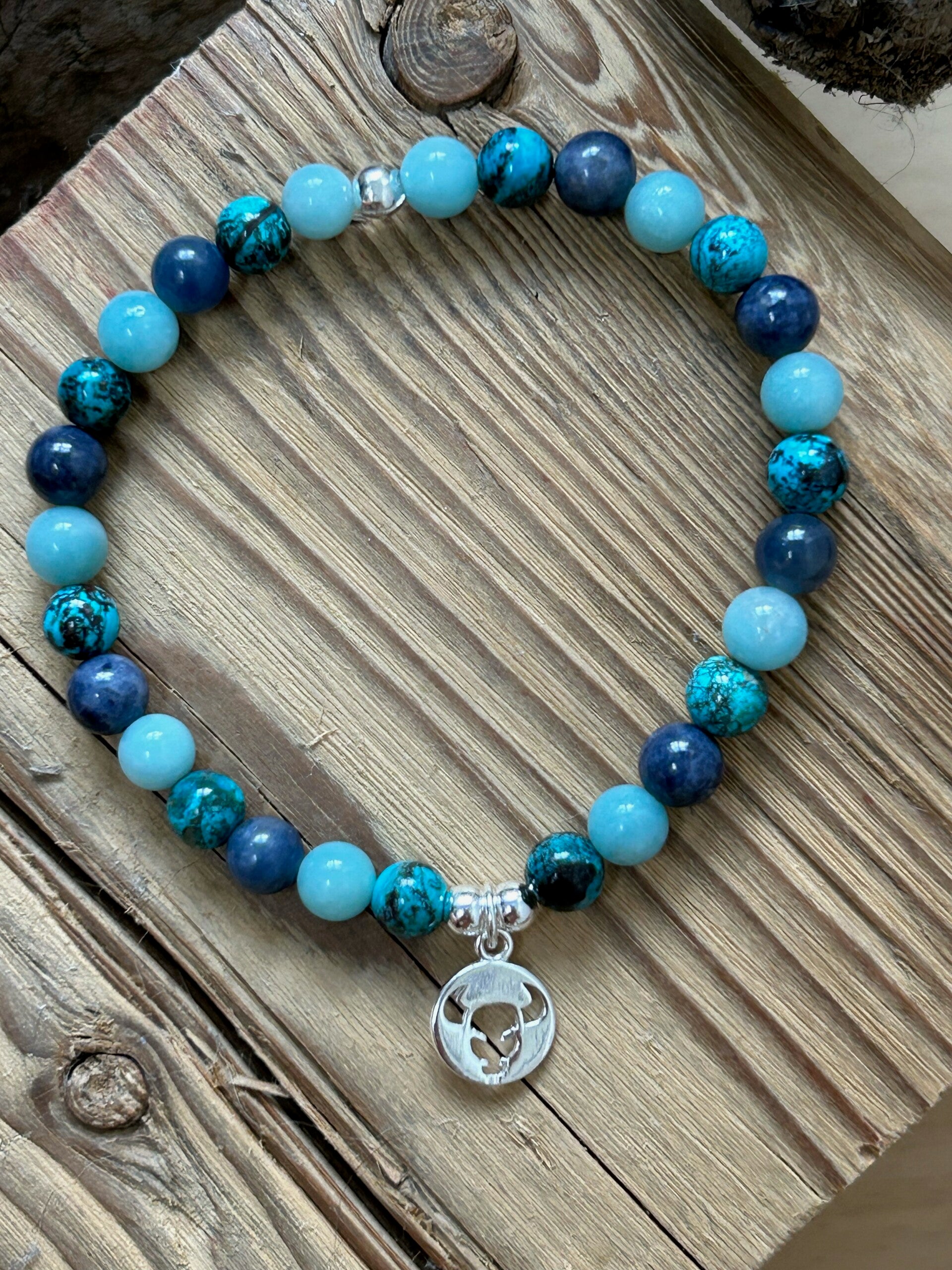 Heilsteine (Link zu Beschreibung und Wirkung): Amazonit, Chrysokoll, Saphir blau