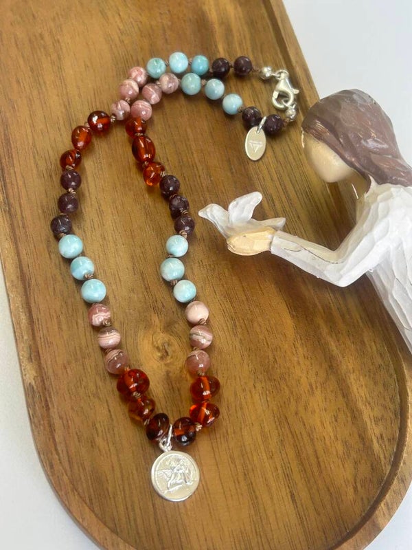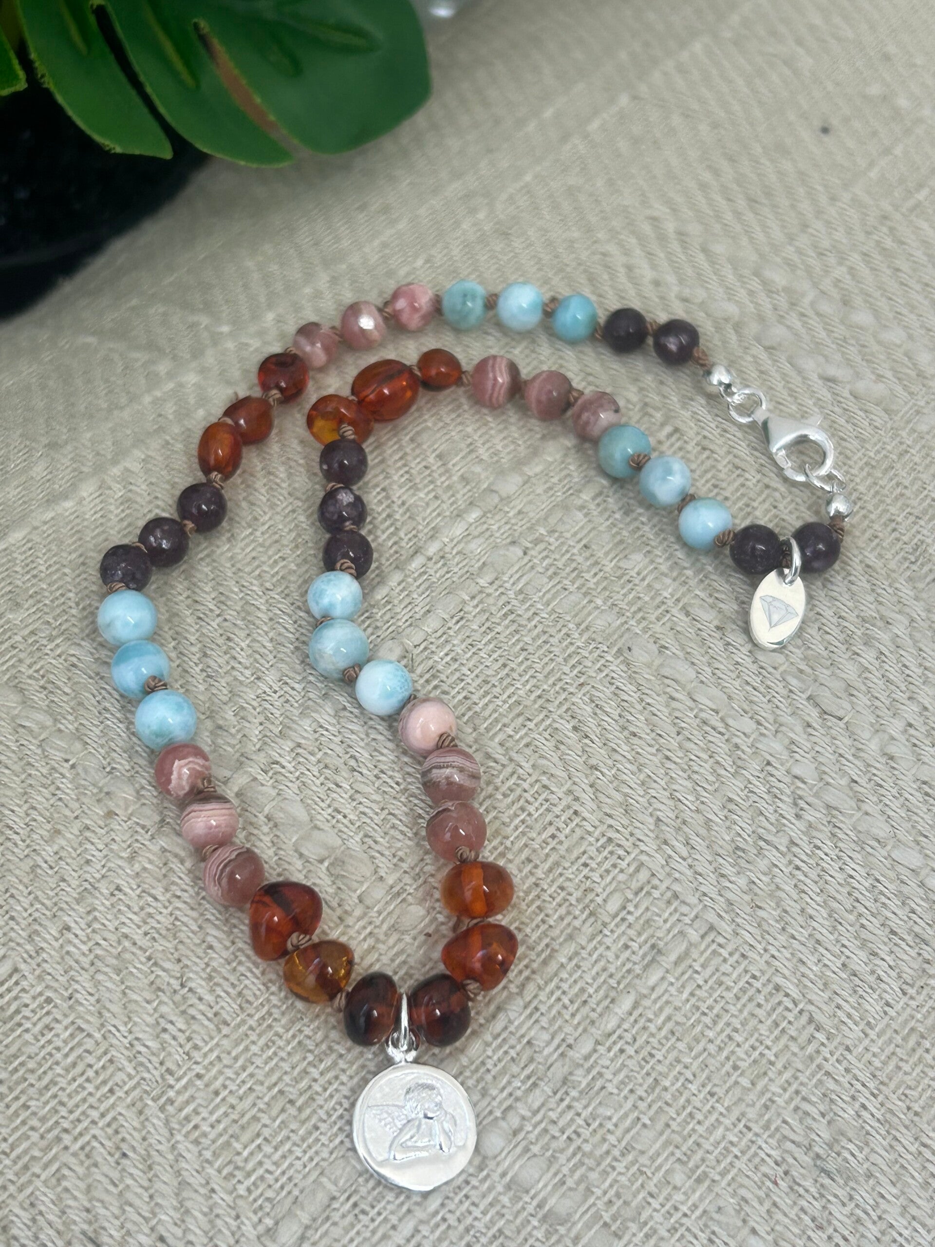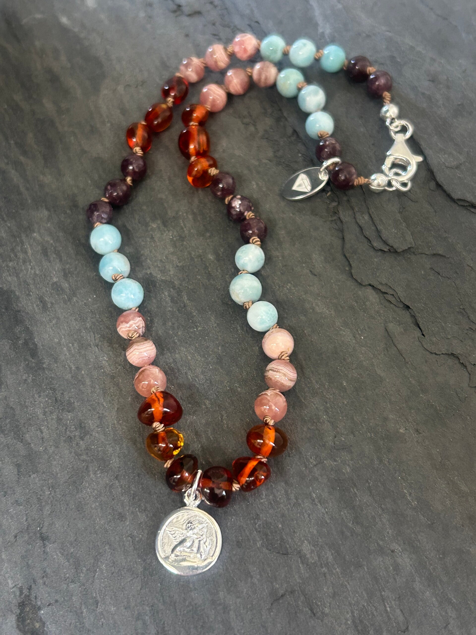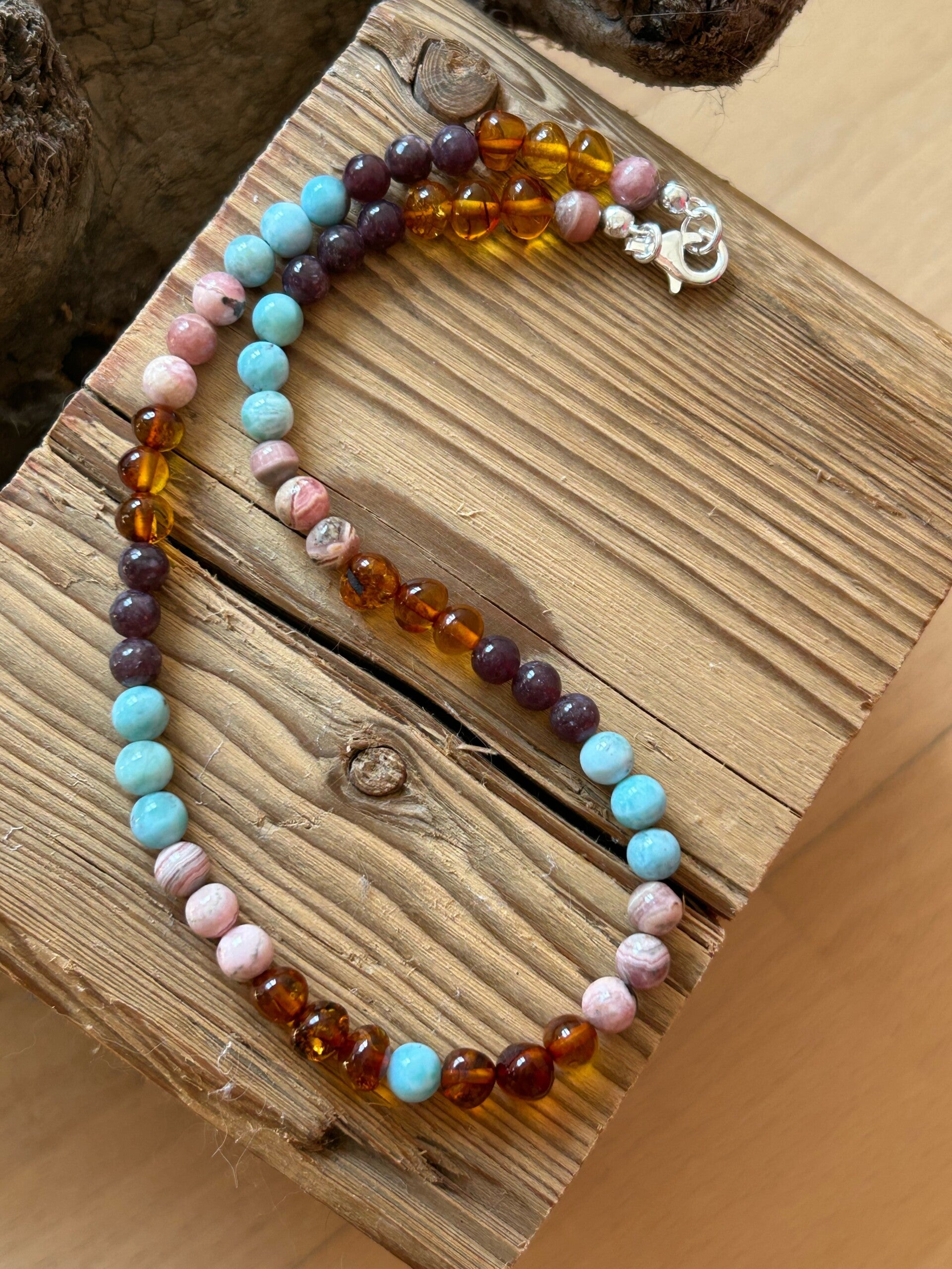 Heilsteine (Link zu Beschreibung und Wirkung): Bernstein Barock, Larimar, Lepidolith, Rhodochrosit