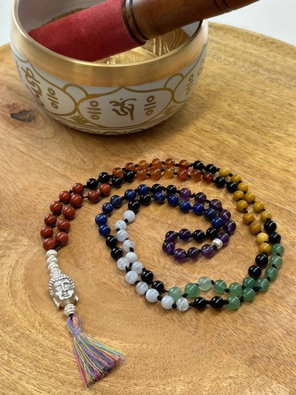Länge: ca. 90cm; Silber 925 Buddha-Kopf und Elemente; geknüpft; 108 Kugeln; Kugeln 6mm; Quaste bunt
