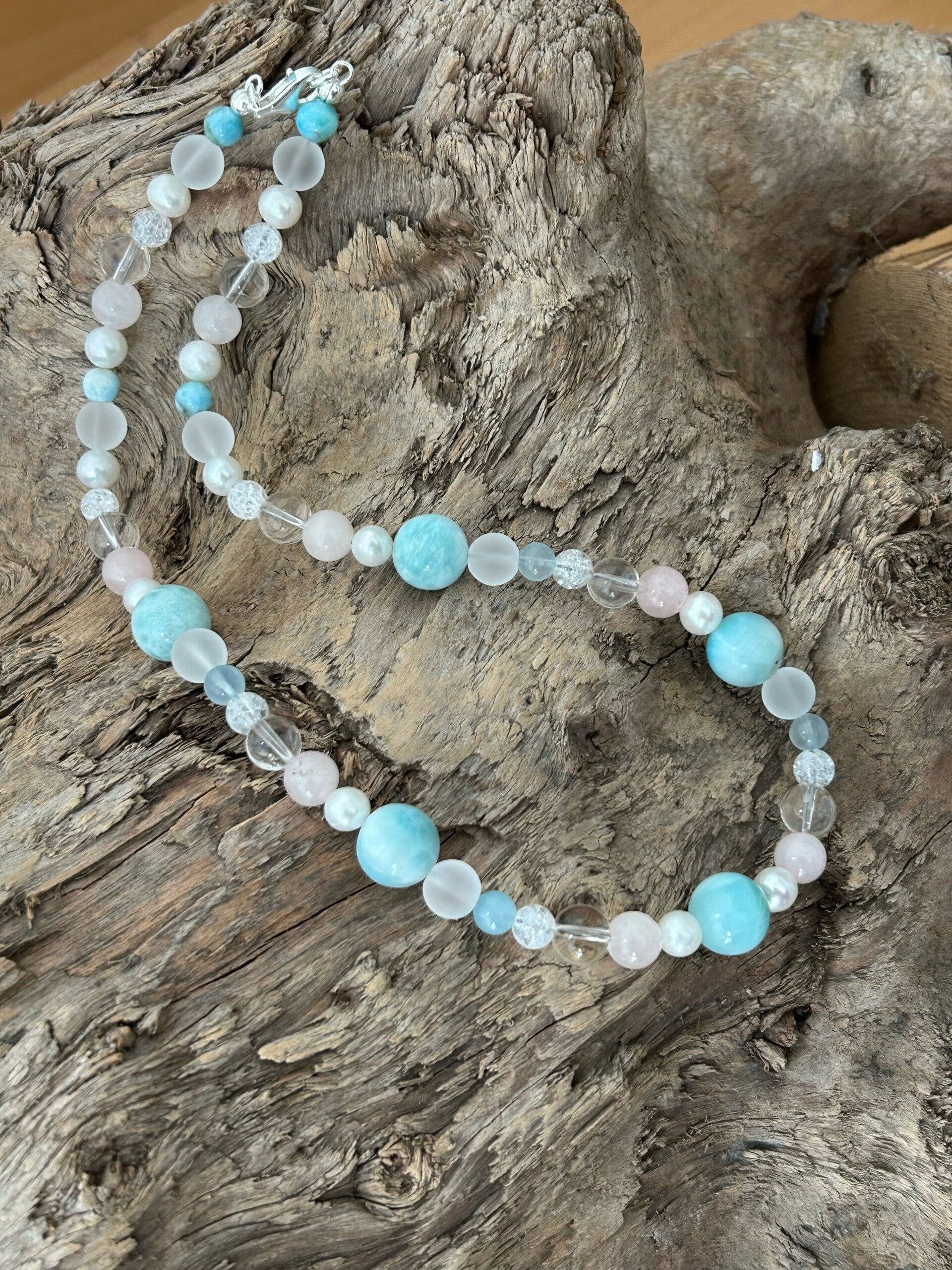 Heilsteine (Link zu Beschreibung und Wirkung): Bergkristall matt, glanz und Iris, Beryll blau (Aquamarin), Larimar, Rosenquarz, Süsswasserperle