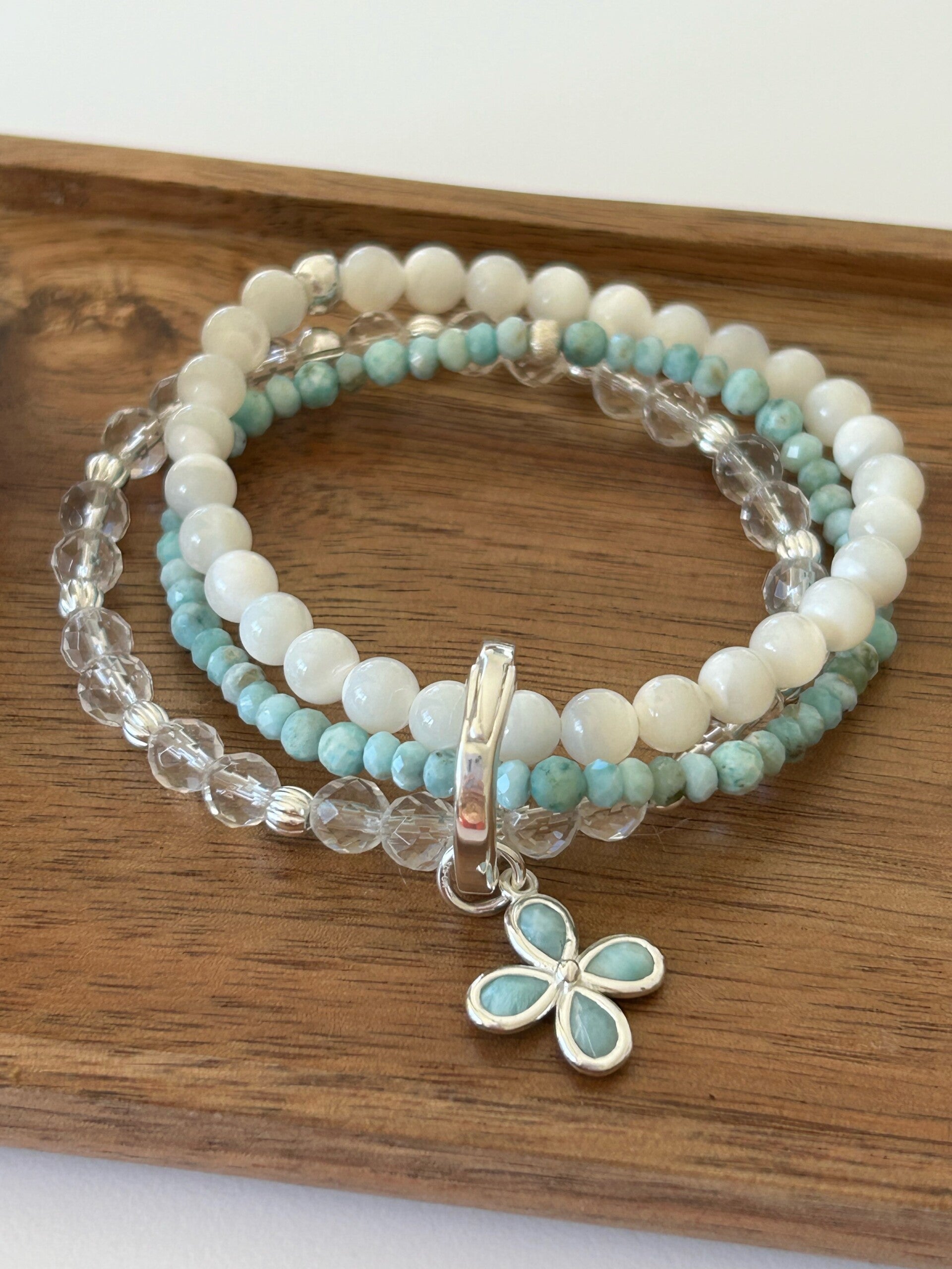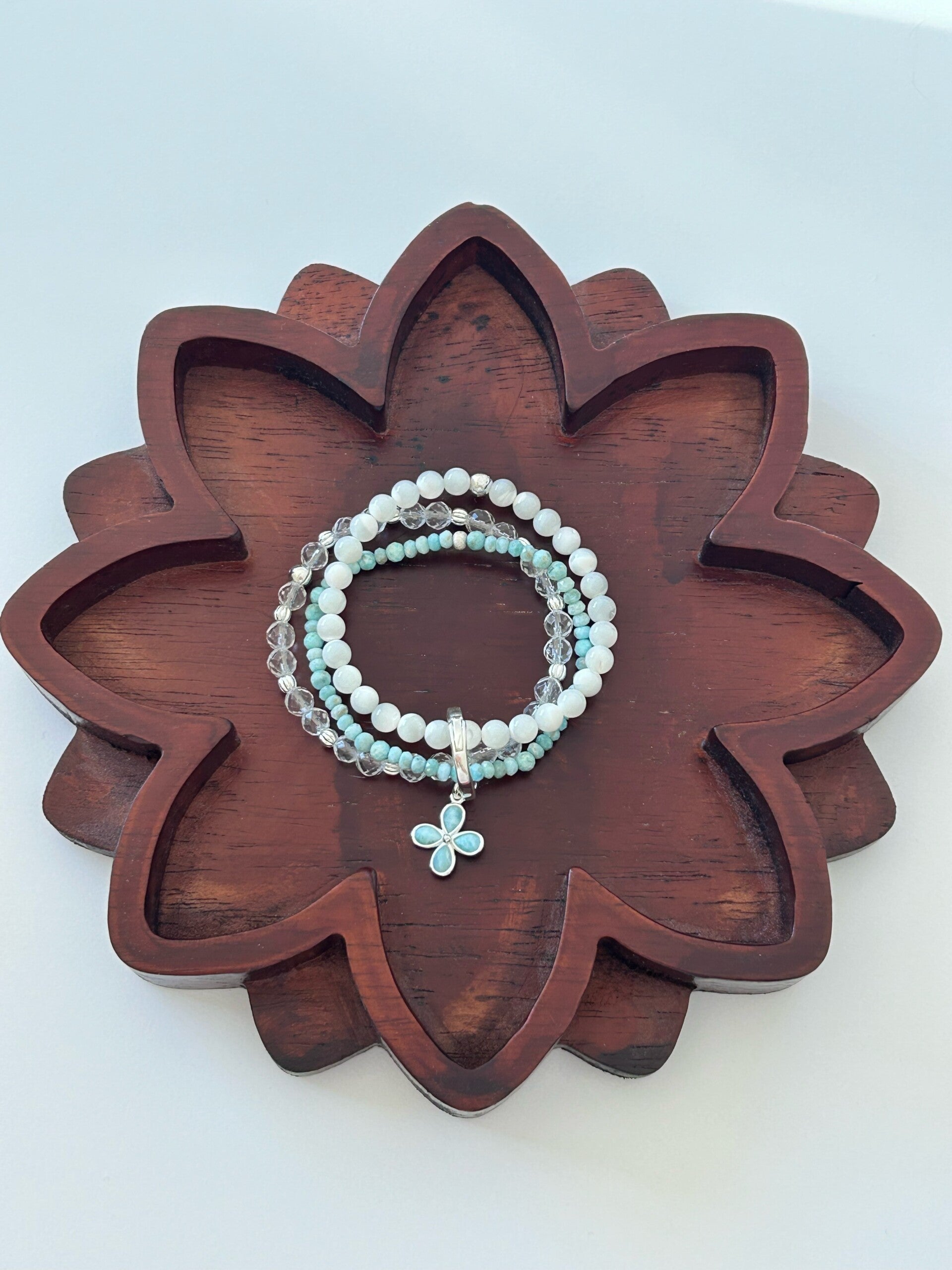 Hinweis: mit Stretch-Band; Silber 925 Anhänger "Blume", Karabiner und Elemente; Kugeln 4 und 6mm (teilweise facettiert)
