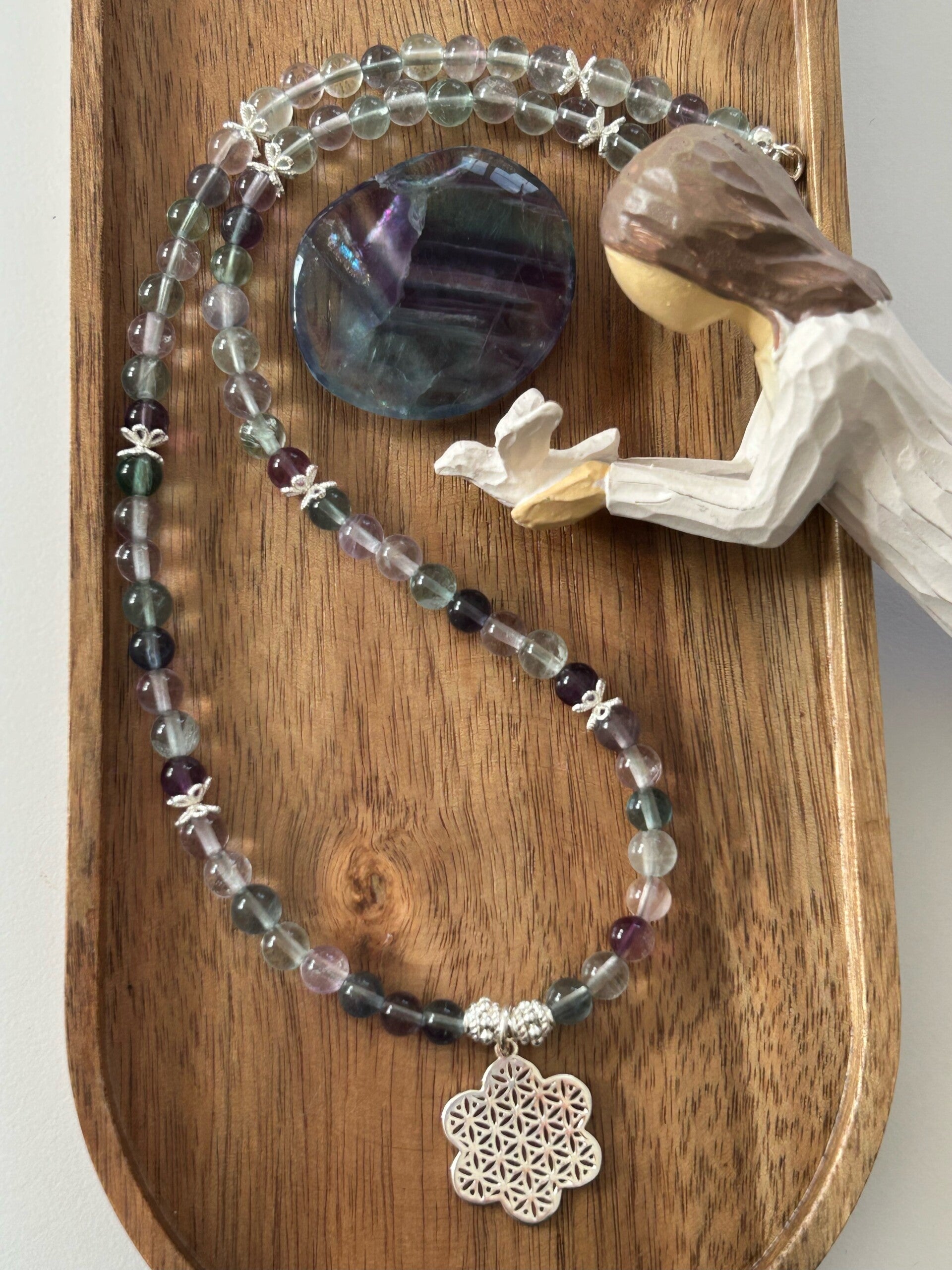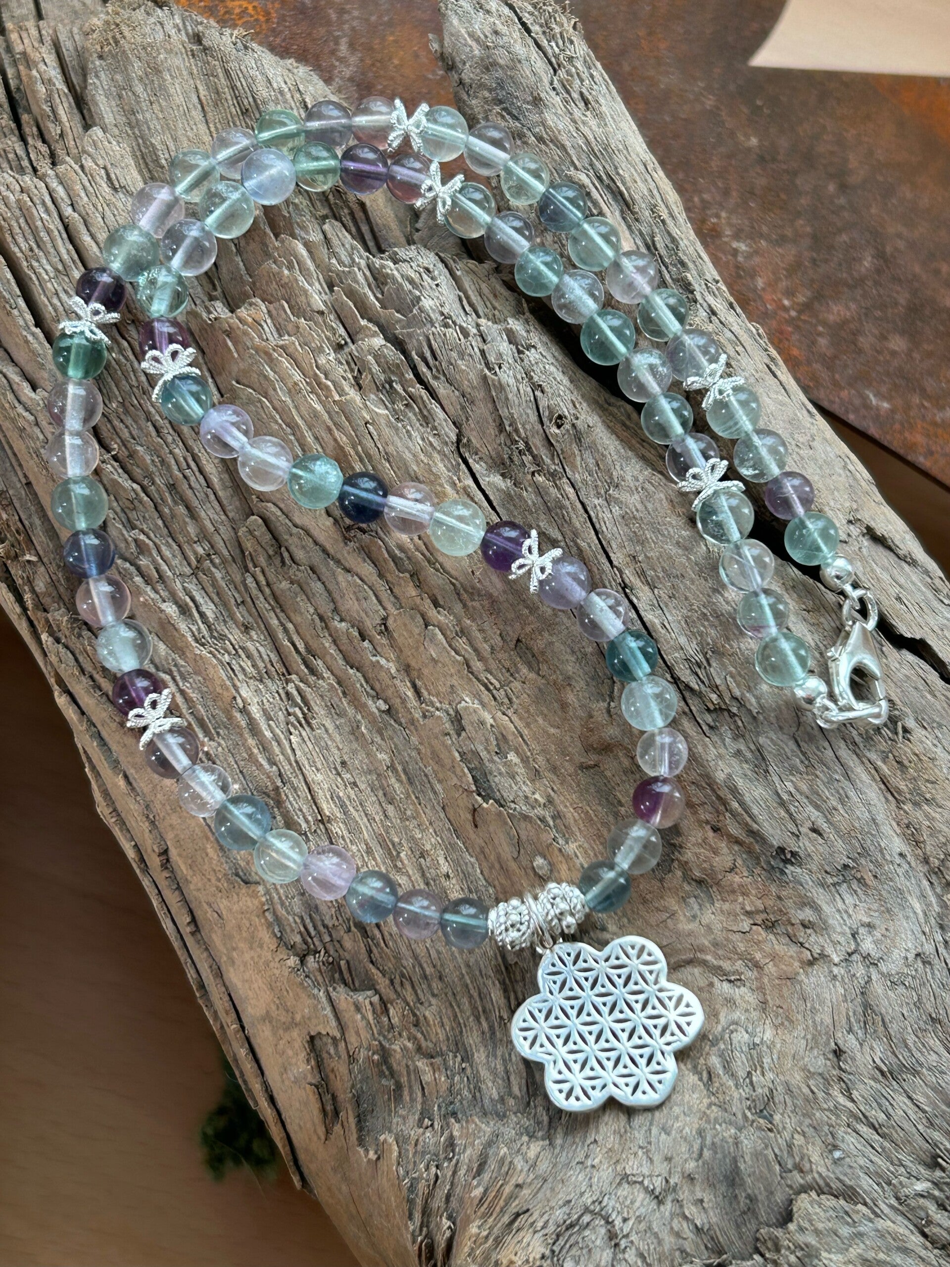 Länge auf dem Bild: 47cm (Deine Wunschlänge in den Kommentar eintragen und entsprechende Preisklasse wählen!); Silber 925 Anhänger "Lebensblume", Perlkappen und Elemente; Kugeln 6mm