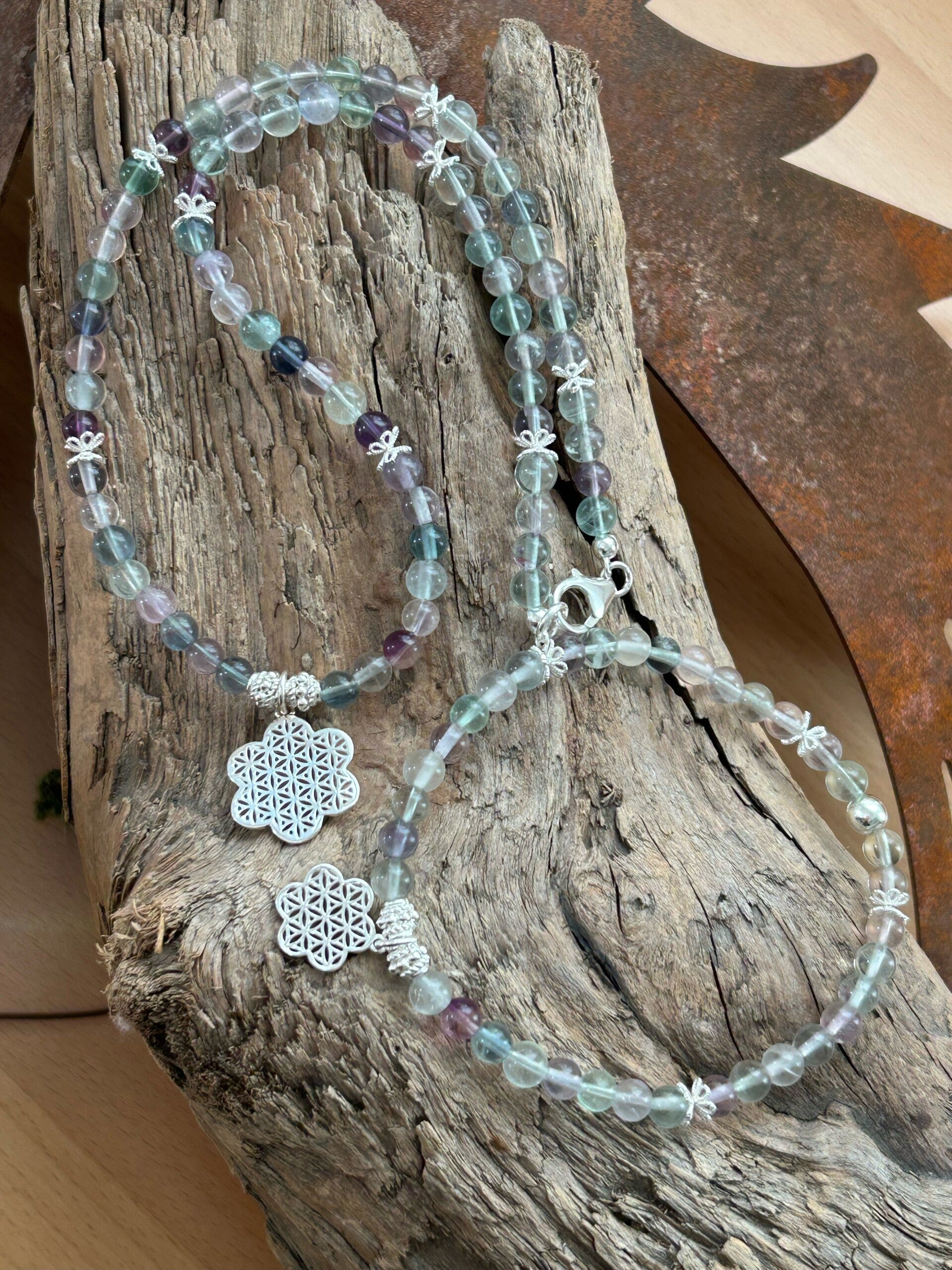 Halskette: 47cm; Silber 925 Anhänger gross "Lebensblume", Perlkappen und Elemente; Kugeln 6mm
