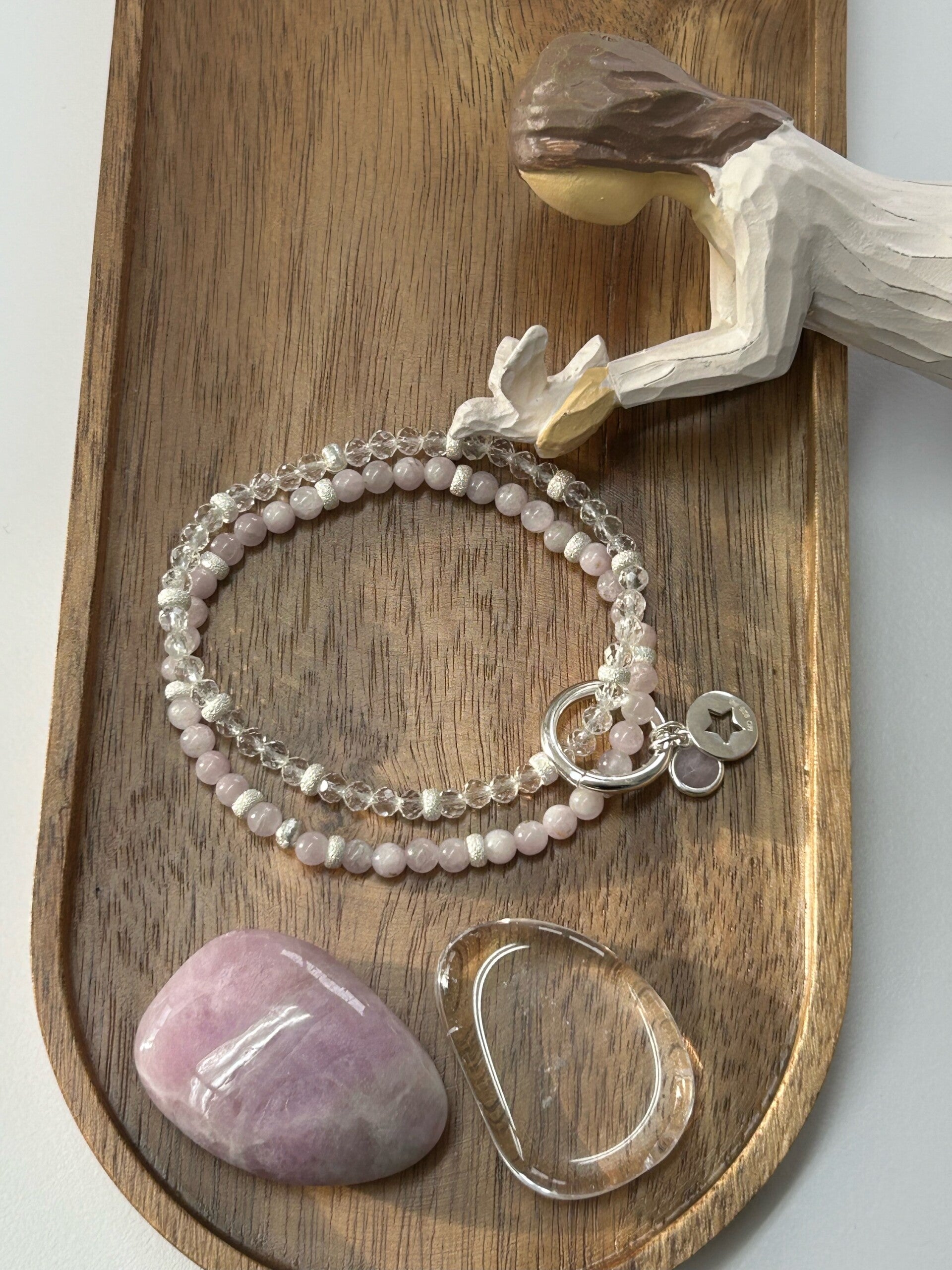 Kunzit: wirkt bei Muskelverhärtungen; vorbeugend gegen Thrombose; greift regulierend in die Schilddrüsentätigkeit ein; regt die Darmbewegung an; wirkt schützend auf die Blutversorgung und die Reizleitung des Herzens; stärkt das Einfühlungsvermögen, stärkt die Nerven bei grosser Belastung und ermöglicht es, schlagfertig und selbstbewusst zu handeln; begünstigt schöpferische Kreativität; hilft schwärmerische, selbstbezogene oder spirituelle Liebe frei auszudrücken
