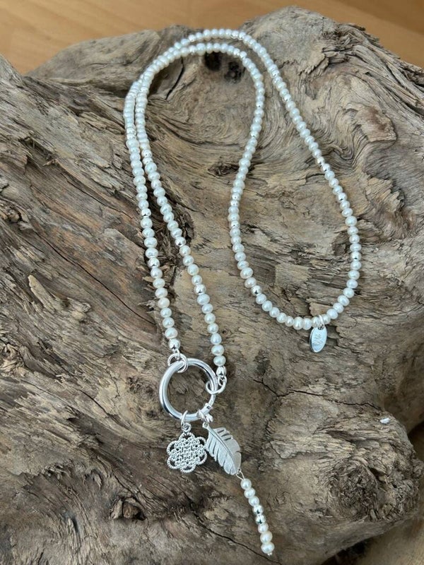 Länge auf dem Bild: ca. 72cm (Deine Wunschlänge in den Kommentar eintragen und entsprechende Preisklasse wählen!); Silber 925 Anhänger "Blume", Verbinder "Feder", Karabiner und Kügeli; Kugeln 4mm