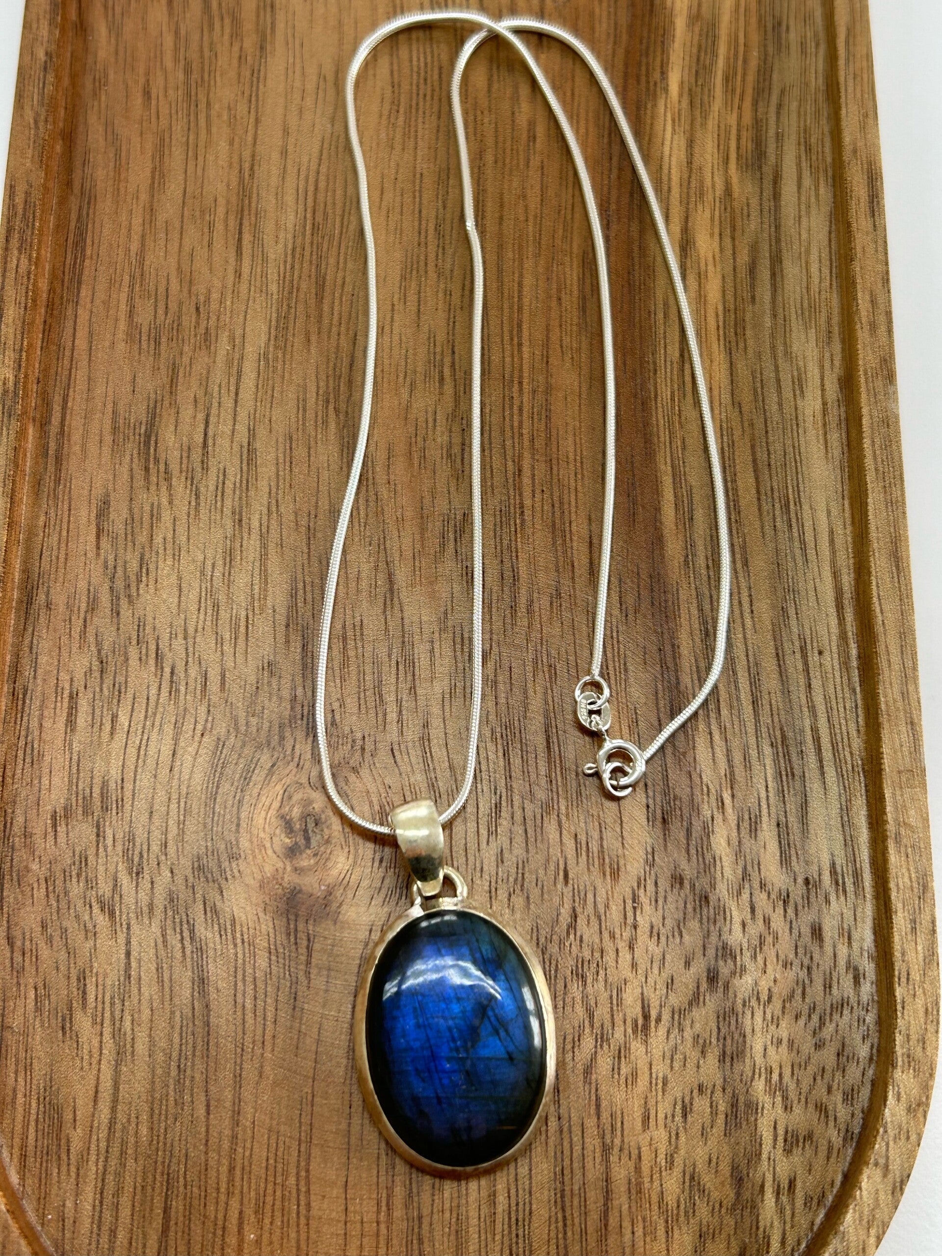 Länge: 45, 50 oder 60cm (bei Bestellung bitte Länge unter Bemerkungen vermerken!); Silber 925 Schlangenkette und Einfassung Anhänger; Anhänger Grösse 3 x 2.5 cm Labradorit