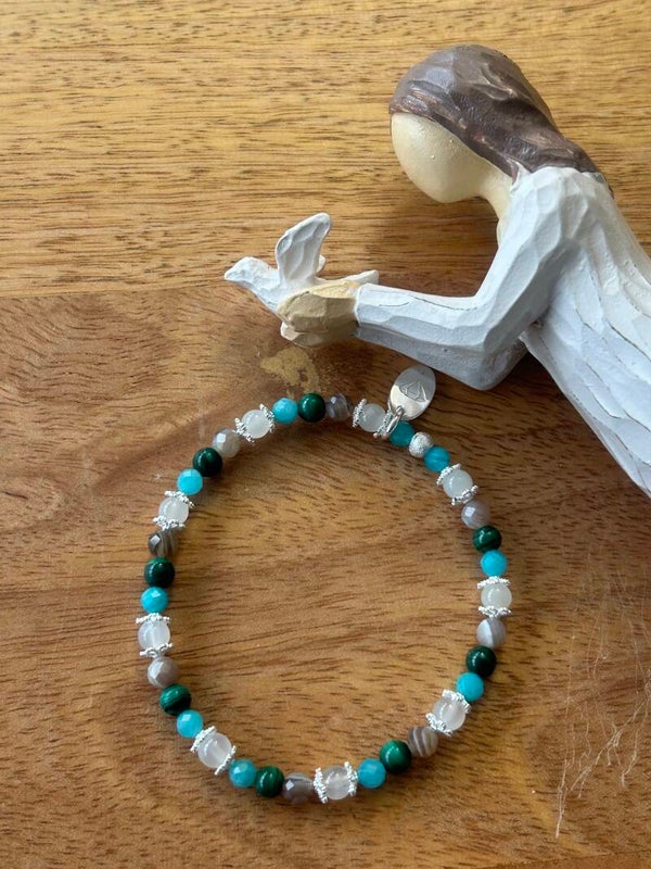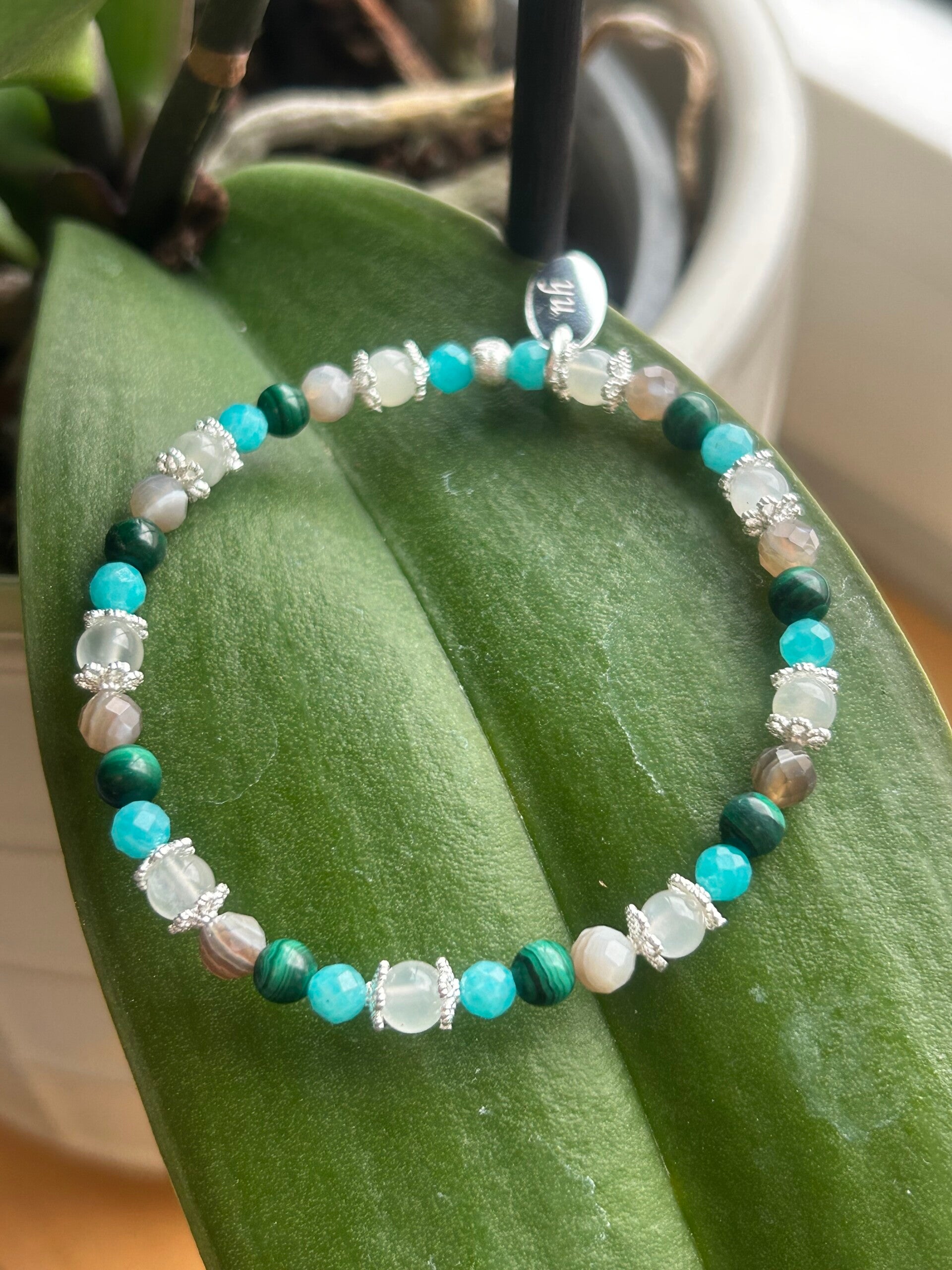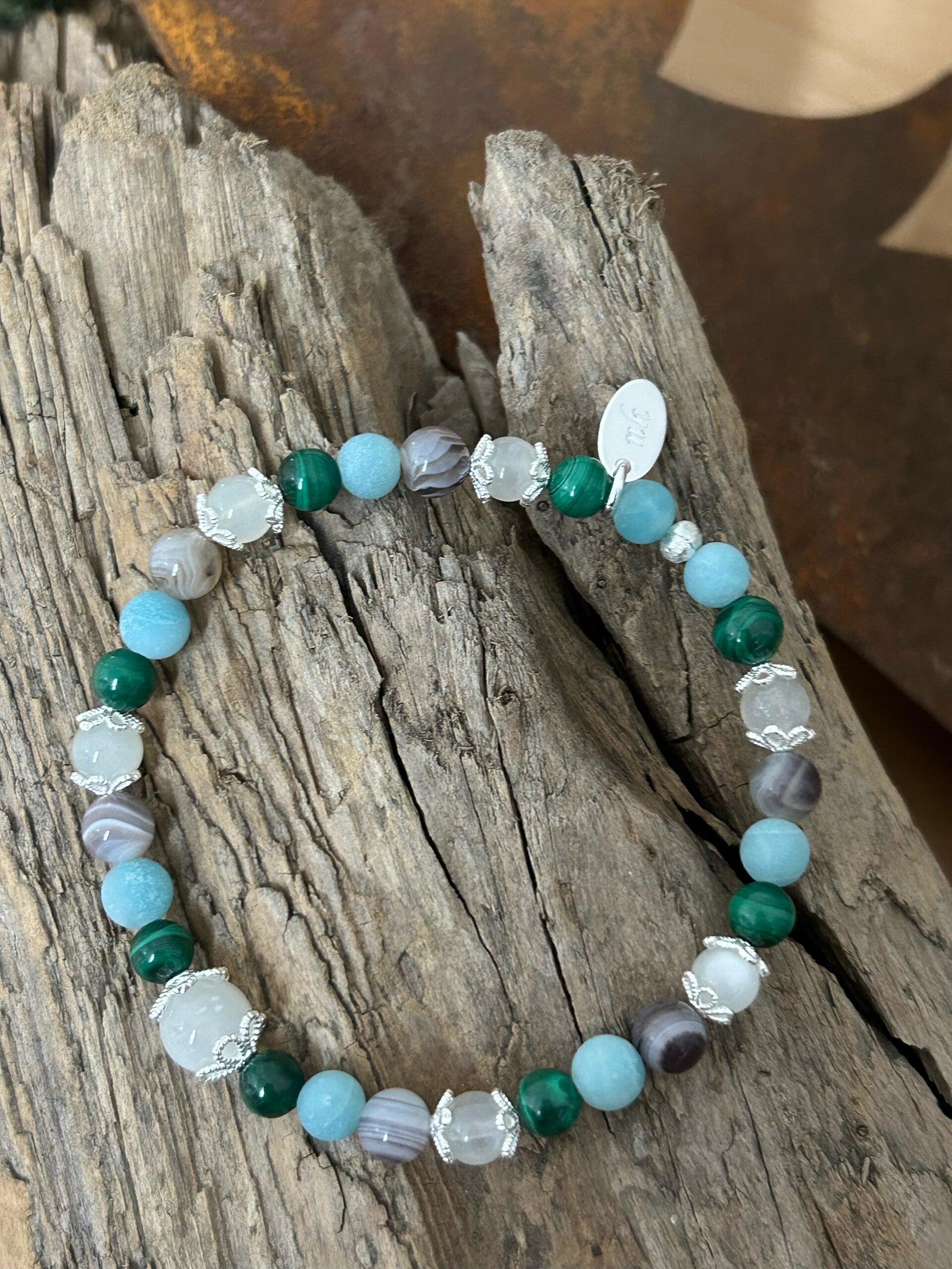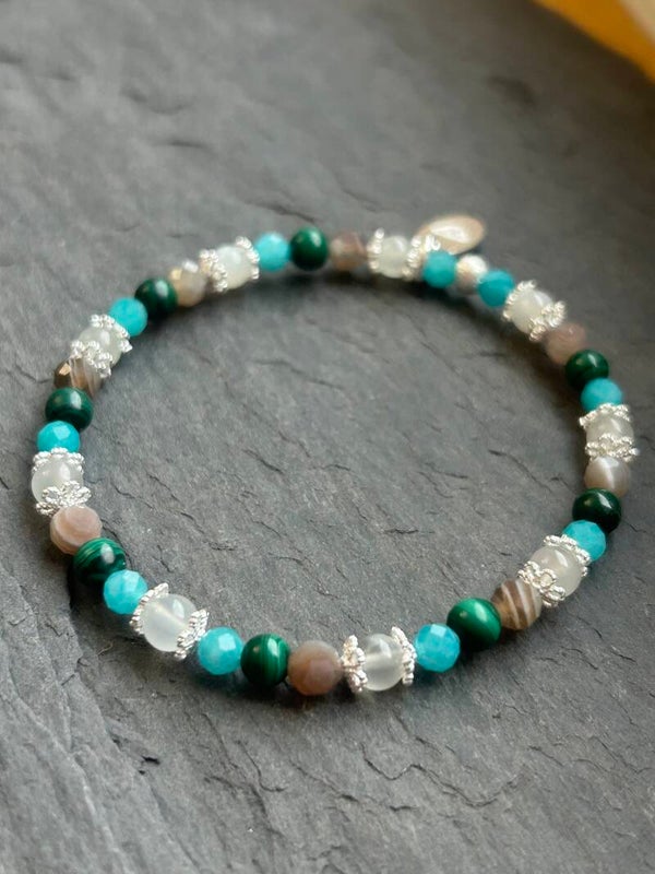Heilsteine (Link zu Beschreibung und Wirkung): Achat Botswana, Amazonit, Malachit, Mondstein weiss