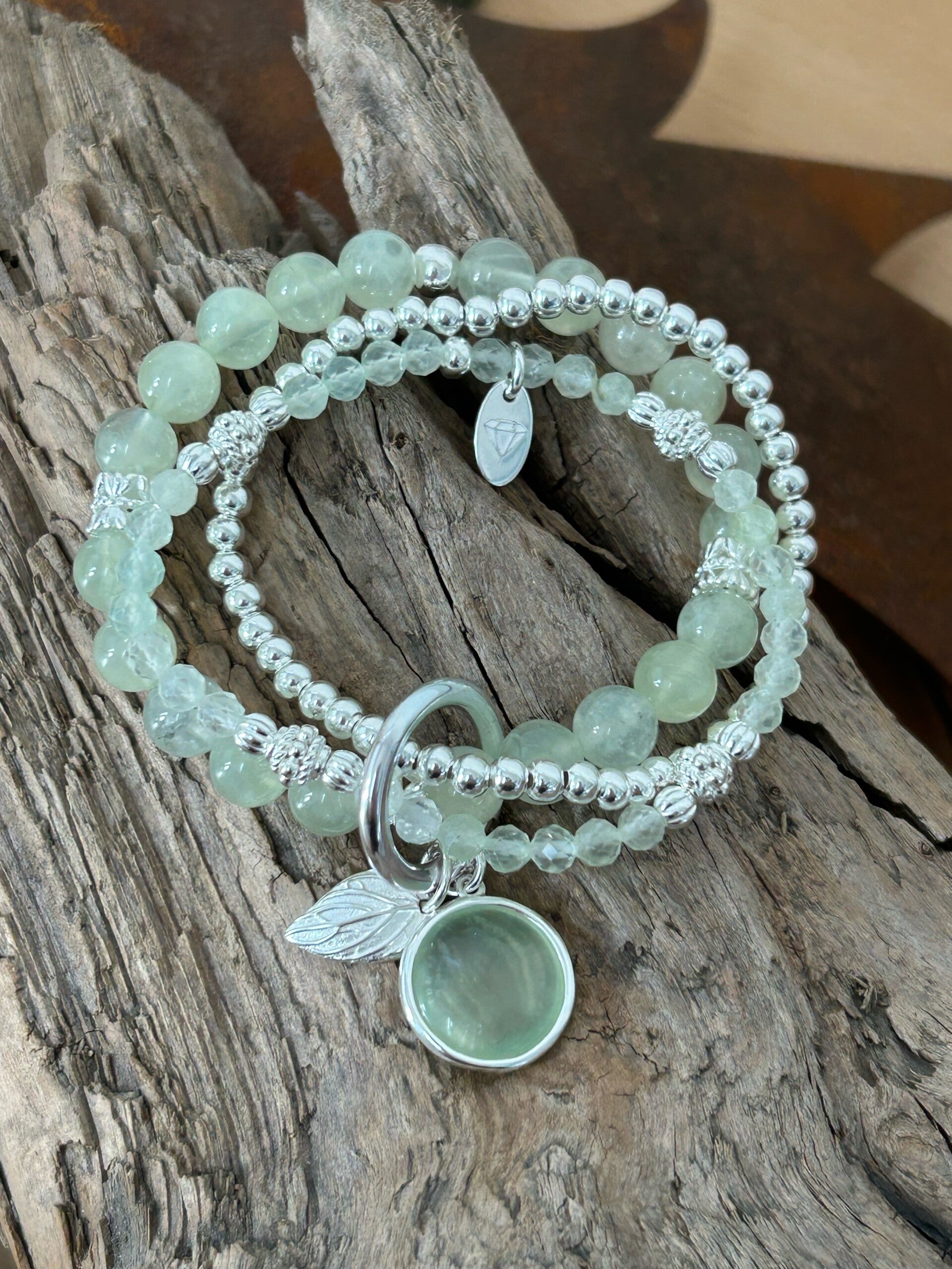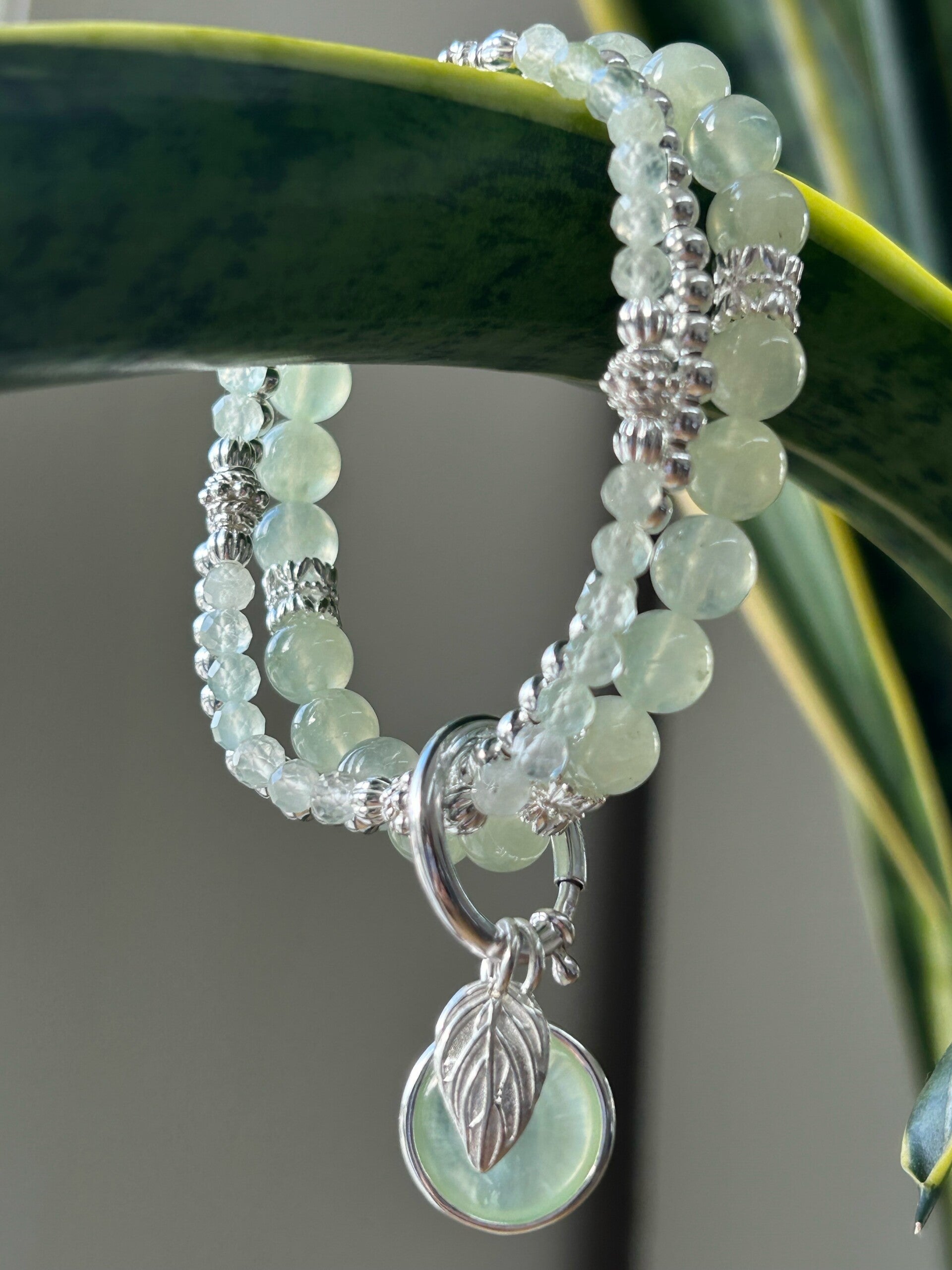 Hinweis: mit Stretch-Band; Silber 925 Fassung, Anhänger "Blatt", Karabiner, Kügeli und Elemente; Kugeln 8mm und 4mm facettiert; Stein-Anhänger 16mm Durchmesser