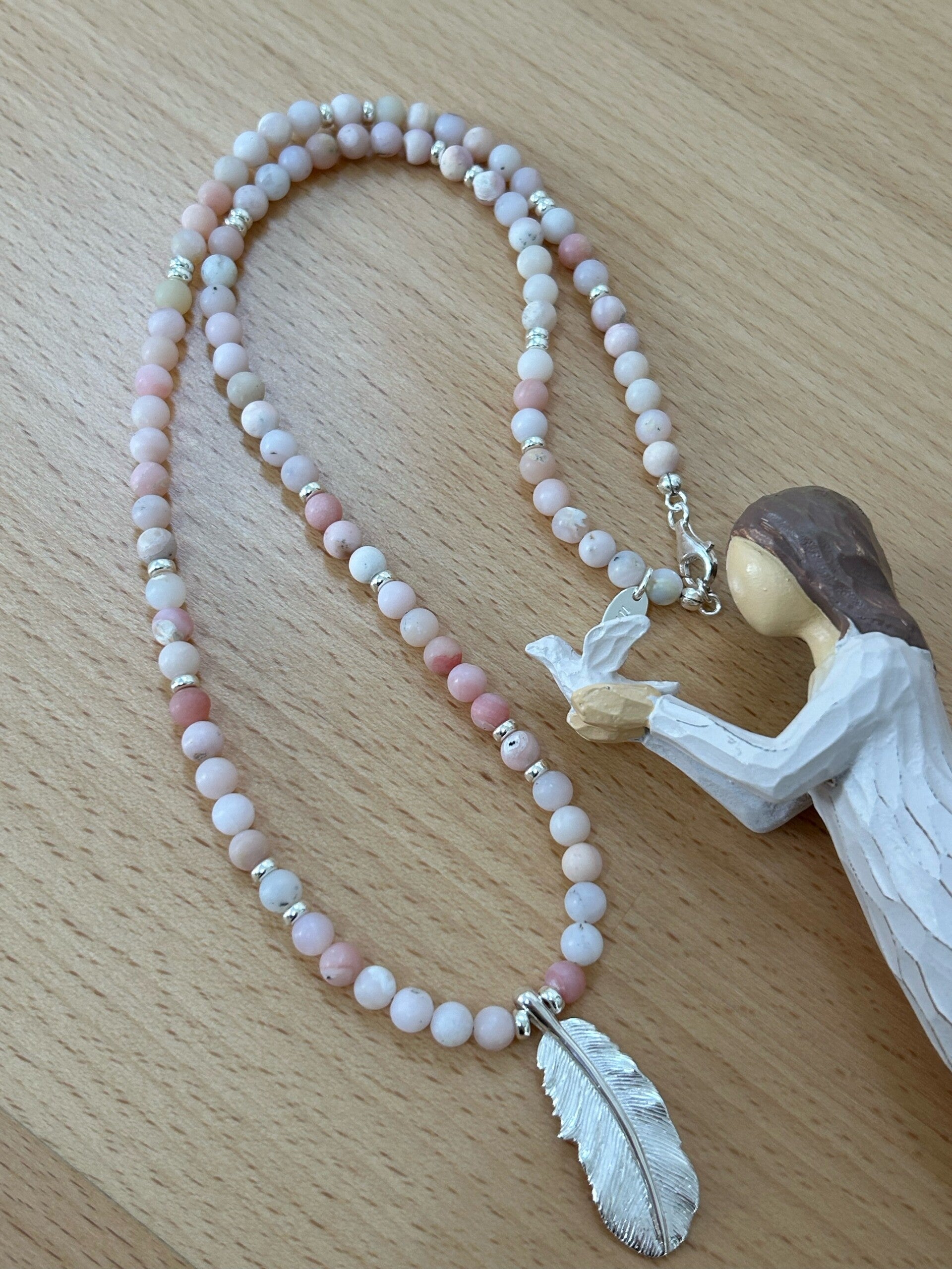 Länge auf dem Bild: 63cm (Deine genaue Wunschlänge in den Kommentar eintragen und entsprechende Preisklasse wählen!); Silber 925 Anhänger "Feder" (40x14mm) und Elemente; Kugeln 6mm matt