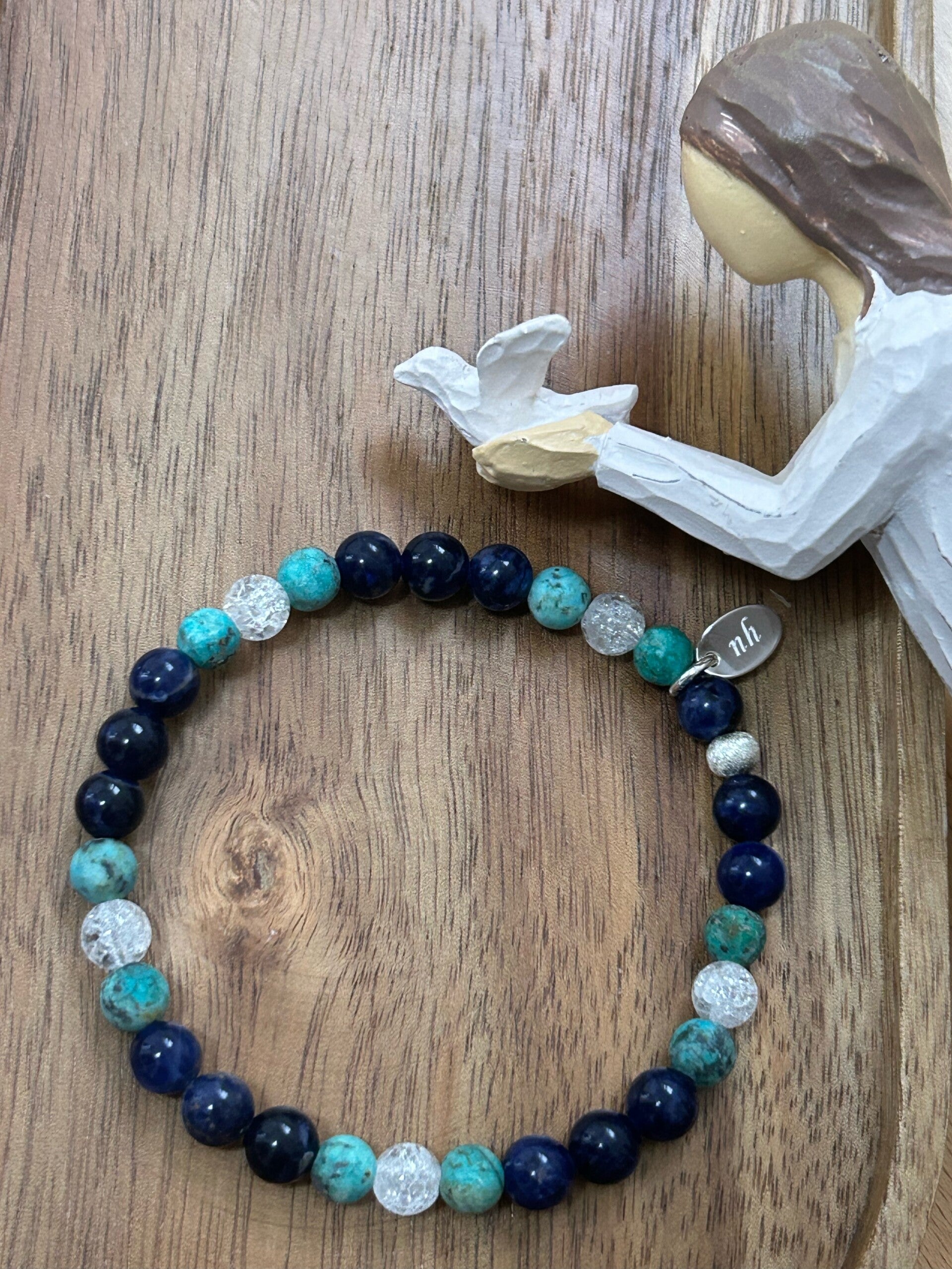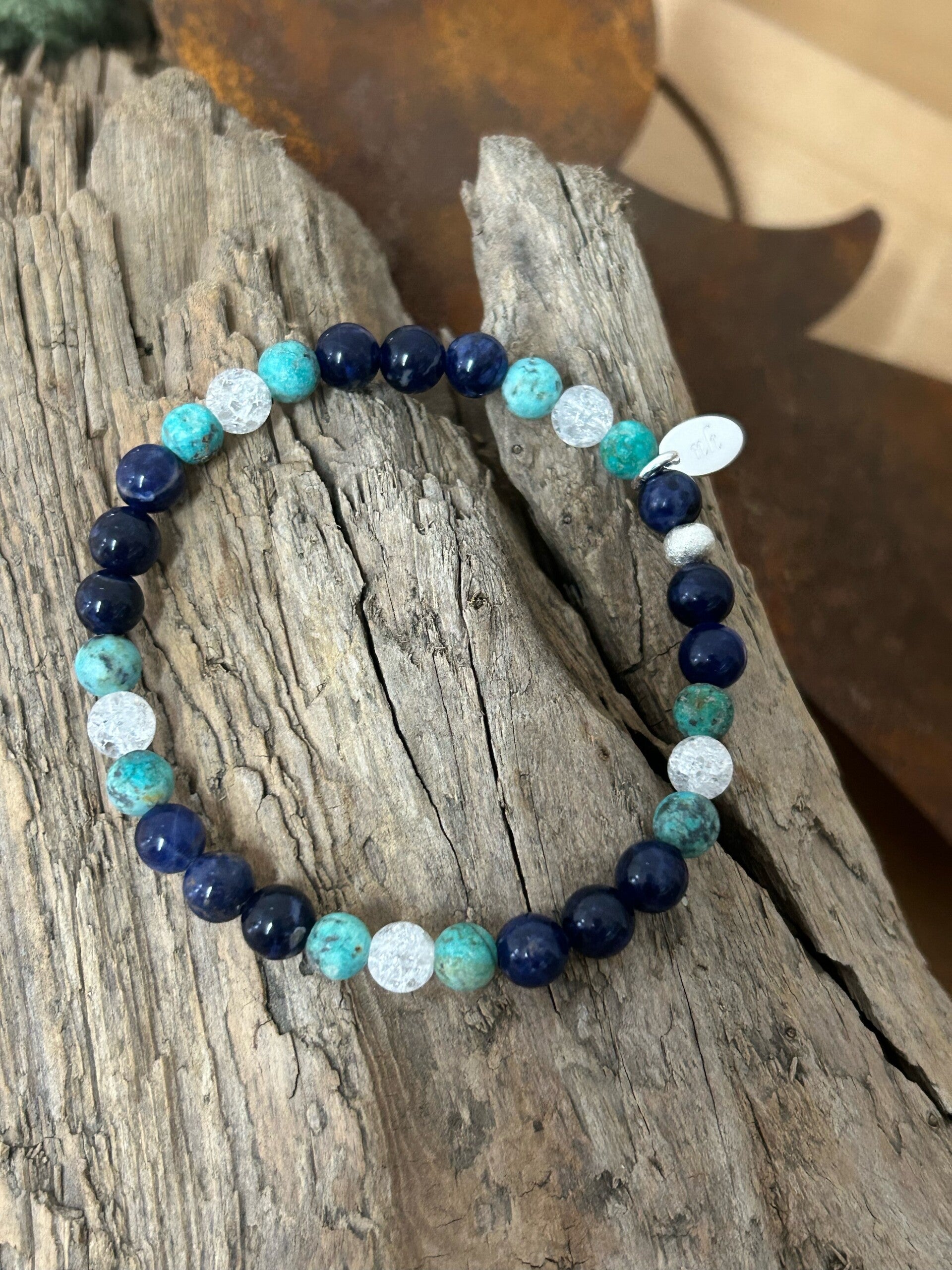 Heilsteine (Link zu Beschreibung und Wirkung): Bergkristall Iris, Sodalith (blau), Türkis Afrika