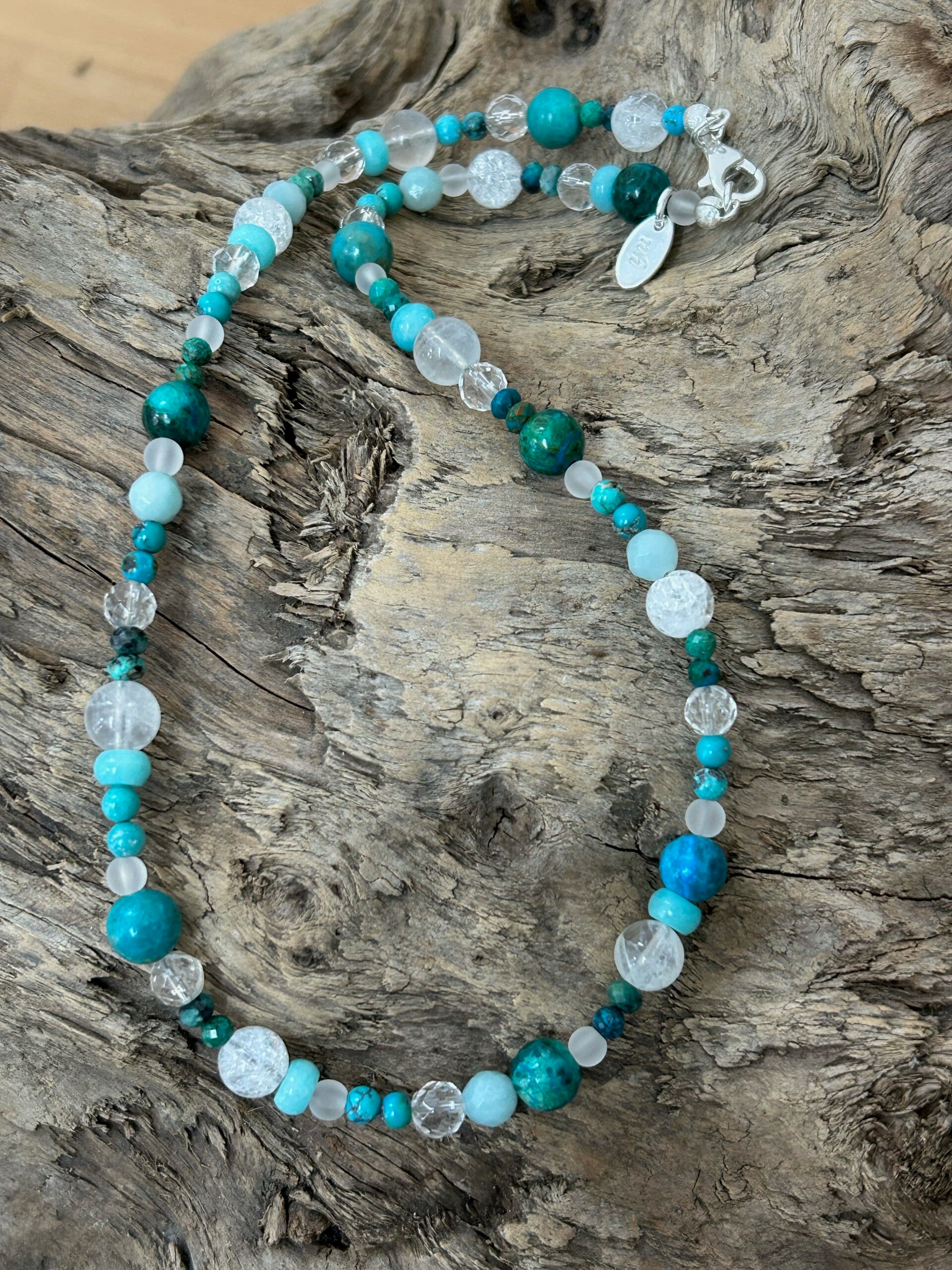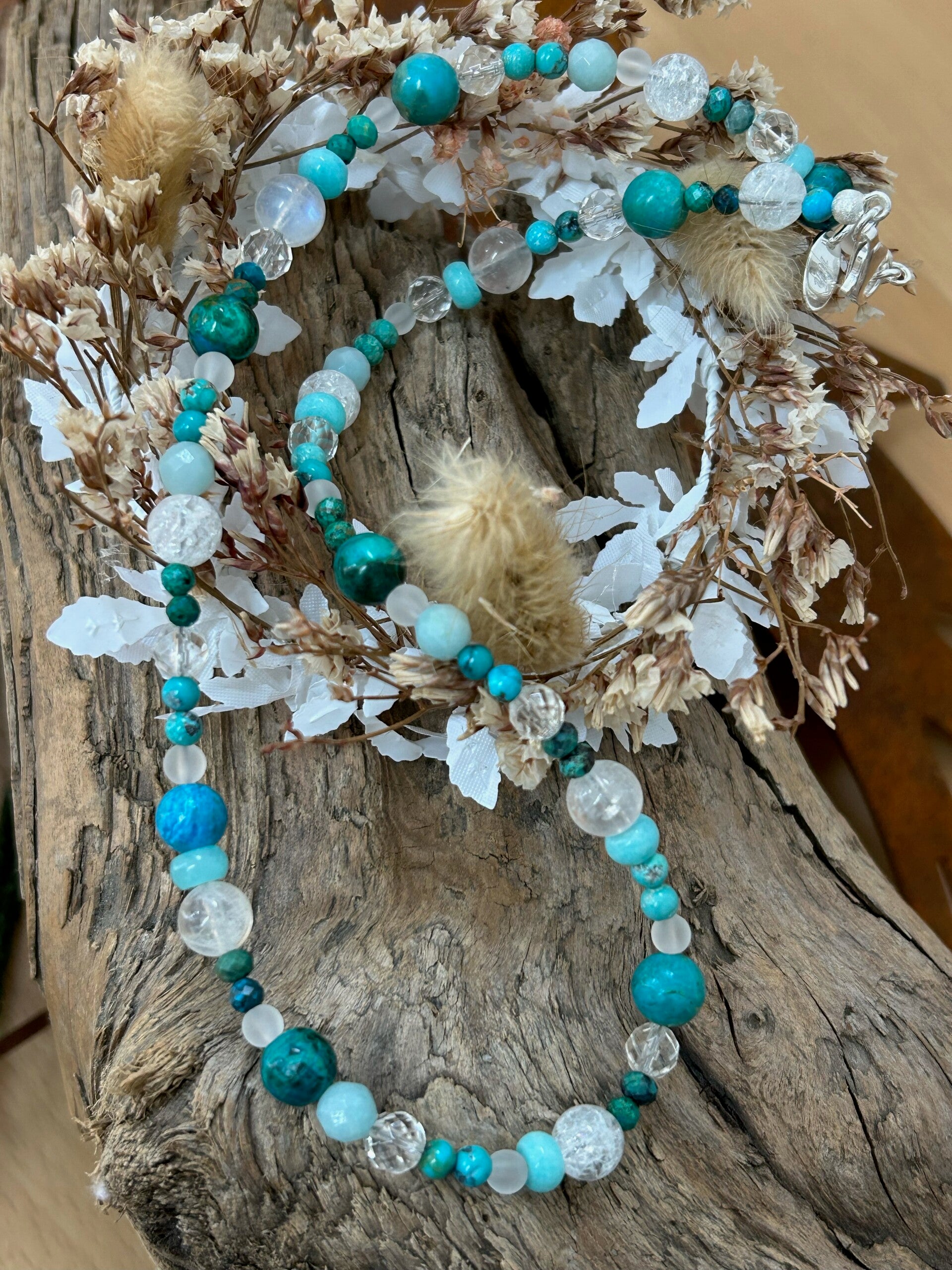 Chrysokoll: wirkt entkrampfend bei Menstruationsbeschwerden; wirkt blutdrucksenkend bei erhöhtem Blutdruck; entzündungshemmend sowie fiebersenkend bei Infektionen der oberen Atemwege; beruhigt Magen und Darmtrakt; regeneriert gestörtes Narbengewebe; hilft einen kühlen Kopf zu bewahren; nimmt Angst und Schuldgefühle; bringt Gefühle ins Gleichgewicht