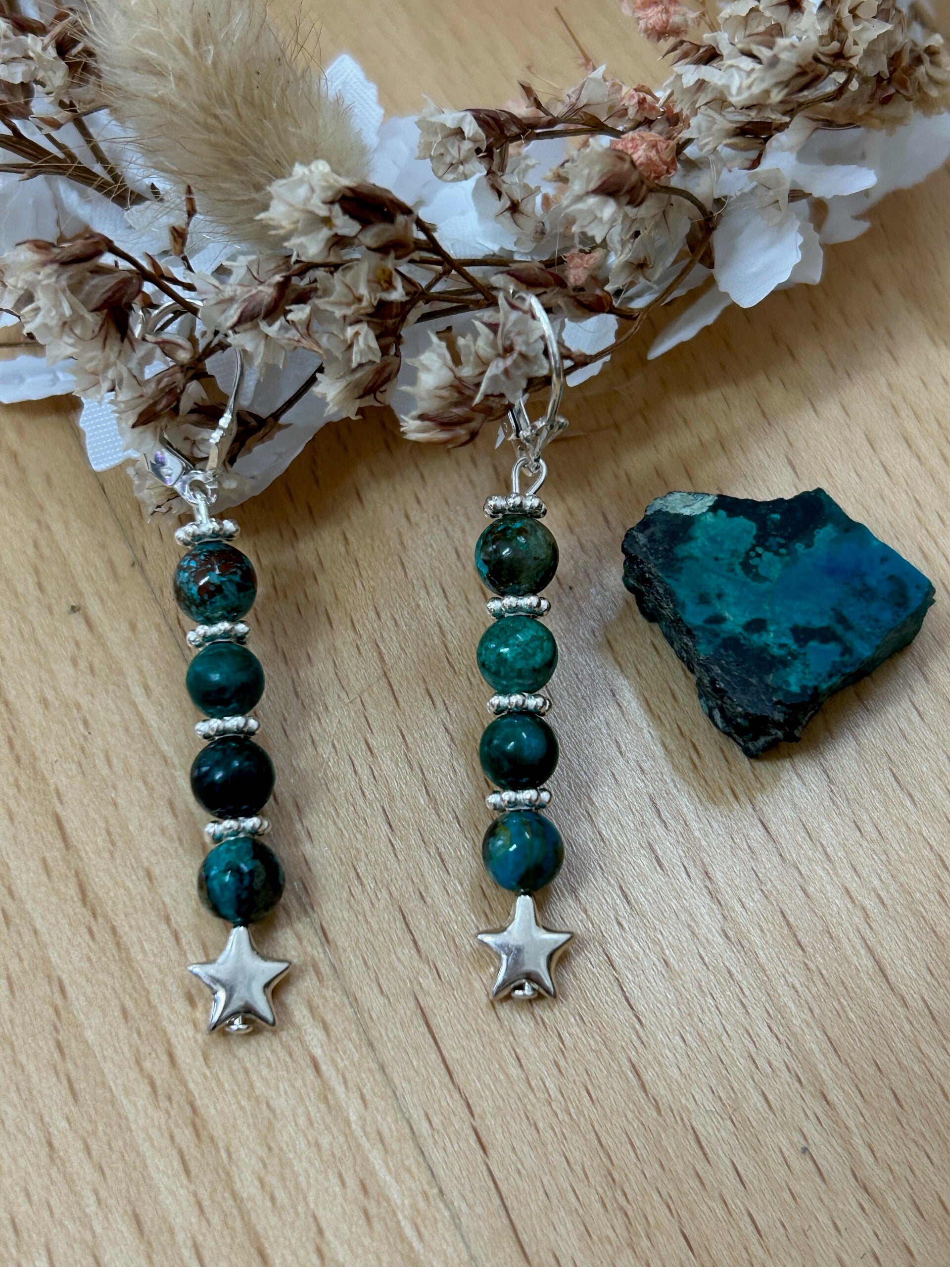Chrysokoll: wirkt entkrampfend bei Menstruationsbeschwerden; wirkt blutdrucksenkend bei erhöhtem Blutdruck; entzündungshemmend sowie fiebersenkend bei Infektionen der oberen Atemwege; beruhigt Magen und Darmtrakt; regeneriert gestörtes Narbengewebe; hilft einen kühlen Kopf zu bewahren; nimmt Angst und Schuldgefühle; bringt Gefühle ins Gleichgewicht