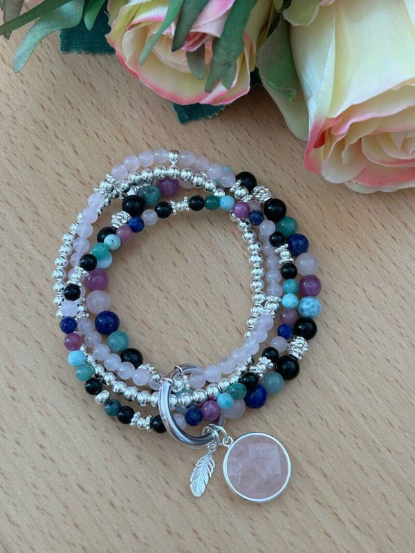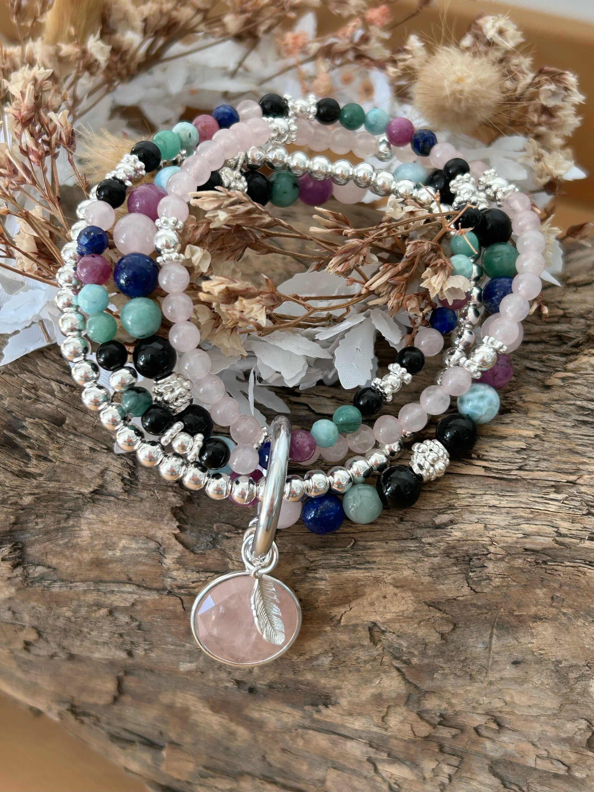 Hinweis: mit Stretch-Band; Silber 925 Anhänger "Feder", Karabiner-Ring, Einfassung Anhänger Rosenquarz facettiert, Elemente und Kügeli; Kugeln 4 und 6mm, facettierte Kugeln 4mm