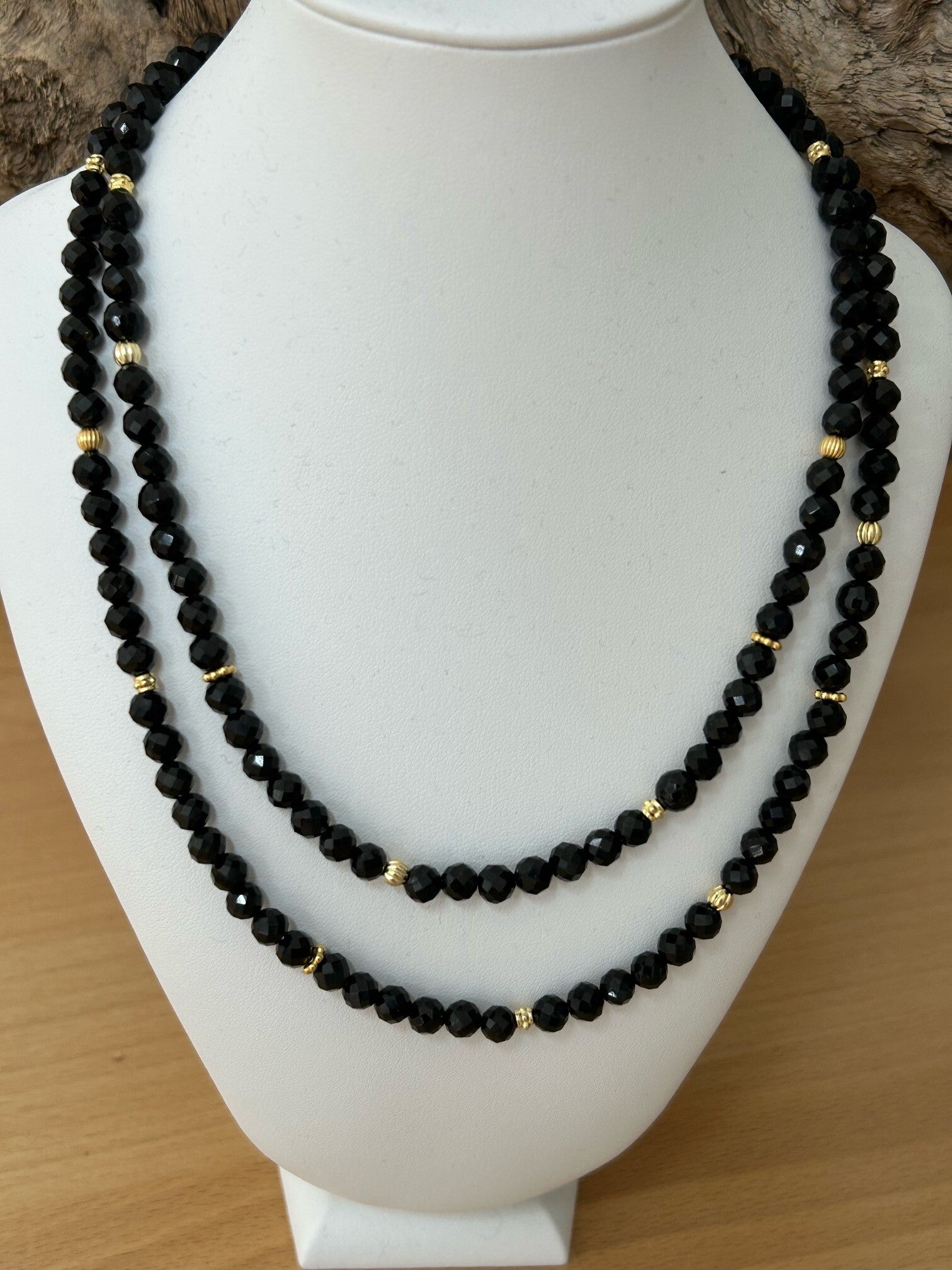 Länge: 89cm (die Halskette kann als lange Kette oder doppelt getragen als kurze Kette getragen werden -> siehe Fotos); Silber 925 vergoldete Elemente; Kugeln 6mm facettiert