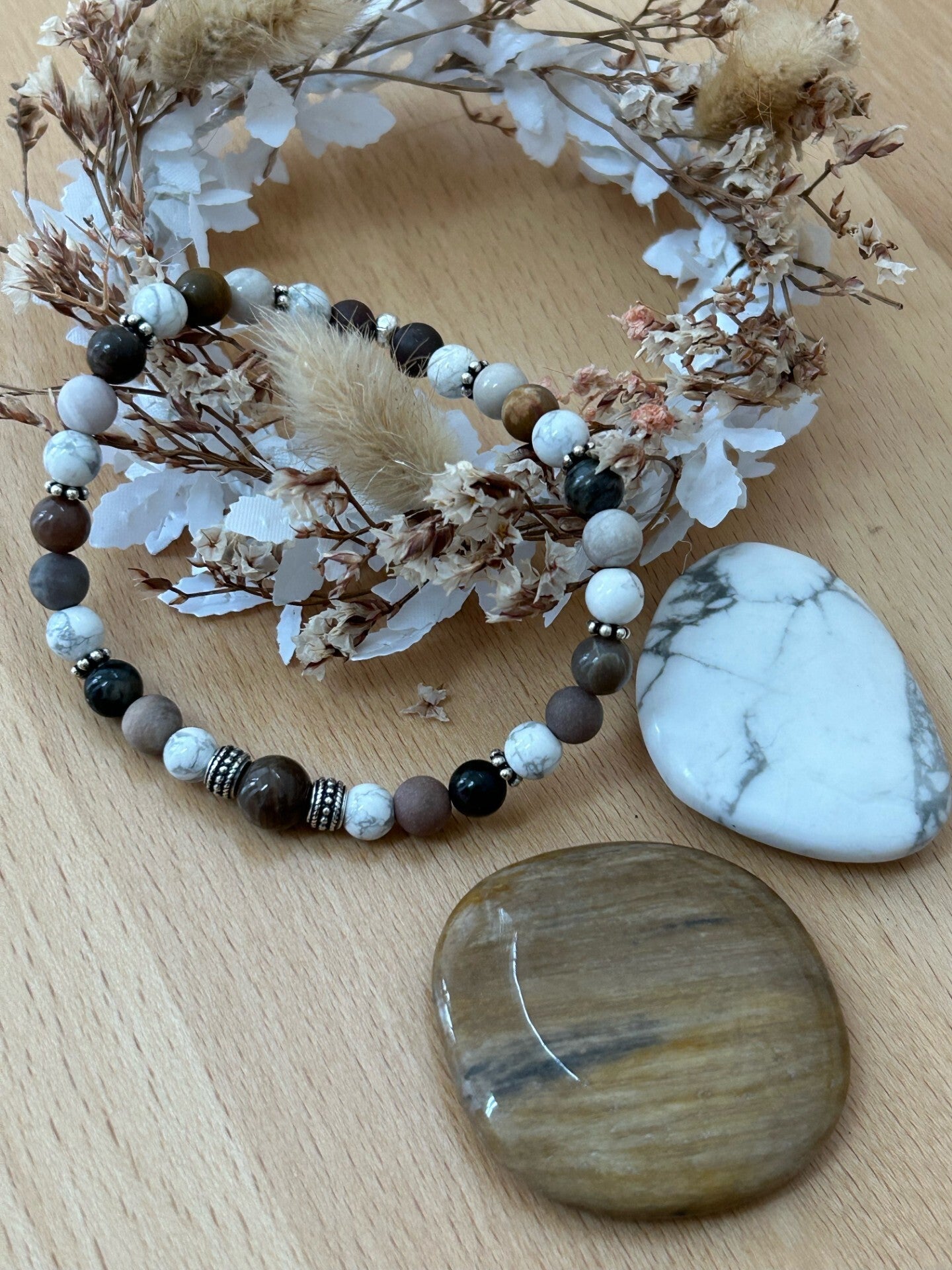 Howlith: kann entschlackend wirken, eine Diät unterstützen und regt die Entgiftung des Körpers an; gleicht den Säurehaushalt aus und kann Linderung bei Sodbrennen und Gallenkolik verschaffen; stärkt Knochen, Gelenke, Nägel, Zähne und Haare; kann Kopfschmerzen und Migräne lindern und den Gleichgewichtssinn verbessern; ist sehr erdend; bewahrt vor unüberlegten Gefühlsausbrüchen; wirkt entspannend und lässt einem gelassener fühlen, da er negative und schädliche Energien ableitet; verleiht einen tiefen und ruhigen Schlaf ohne schlechte Träume