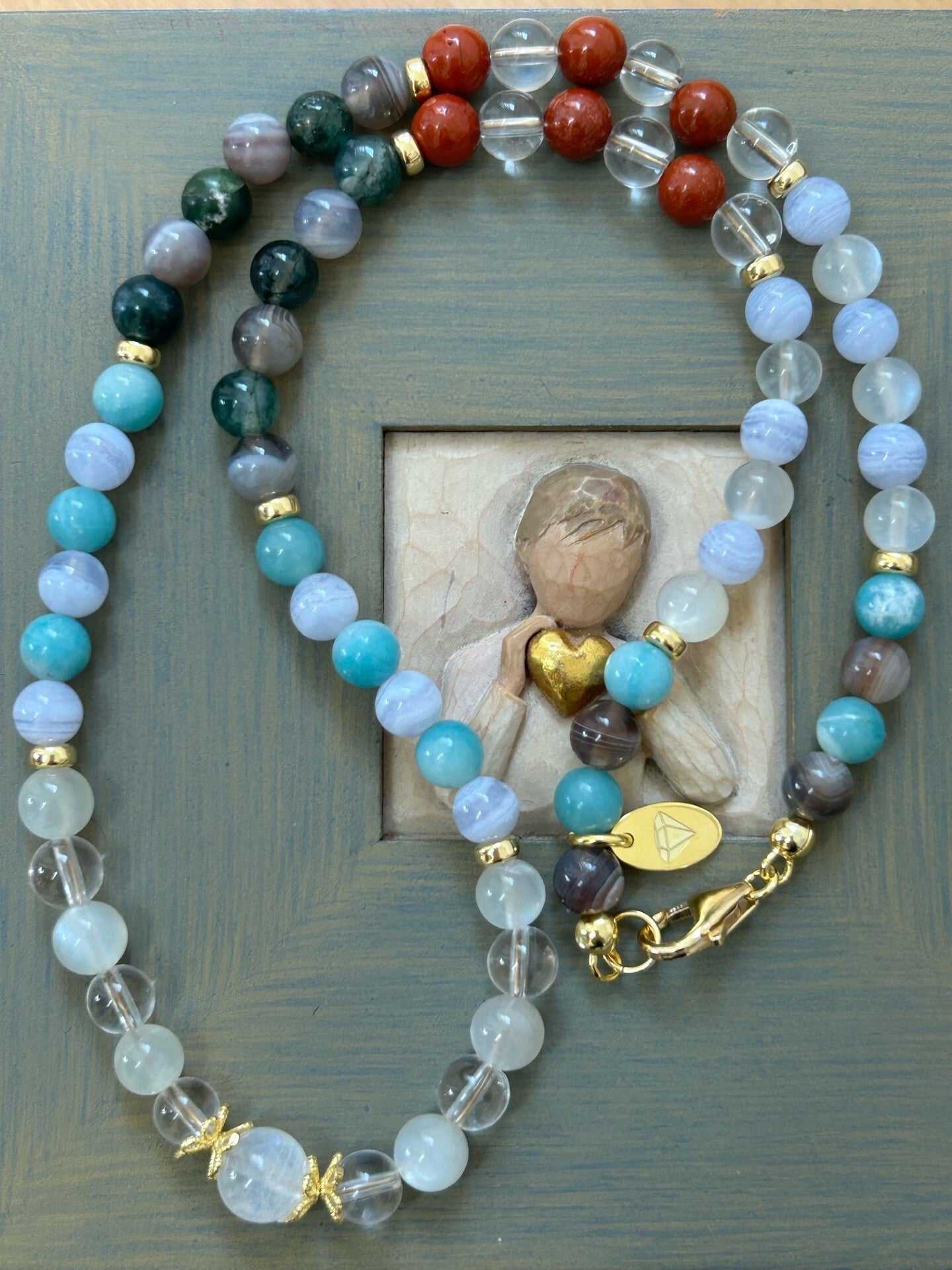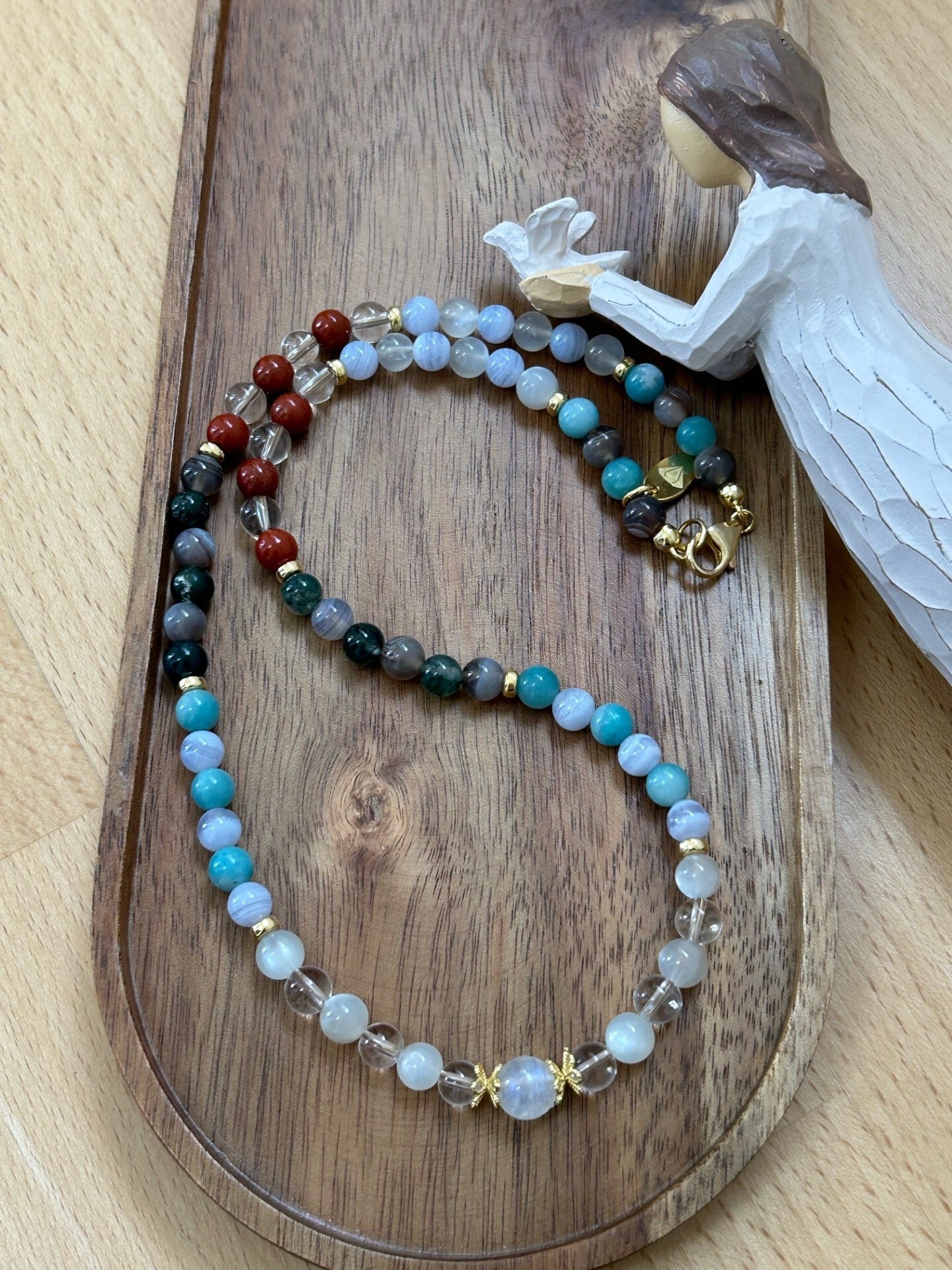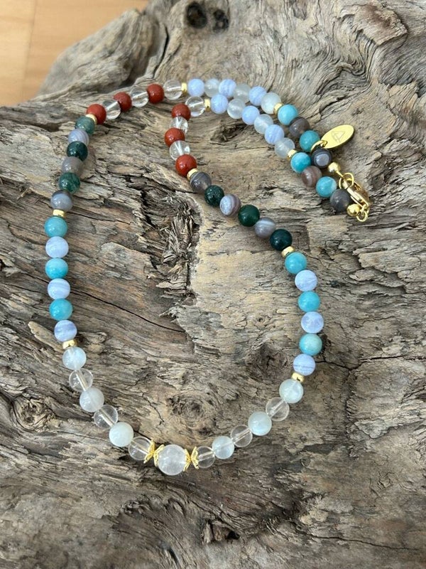 Chalcedon blau: wirkt gegen Lymphdrüsenschwellungen; lässt allergische Reaktionen schneller abklingen; löst allgemeine Anspannungen; wirkt auf Gesichtssinne, Hals, Stimme, Lunge, Magen, Bauchspeicheldrüse; gibt Selbstsicherheit, Gelassenheit, Leichtigkeit