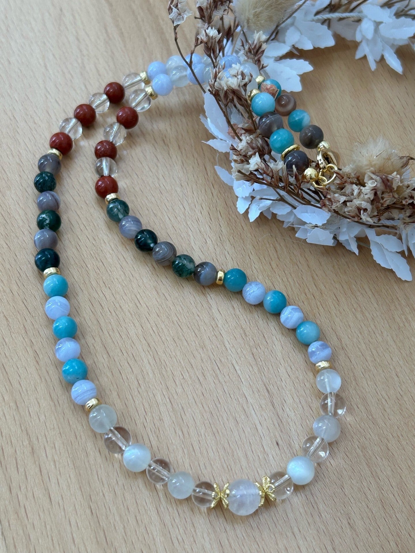 Länge auf diesem Bild: 48cm (Deine genaue Wunschlänge in den Kommentar eintragen und die entsprechende Preisklasse wählen); Silber 925 vergoldete Perlkappen und Elemente; Kugeln 6mm und 1 Kugel 8mm