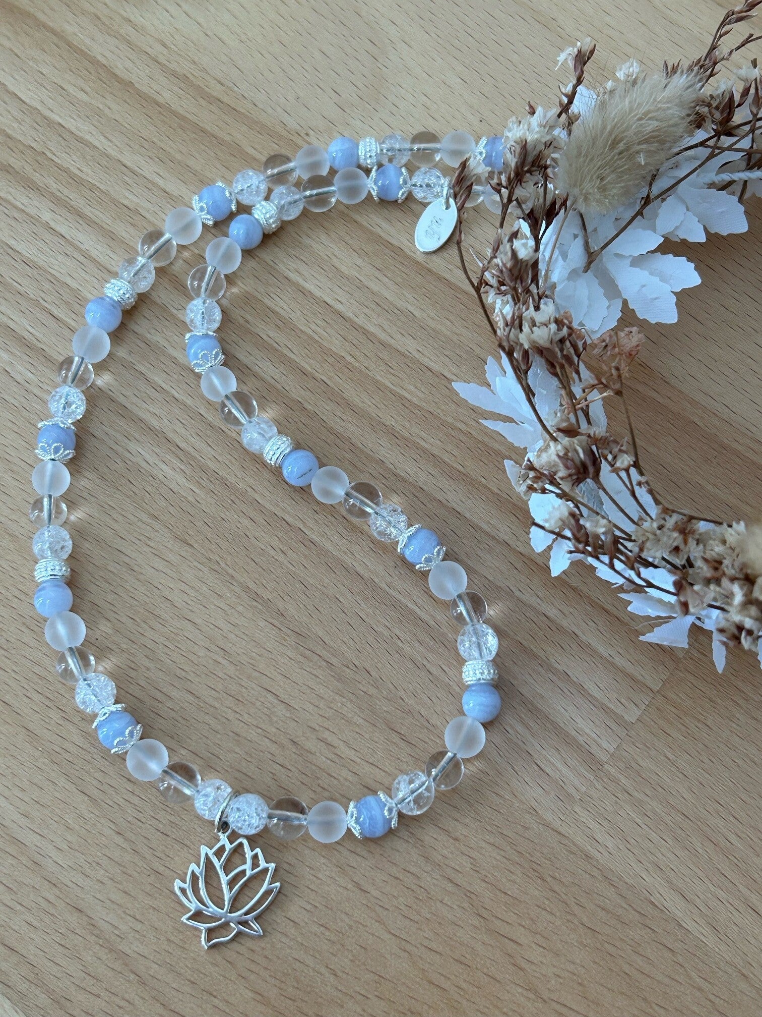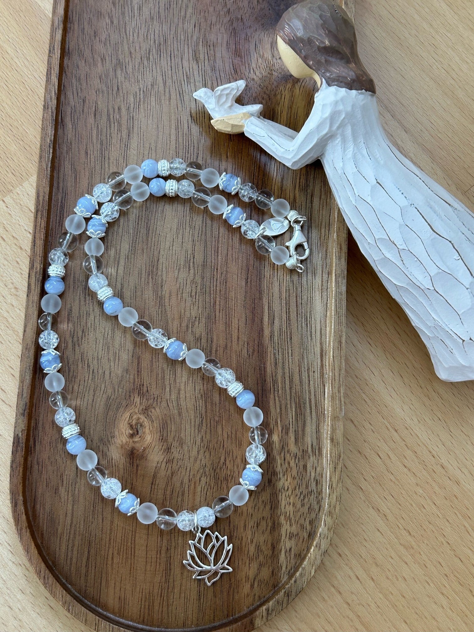 Länge auf diesem Bild: 43cm (Deine genaue Wunschlänge in den Kommentar eintragen und die entsprechende Preisklasse wählen); Silber 925 Anhänger "Lotusblume", Perlkappen, Elemente und Verschluss; Kugeln 6mm