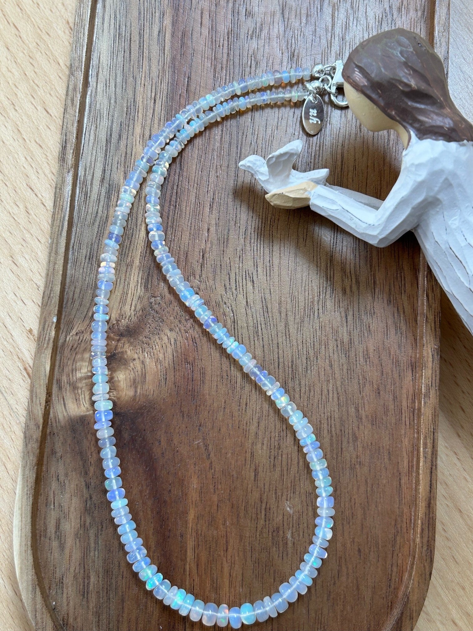 Länge: ca. 41-42cm; Silber 925 vergoldeter, respektive Silber 925 Verschluss; Rondellen-Verlauf 3.5-5.5mm; Edelopal weiss