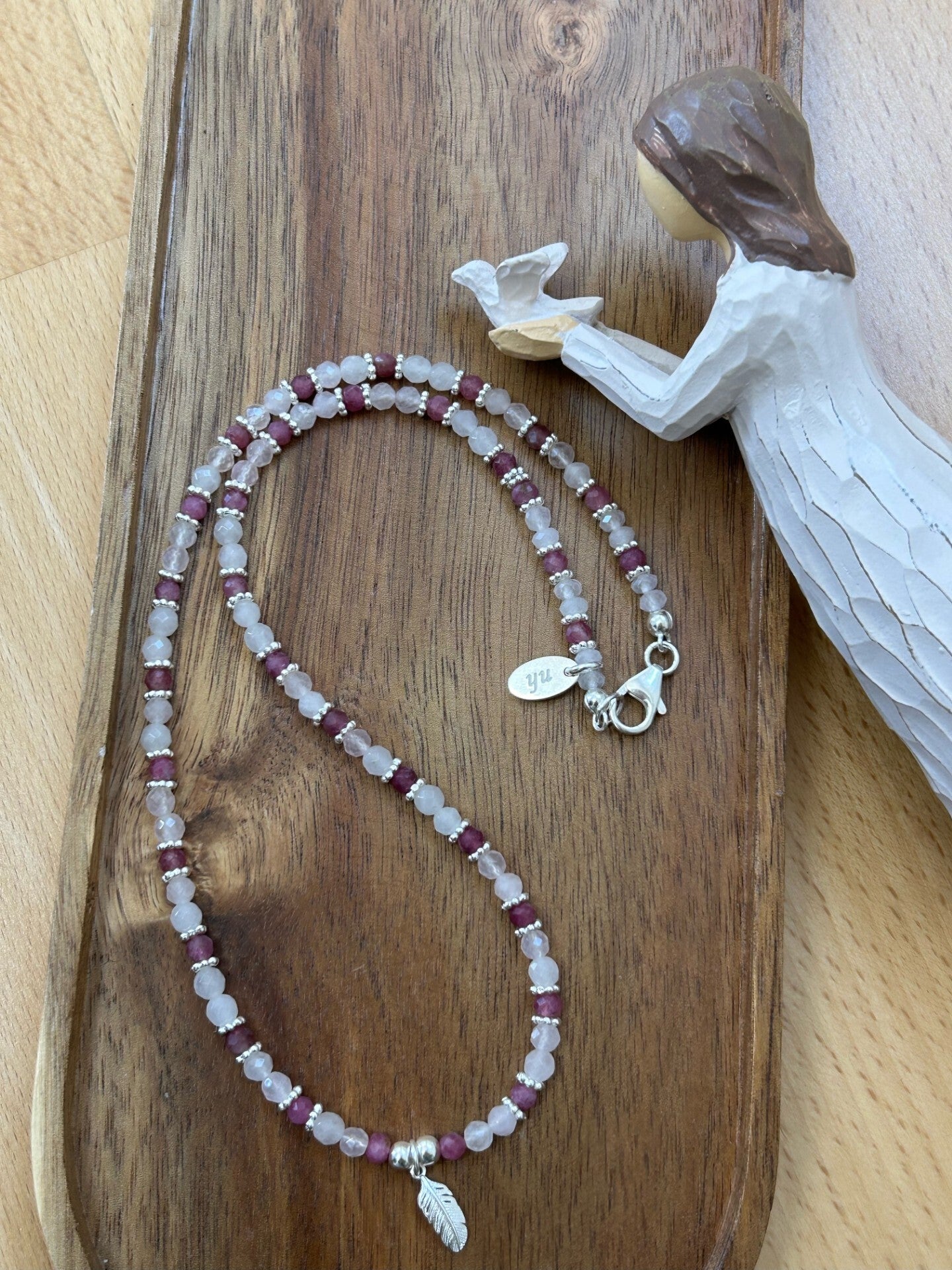 Länge auf diesem Bild: 46cm (Bitte genaue Wunschlänge in den Kommentar eintragen und die entsprechende Preisklasse wählen); Silber 925 Anhänger "Feder", Elemente und Verschluss; Kugeln 4mm facettiert