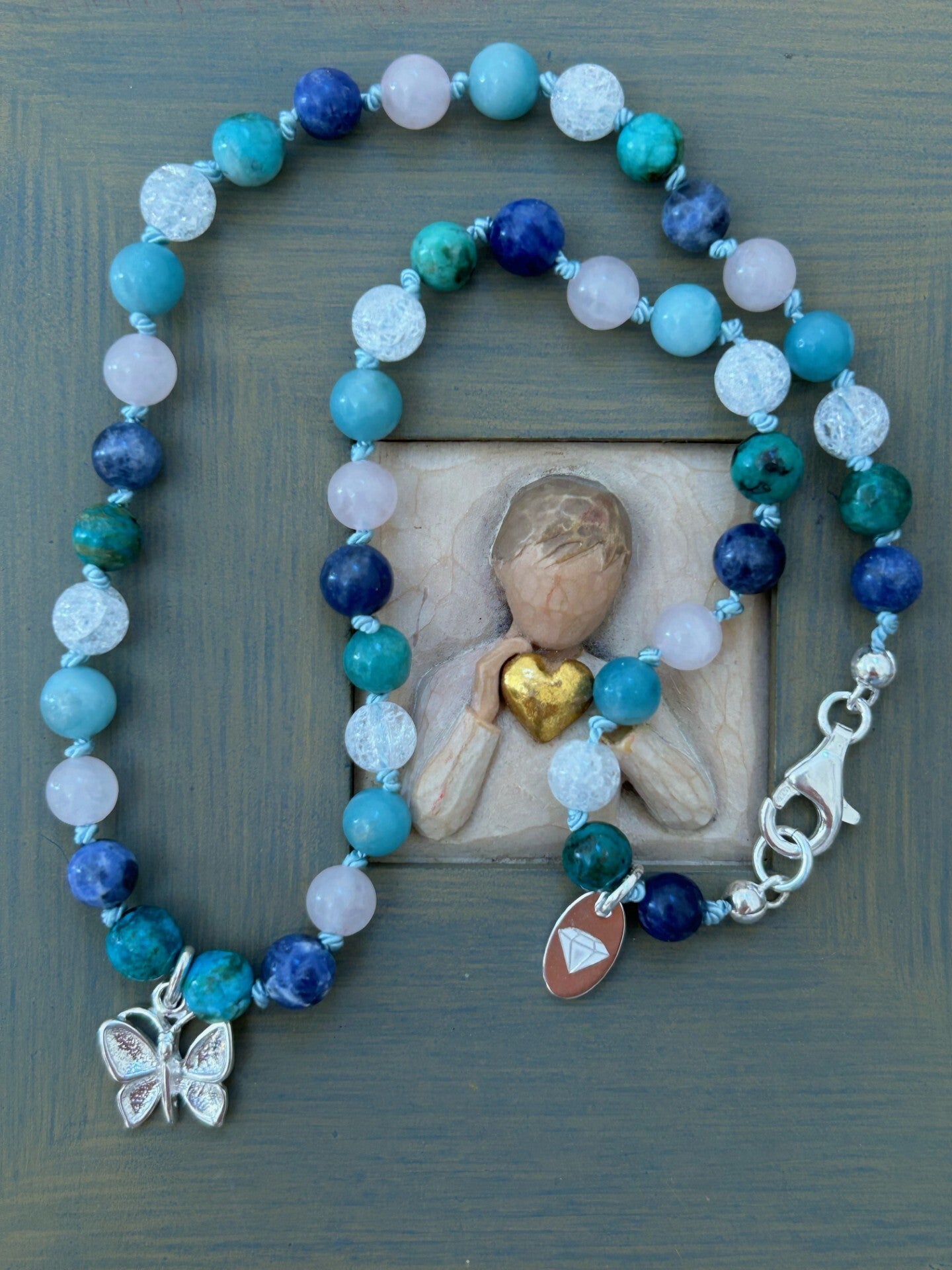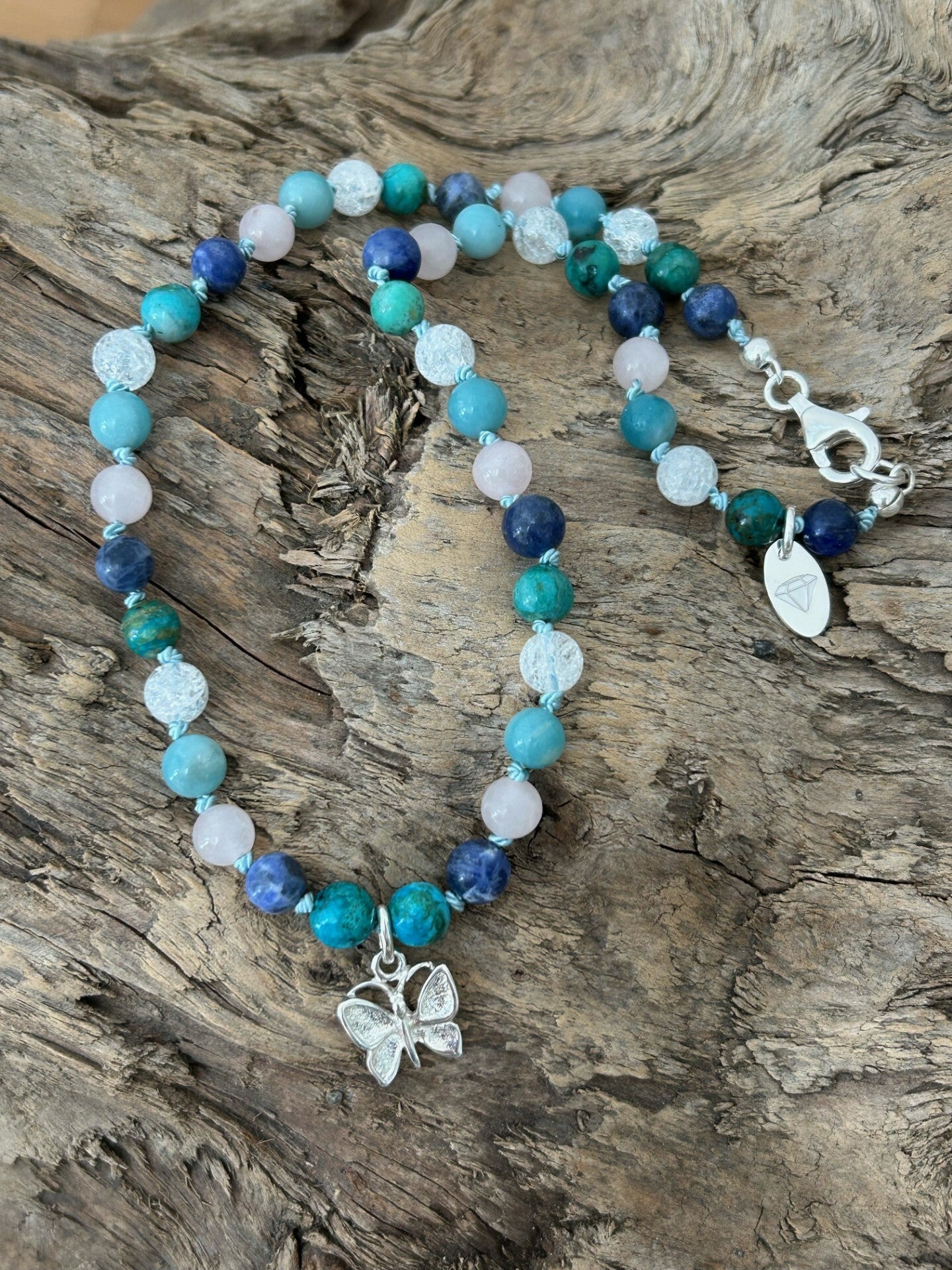 Länge auf dem Bild: 38cm (Deine Wunschlänge in den Kommentar eintragen und entsprechende Preisklasse wählen!); Silber 925 Anhänger "Schmetterling" und Verschluss; Kugeln einzeln geknotet; Kugeln 6mm