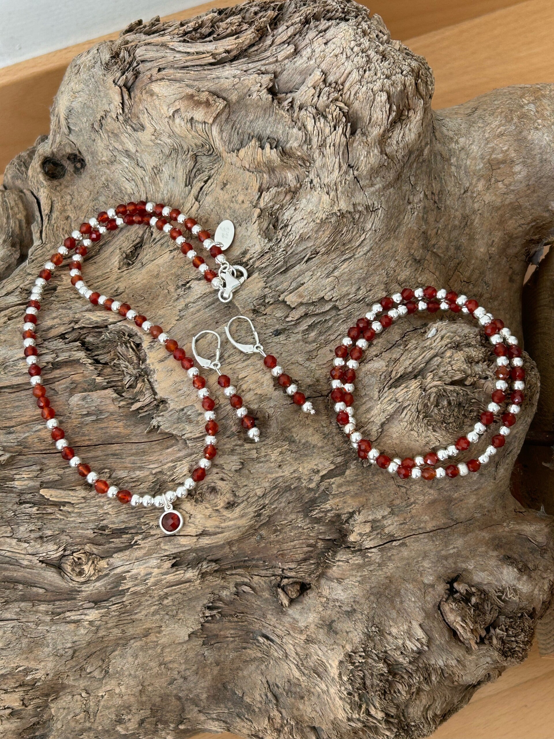 Halskette: Länge auf diesem Bild: 42cm (Deine genaue Wunschlänge in den Kommentar eintragen und die entsprechende Preisklasse wählen); Silber 925 Kügeli und Verschluss; Anhänger rund 8mm facettiert (Granat), Kugeln 4mm facettiert (Karneol)