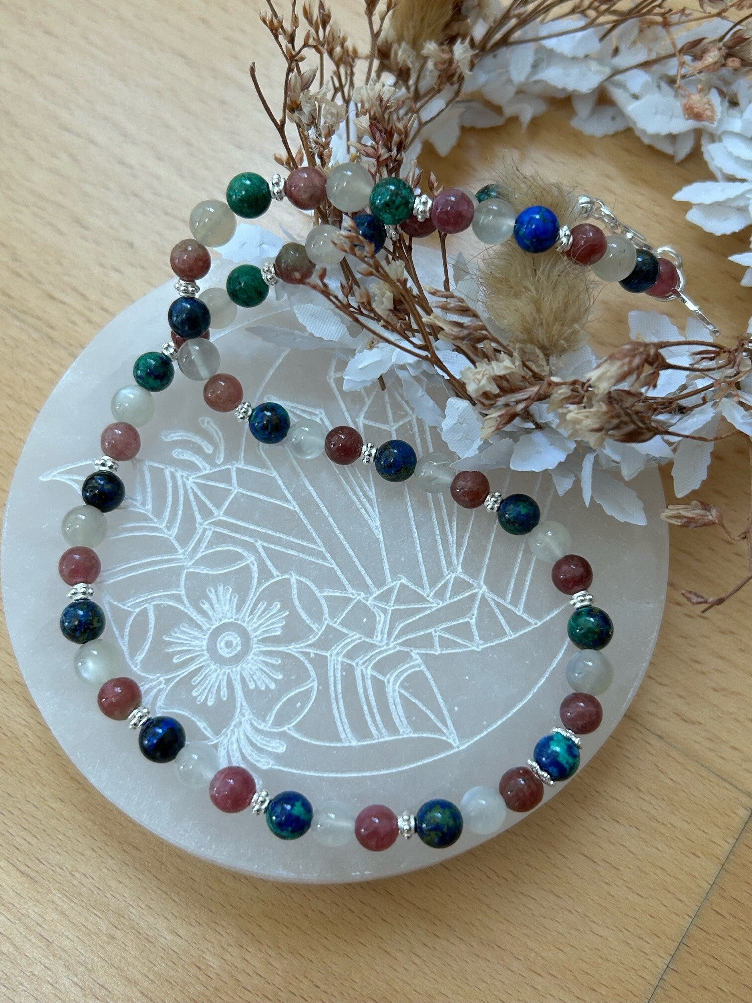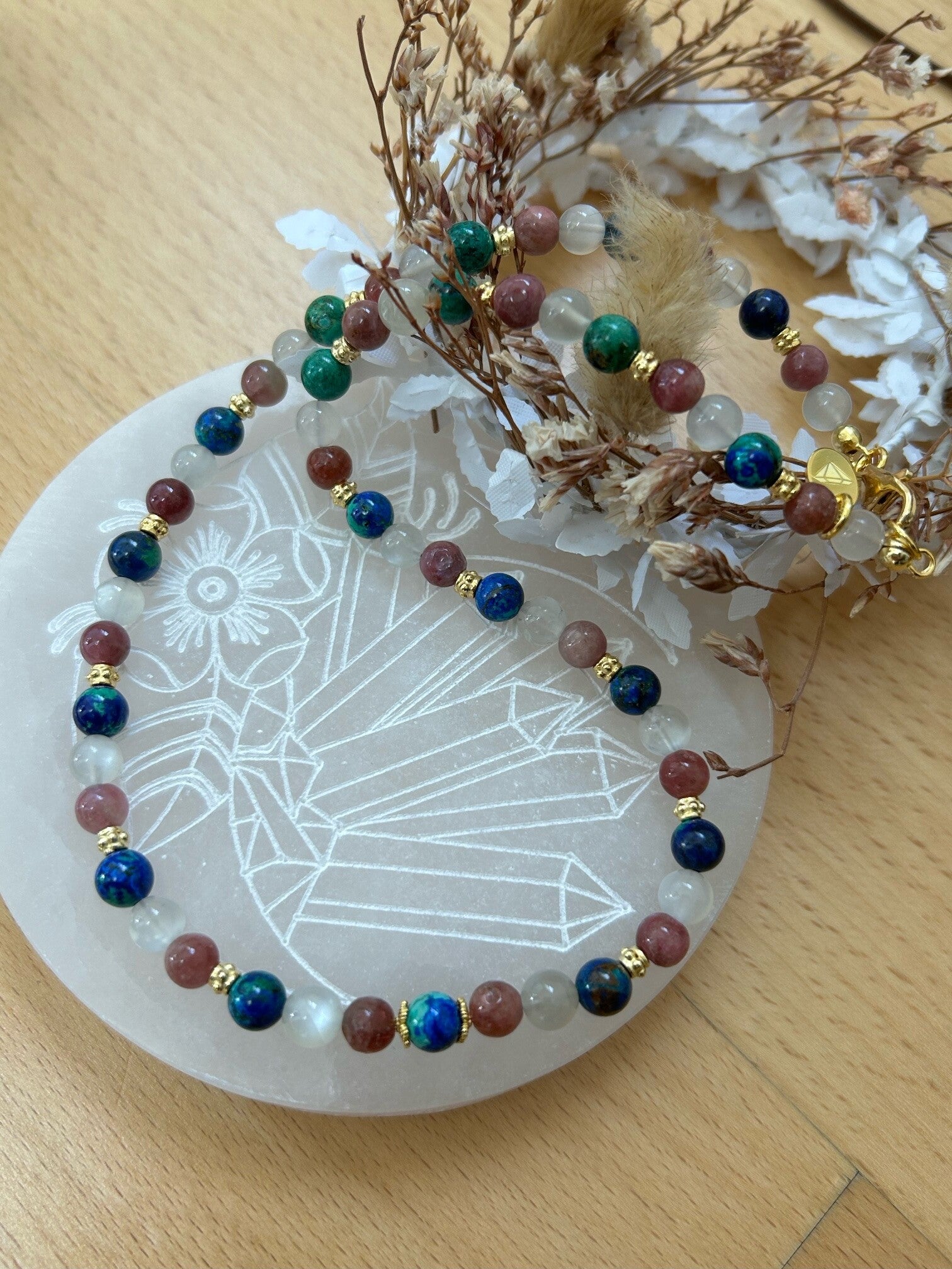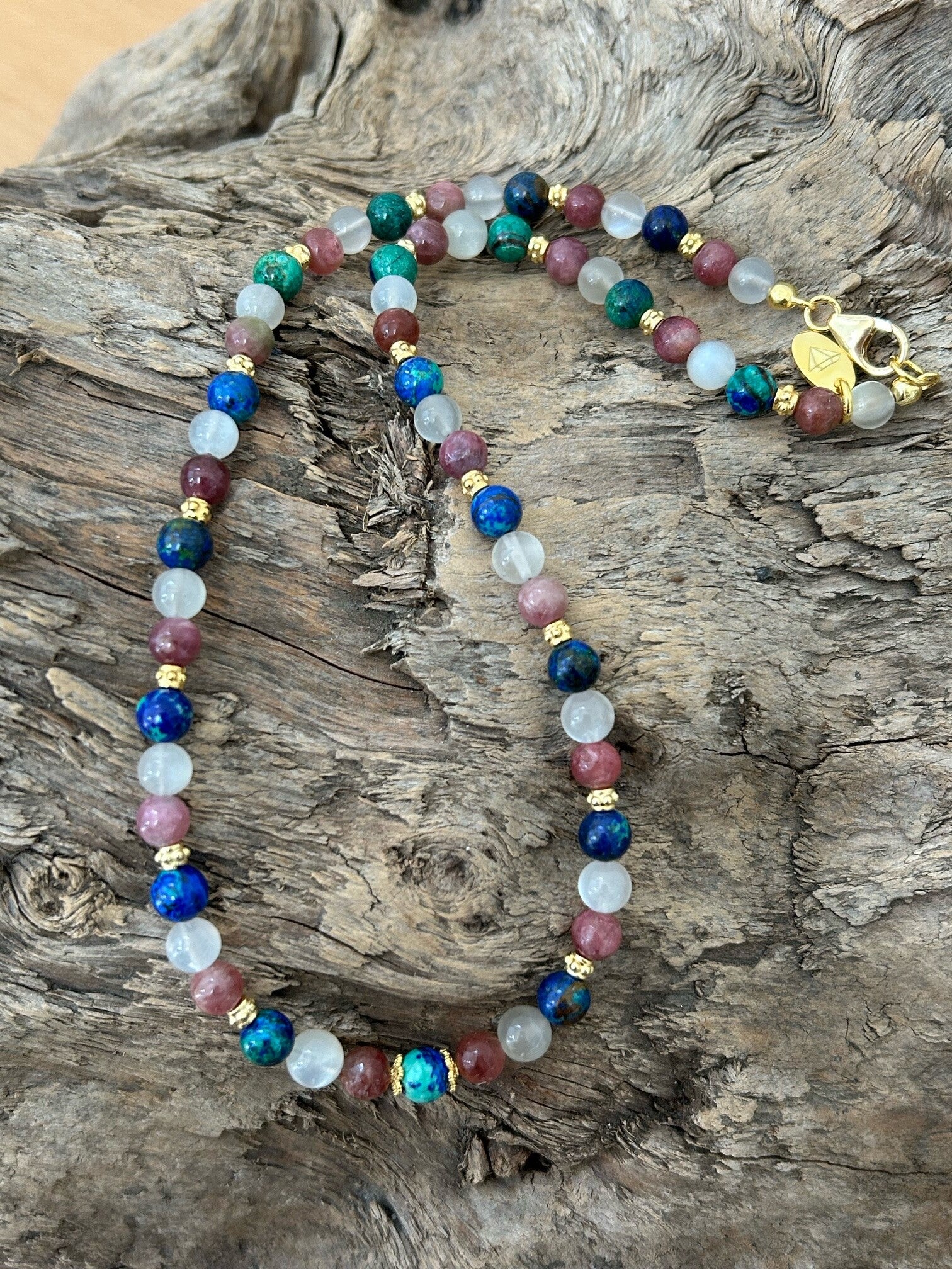 Azurit-Malachit: zur Auflösung disharmonischen Zellwachstums; kann das Wachstum von Geschwüren und Tumoren umkehren; wirkt Leber anregend und krampflösend auf die Eingeweidemuskulatur; bei vielen Frauenbeschwerden und sexuellen Erkrankungen sinnvoll einsetzbar; wirkt auf die Leber und die Gallenproduktion; hilft Unglücklichsein zu überwinden sowie unterdrückte Emotionen freizulassen; bringt Verstand und Gefühl in Harmonie, so dass sich innere Konflikte sowie negative Gefühle und Gedanken auflösen können; löst emotionale Blockaden bei hartnäckigen Beschwerden; hilft auszusprechen was zu lange zurückgehalten wurde; hilft bei zwangshaften Essproblemen