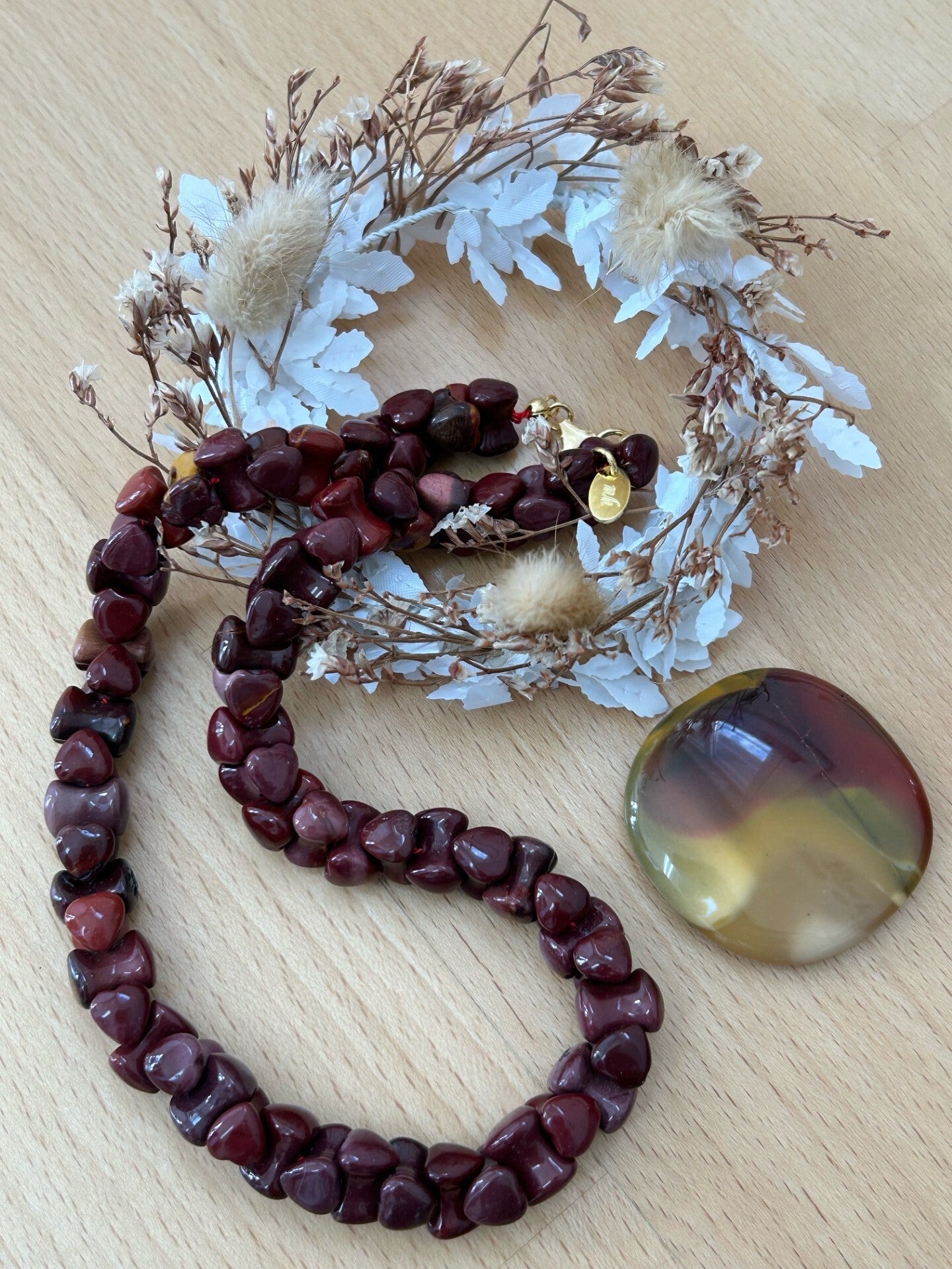 Mookait: stärkt Funktionen von Milz und Leber; hilft Gesundheit langfristig zu stabilisieren; regt Entgiftung des Gewebes an; fördert geistige Flexibilität, inneren Frieden und Geborgenheit; idealer Reisebegleiter
