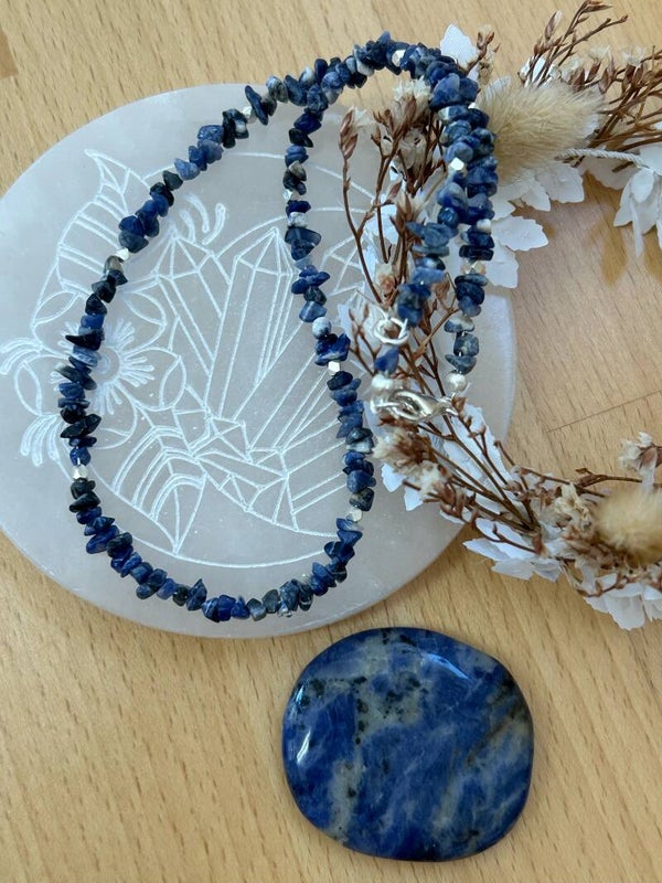 Sodalith (blau): heilt Beschwerden von Hals, Kehlkopf und Stimmbändern; senkt hohen Blutdruck; entgiftet über die Niere; verbindet Bewusstsein und Unterbewusstsein und gleicht diese aus; befreit blockierte Gefühle