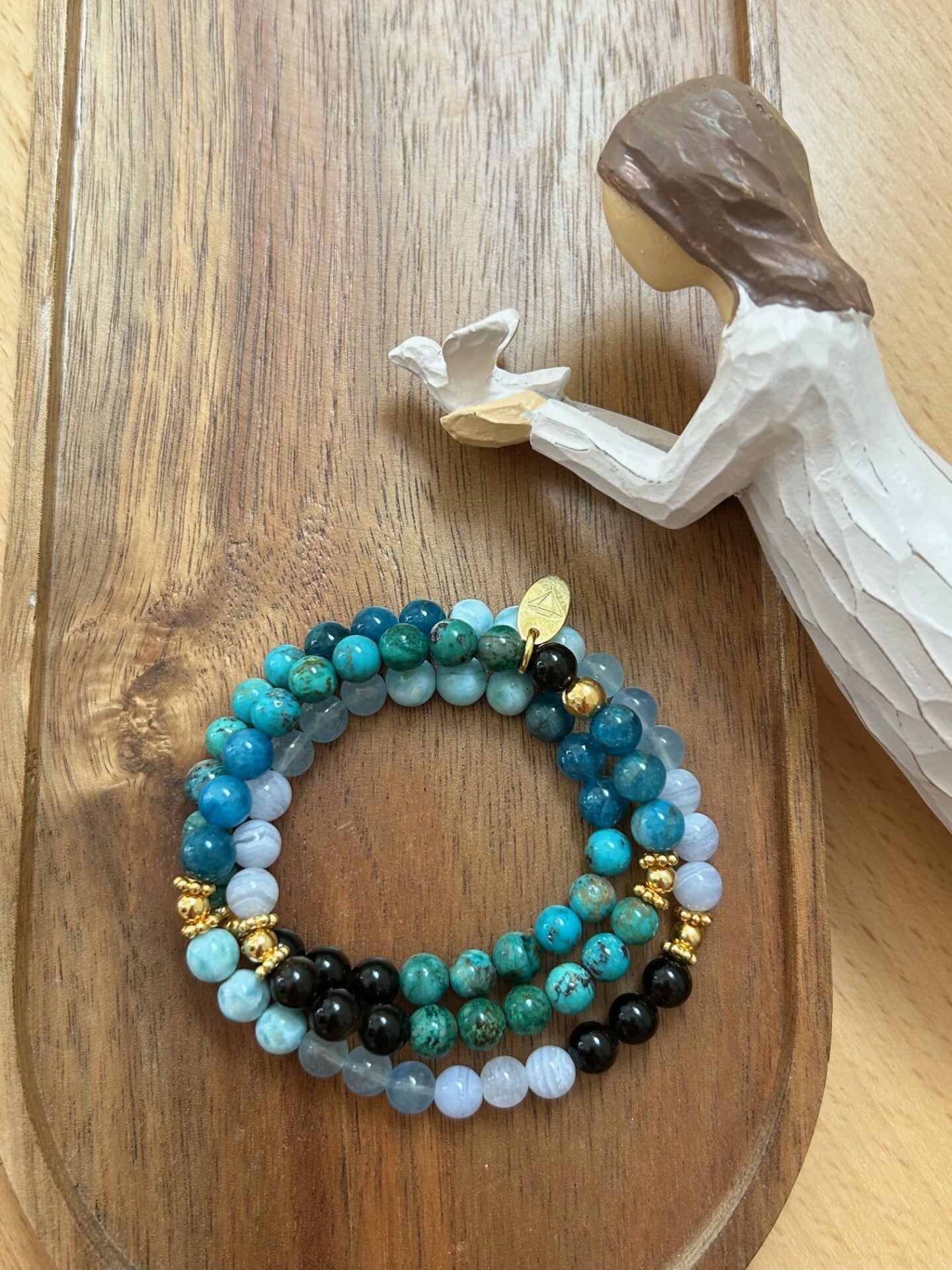 Chrysokoll: wirkt entkrampfend bei Menstruationsbeschwerden; wirkt blutdrucksenkend bei erhöhtem Blutdruck; entzündungshemmend sowie fiebersenkend bei Infektionen der oberen Atemwege; beruhigt Magen und Darmtrakt; regeneriert gestörtes Narbengewebe; hilft einen kühlen Kopf zu bewahren; nimmt Angst und Schuldgefühle; bringt Gefühle ins Gleichgewicht
