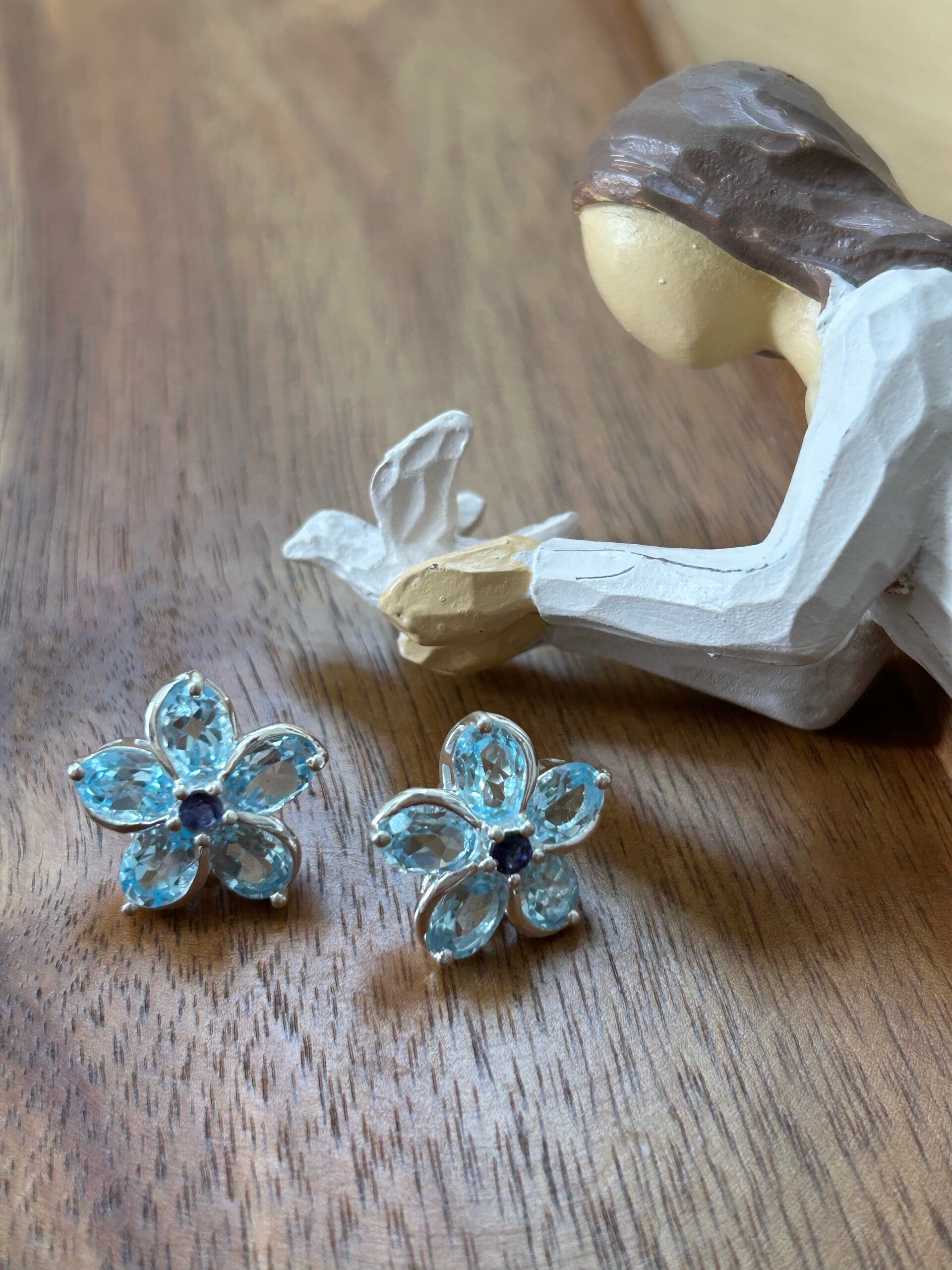 Grösse:17.9 mm; Blütenblätter aus facettiertem blauem Topas, im Zentrum facettierter Iolith