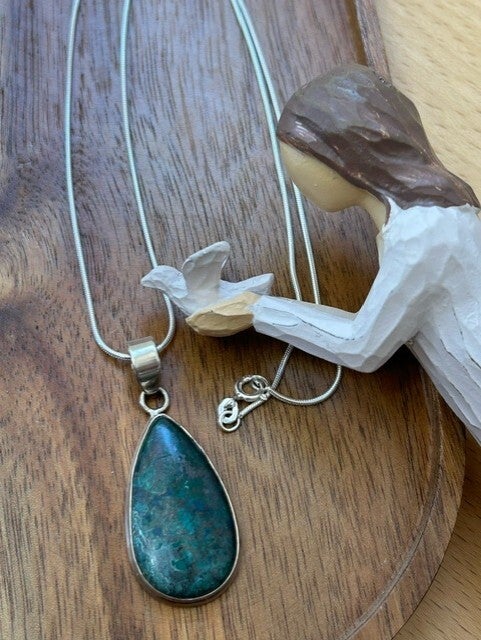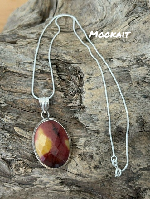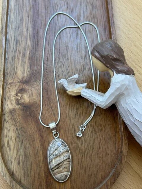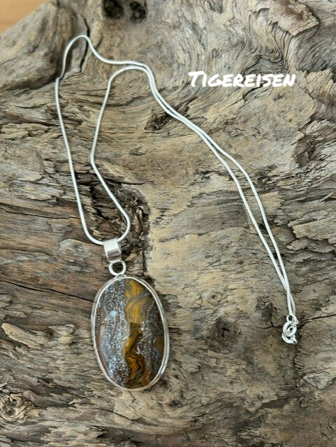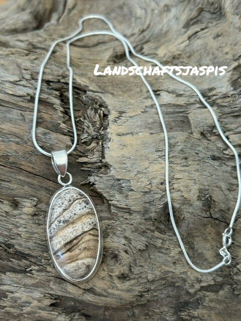 Länge: 50cm (auf Wunsch auch 45cm (ohne Aufpreis/Reduktion) respektive 60cm (+CHF 10) möglich); Silber 925 Schlangenkette und Stein-Einfassung; Anhänger wählbar (alles Einzelstücke!): Chrysokoll-Tropfen: 3.5 x 2 cm, Landschaftsjaspis oval: 3.5 x 2 cm, Mookait facettiert oval: 4 x 5 cm, Rhodochrosit oval: 2.5 x 3.5 cm, Tigereisen oval: 4.5 x 3 cm