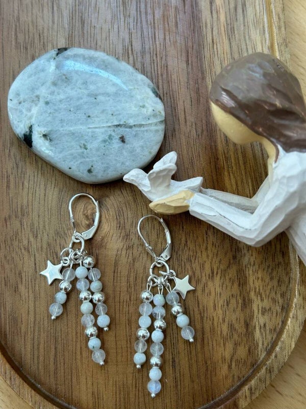 Mondstein weiss: regt die Zirbeldrüse an und gleicht das hormonelle Geschehen an den Mondzyklus an; hilft bei Mondsüchtigkeit; harmonisiert die hormonelle Umstellung während der Pubertät, im Wochenbett und im Klimakterium; wirkt auf die Knochen, beugt Osteoporose vor; beeinflusst das Lymphsystem; gut bei hormonell bedingter Schilddrüsenfehlfunktion sowie Hauterkrankungen; regt die Milchproduktion an; hilft bei Ödemen und Warzen; verbessert die Traumerinnerung; wirkt beruhigend bei irrationalen Ängsten; mindert emotionale Konflikte und Gefühlskälte, Stress, Unausgeglichenheit; steigert das Gefühlsempfinden; erleichtert den Zugang zum Unterbewusstsein und hilft alle Emotionen zu integrieren; fördert Einfühlungsvermögen und die Verbindung mit den Kräften der Natur; weckt vielfältige Interessen und ermutigt, diese ausgiebig zu verfolgen; verbindet mit matriarchalem Wissen; ist einer der wichtigsten Frauenheilsteine