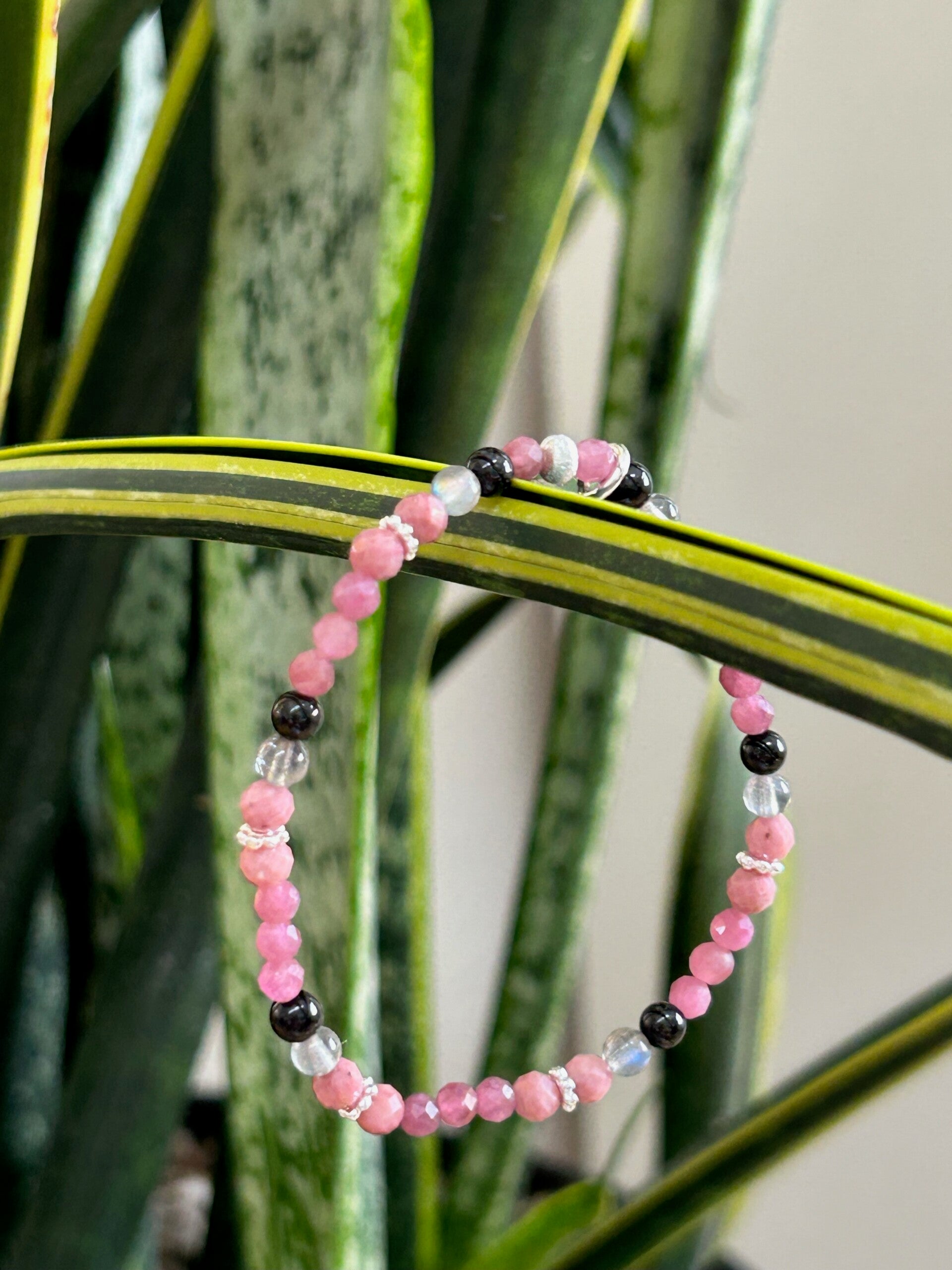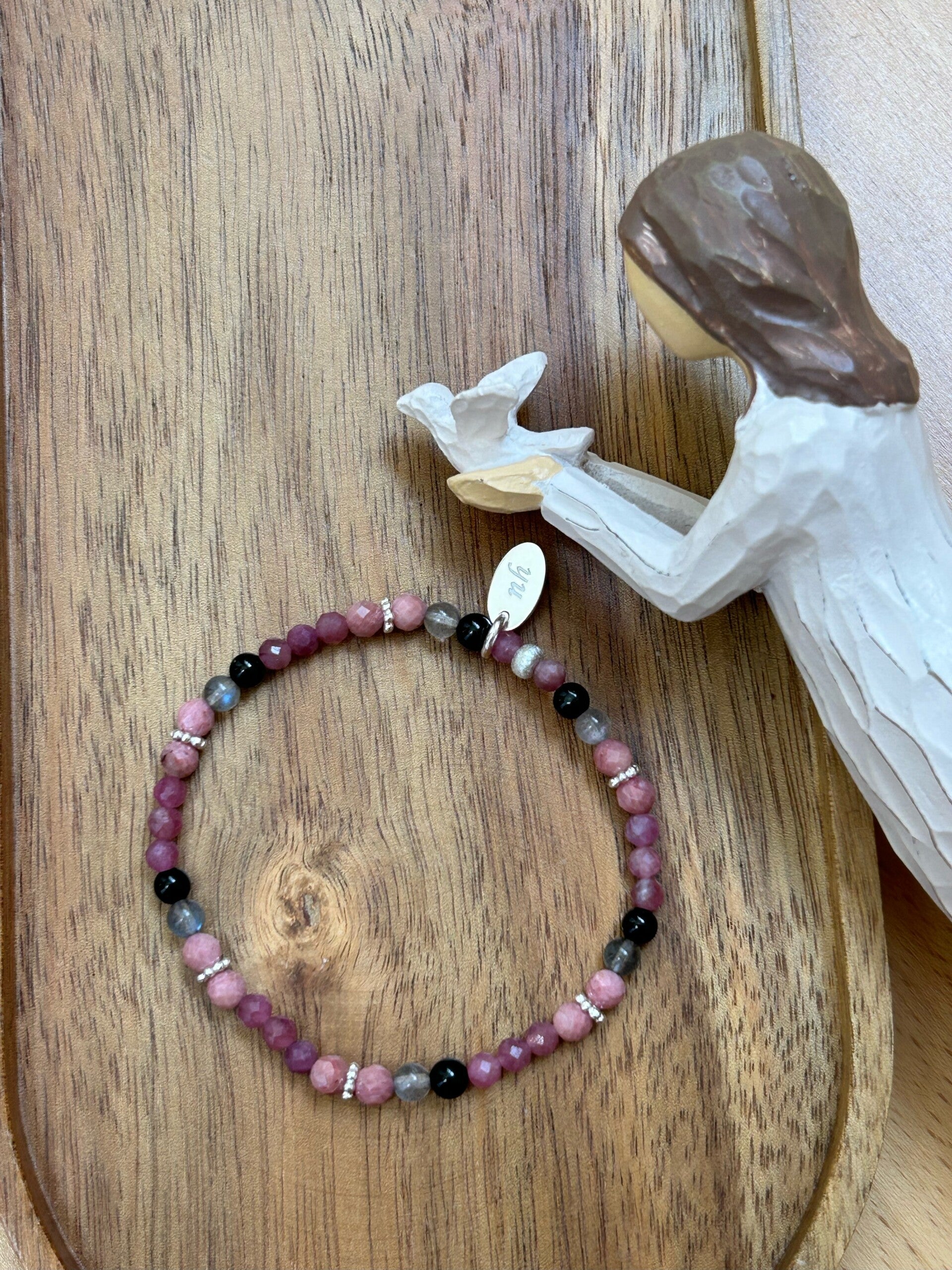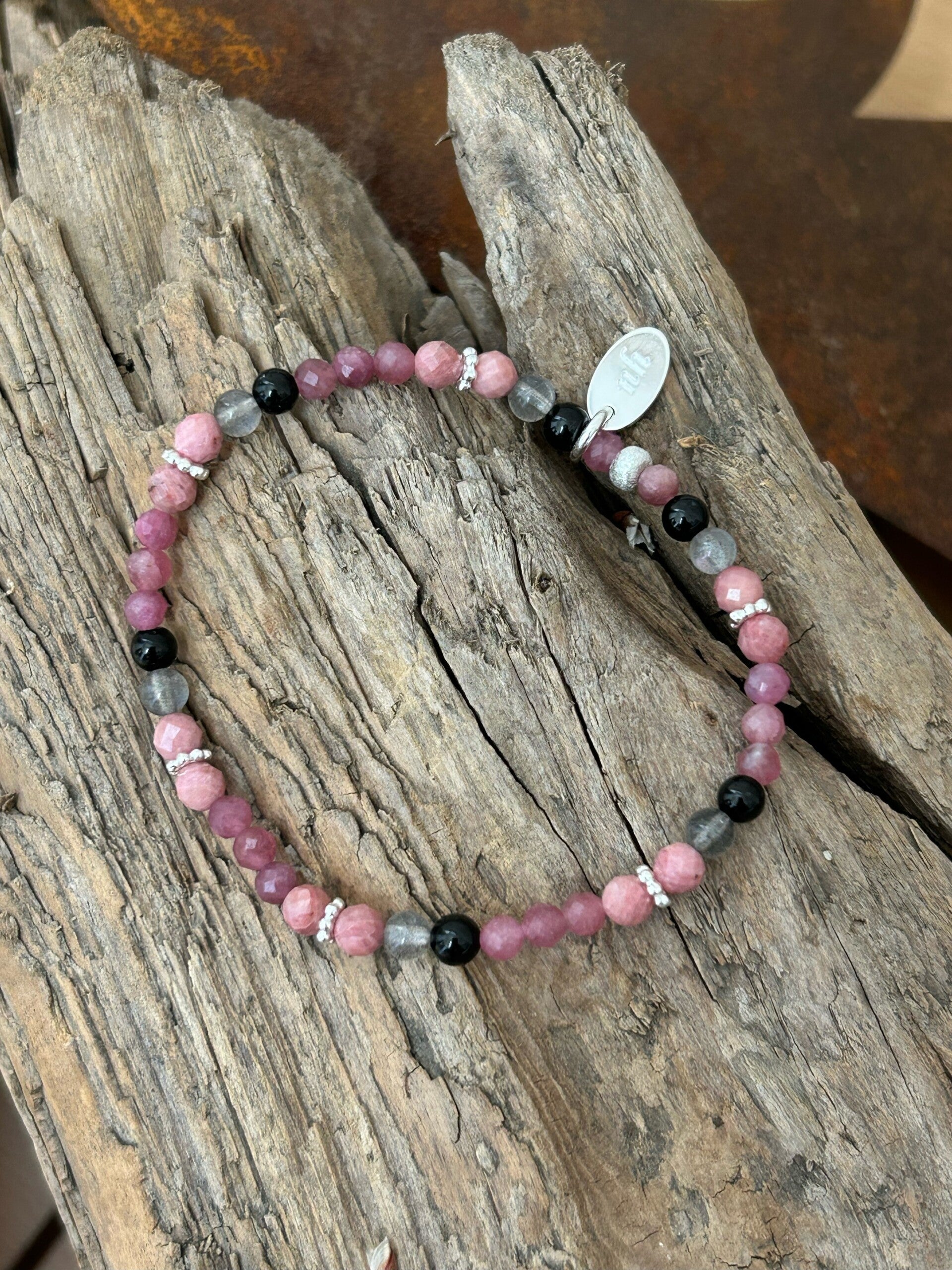 Heilsteine: Labradorit, Rhodonit, Turmalin rosa (Rubellit), Turmalin schwarz (Schörl)
