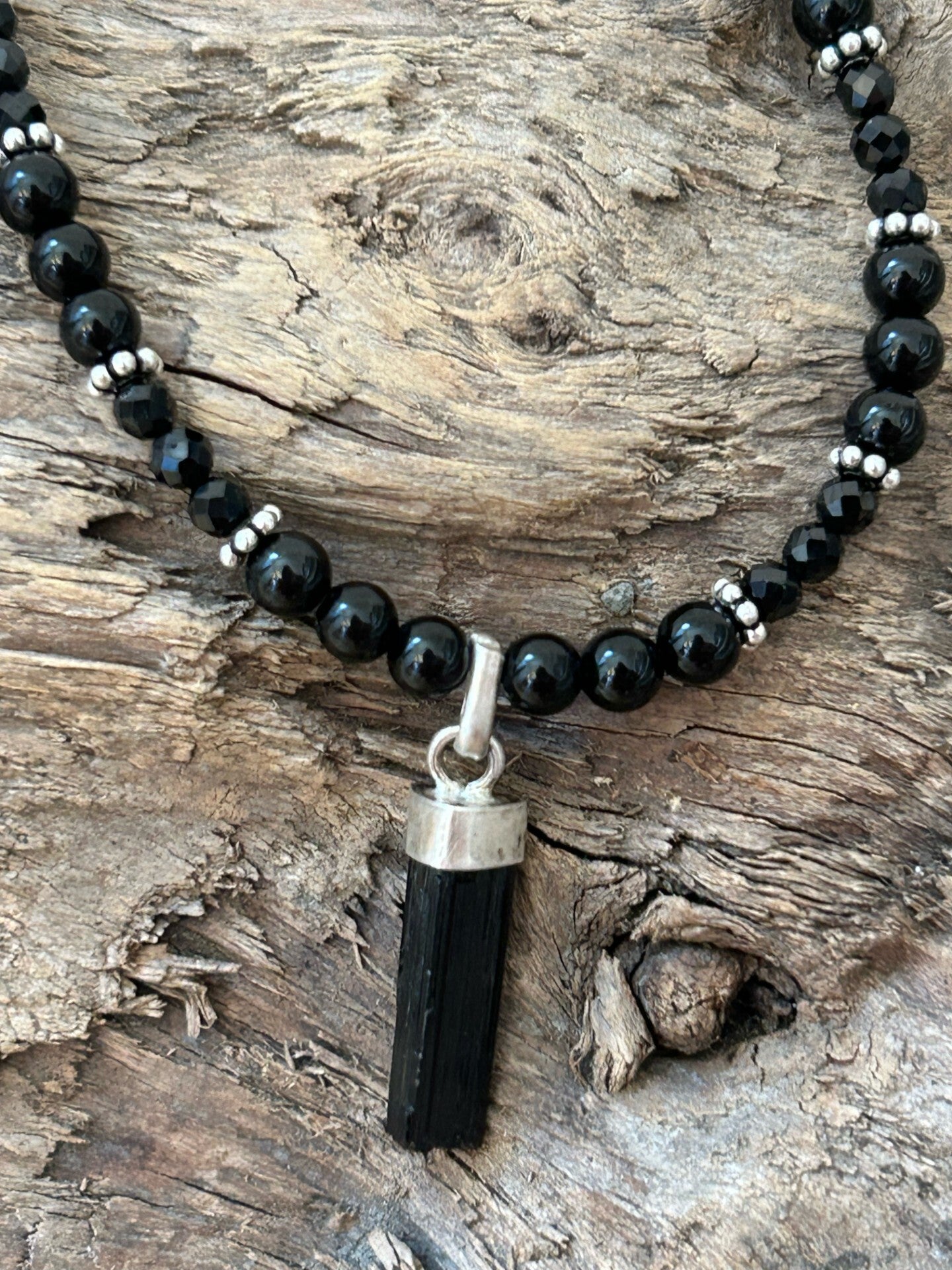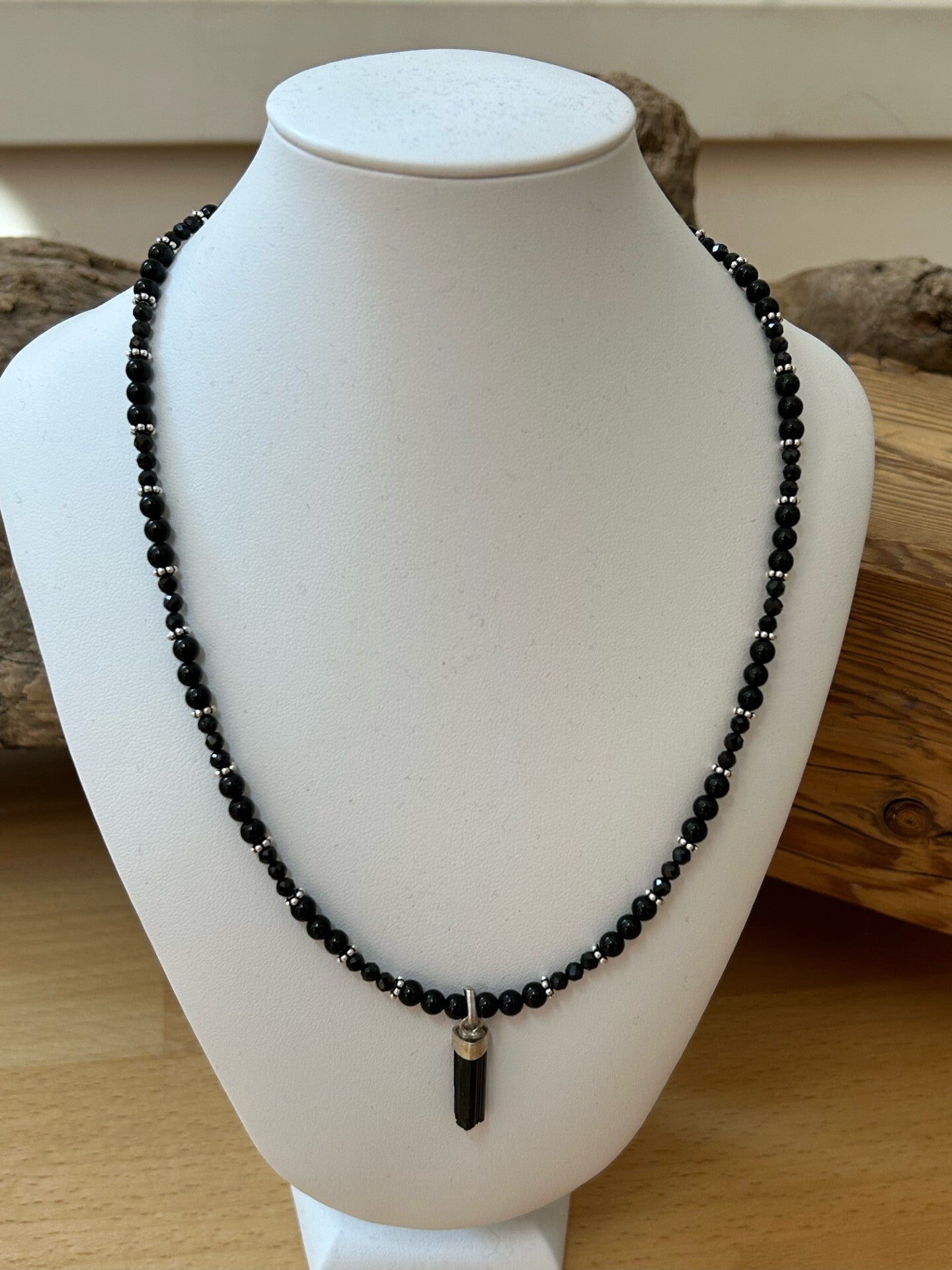 Länge: 45cm (auf Wunsch mit 5cm Verlängerungsstück); Silber 925 Einfassung Anhänger, Elemente und Verschluss; Anhänger Turmalin schwarz (Schörl) Rohstein; Kugeln 4mm und 3mm facettiert