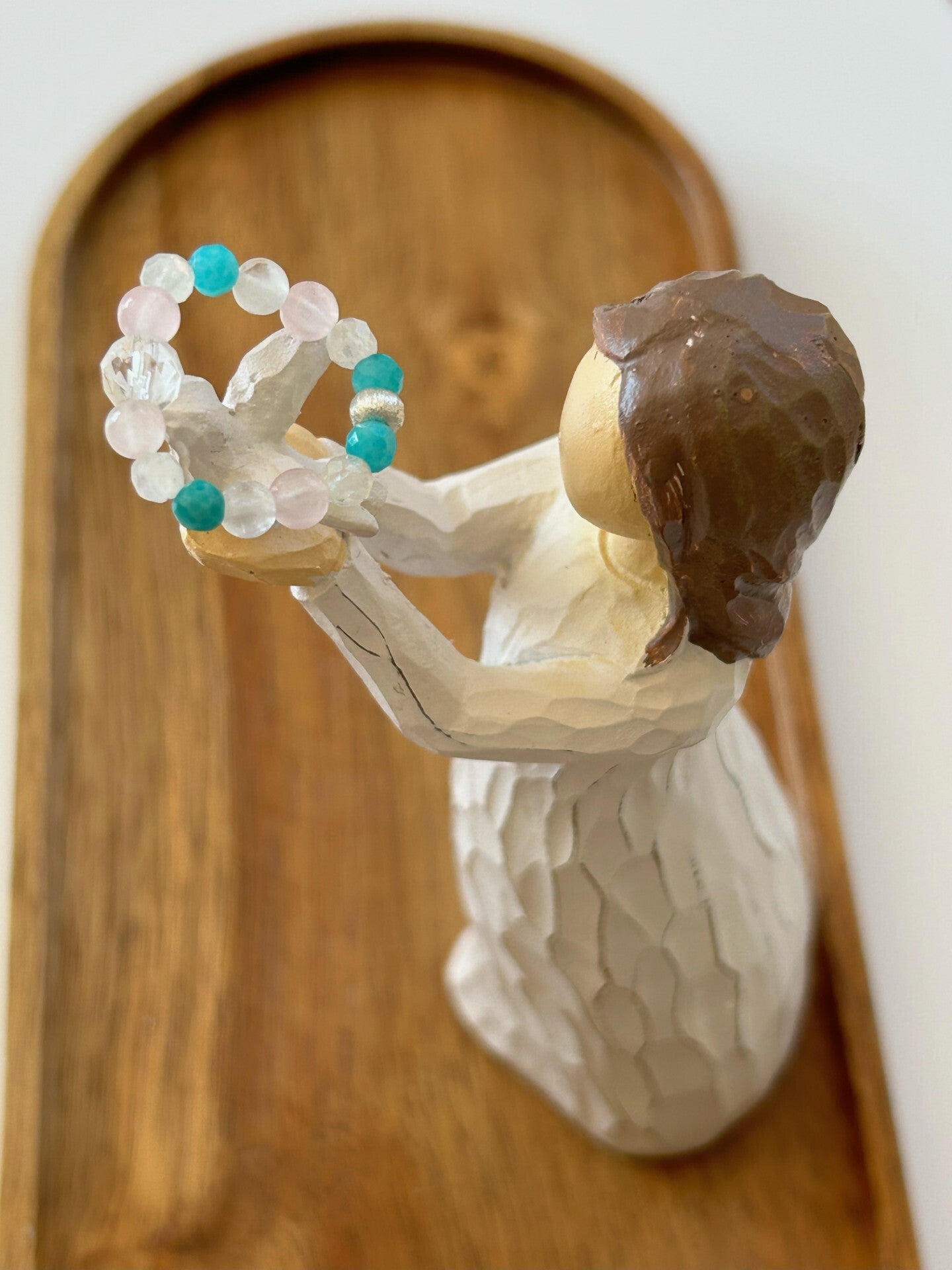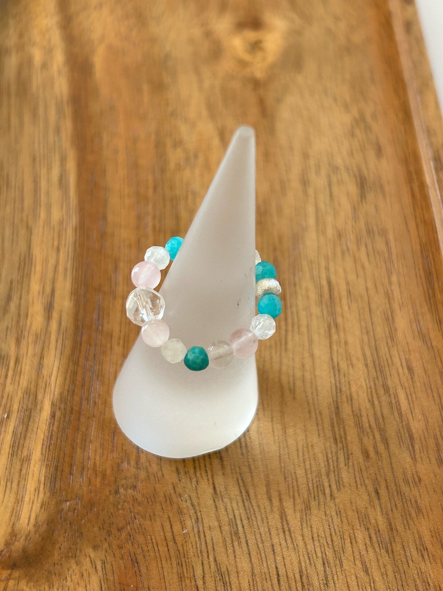 Heilsteine: Amazonit, Amethyst hell, Bergkristall, Mondstein Regenbogen, Rosenquarz