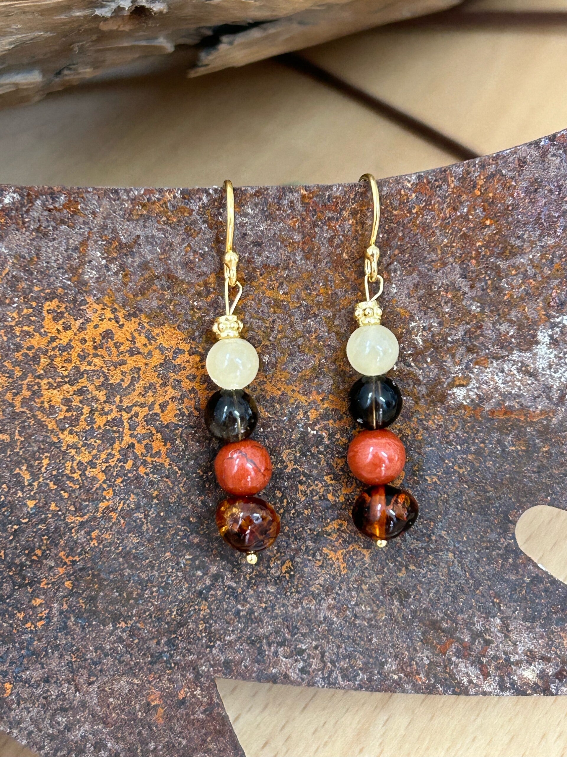Heilsteine: Bernstein Barock, Calcit gelb, Jaspis rotbraun, Rauchquarz