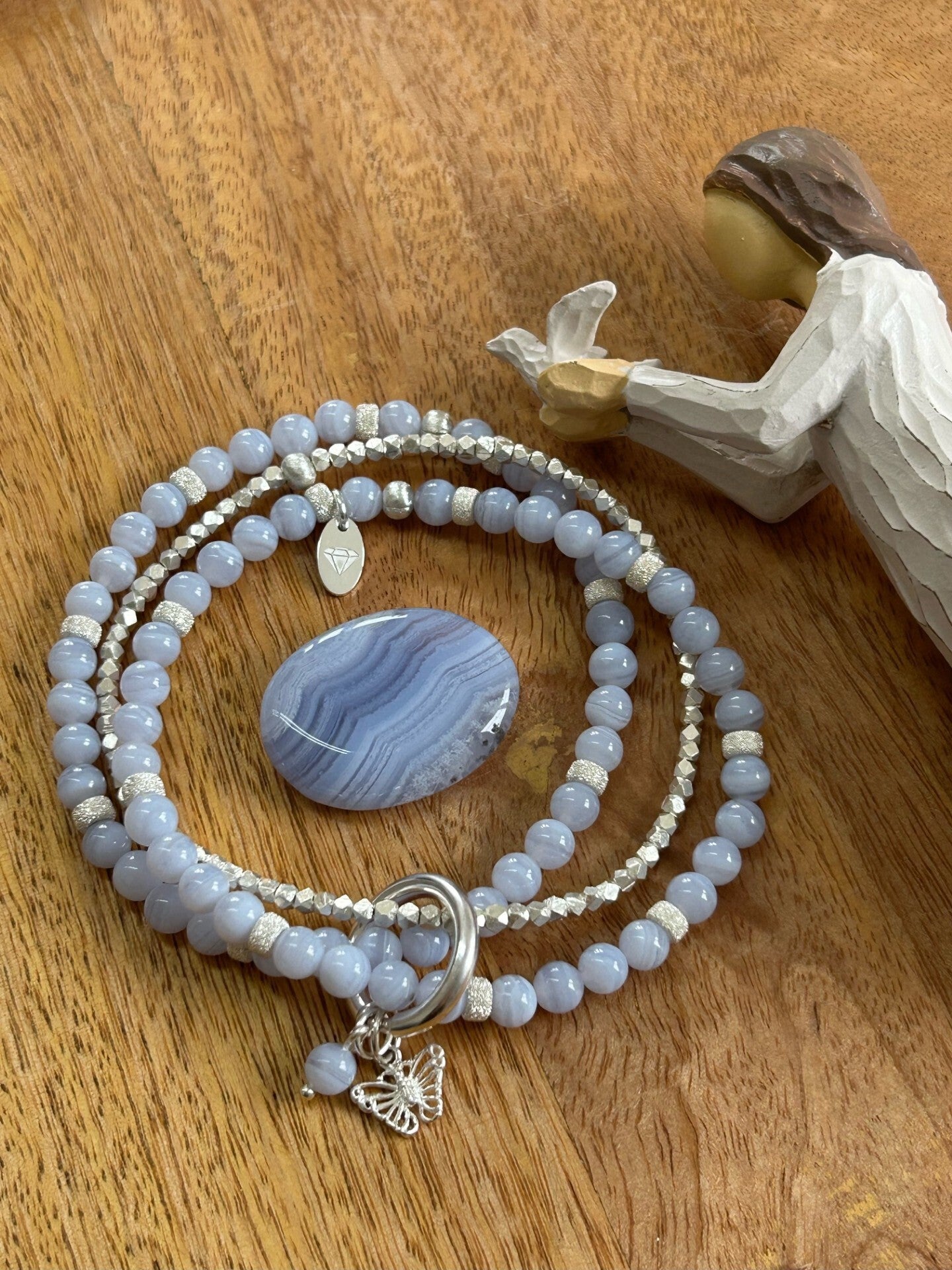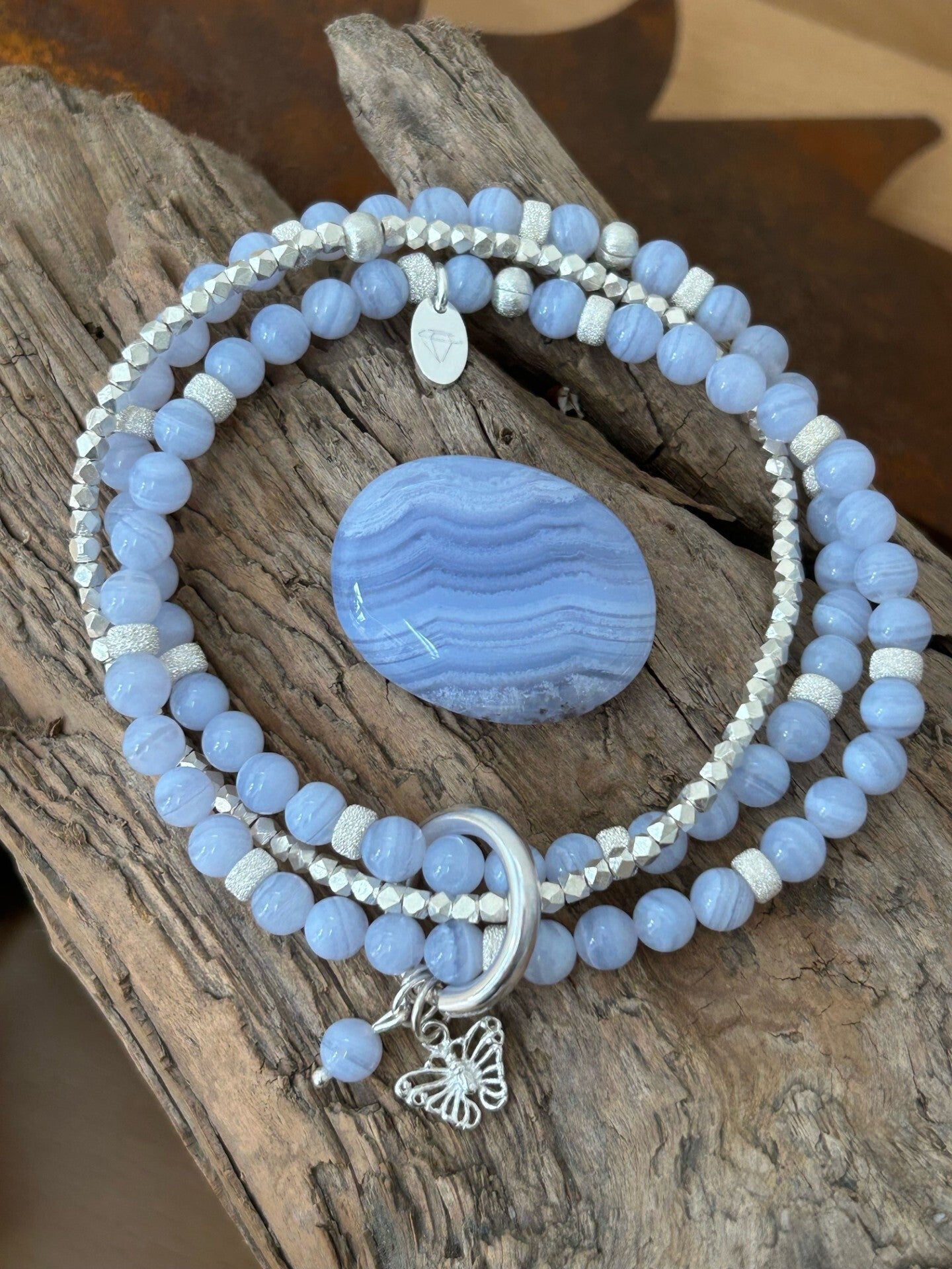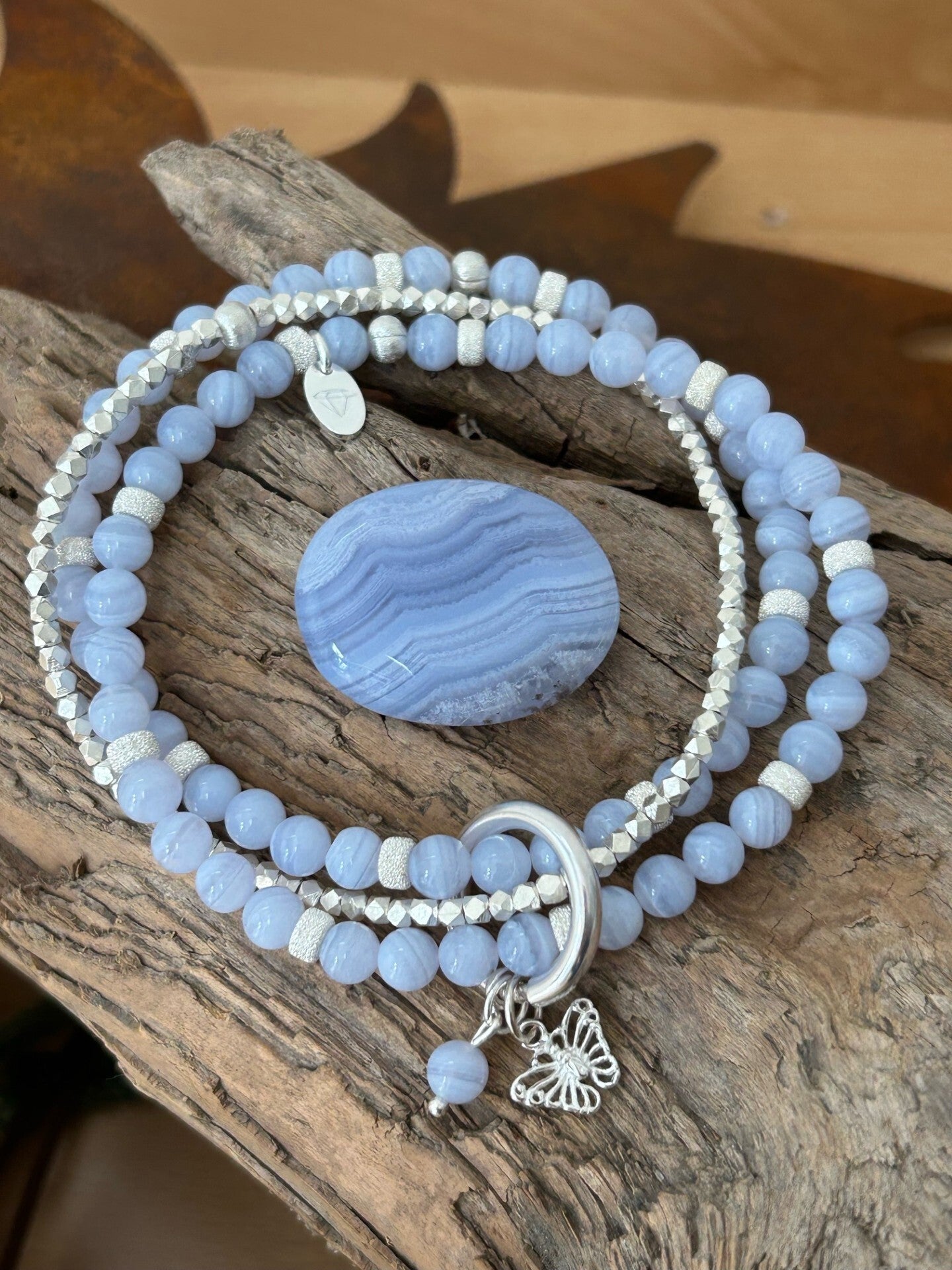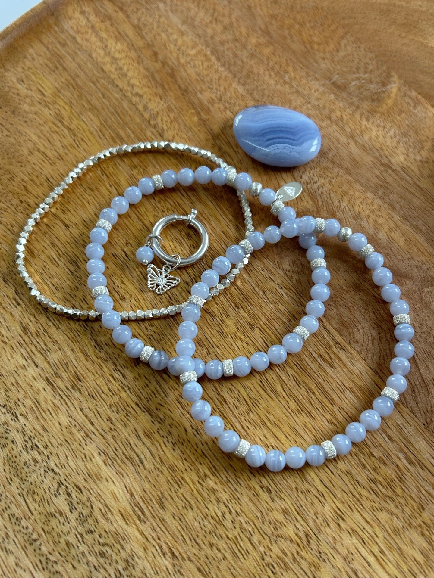 Hinweis: mit Stretch-Band; Silber 925 Armband mit facettierten Würfeln, Anhänger "Schmetterling", Karabiner 20mm und Elemente; kleiner Anhänger "Chalcedon blau"-Kugel; Kugeln 6mm (Top Qualität)