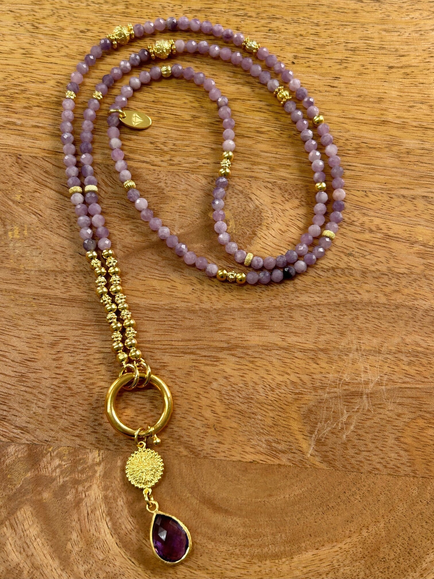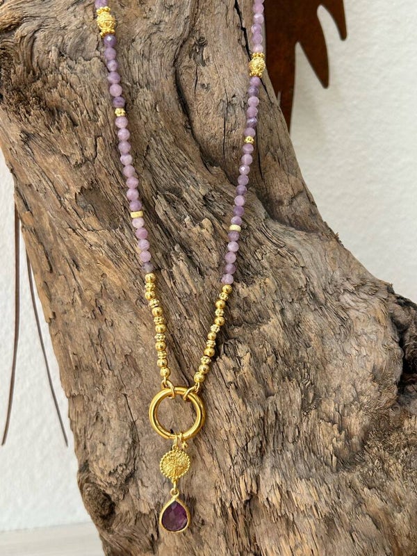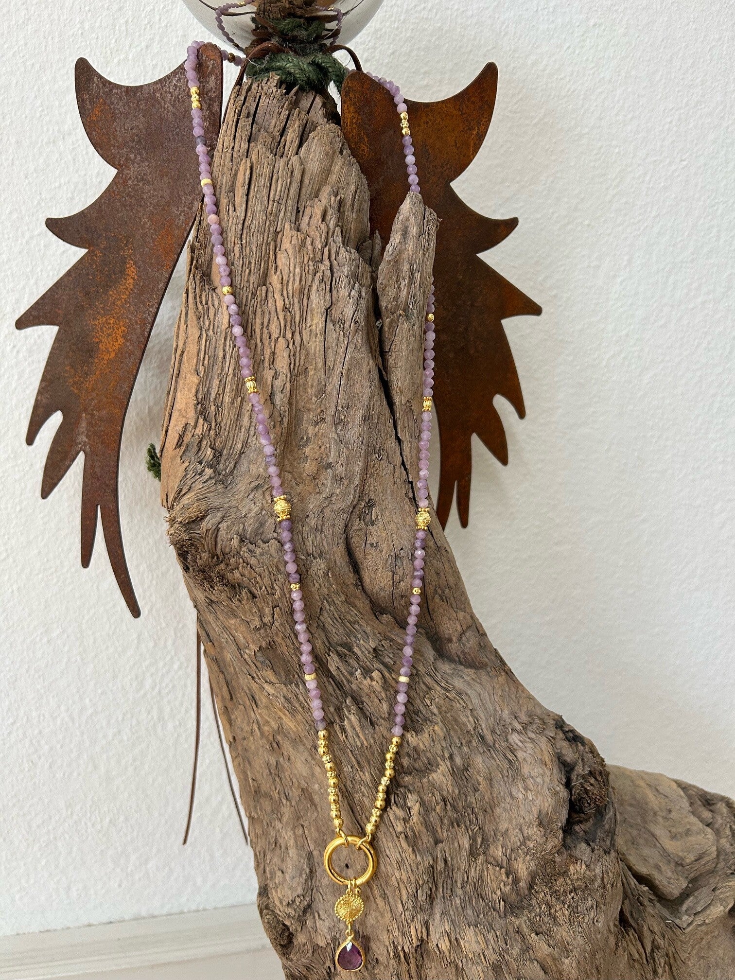 Länge: 75cm (Karabiner-Anhänger-Stein-Tropfen +6cm); Silber 925 vergoldeter Karabiner, Anhänger, Einfassung Tropfen, Elemente und Verschluss; Tropfen Amethyst facettiert; Kugeln 4mm facettiert