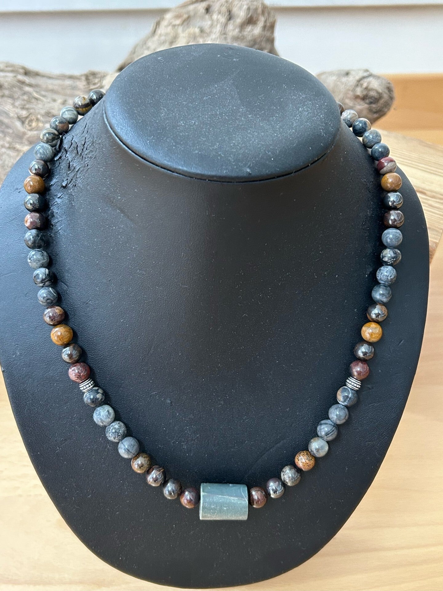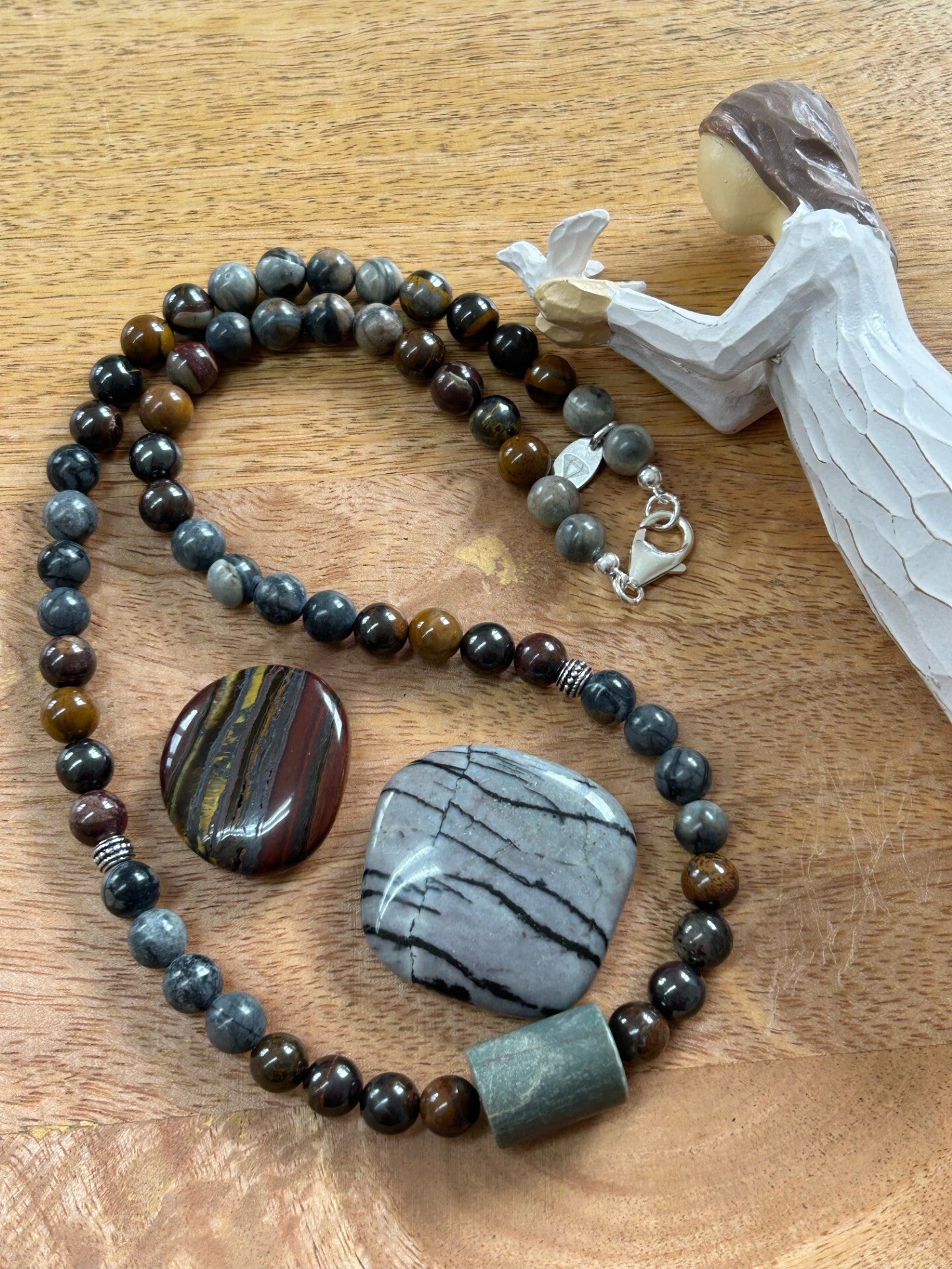 Länge auf diesem Bild: 54cm (Deine genaue Wunschlänge im Kommentar eintragen und die entsprechende Preisklasse wählen); Silber 925 geschwärzte Elemente; Zylinder 21x10mm aus Picasso-Jaspis; Kugeln 8mm