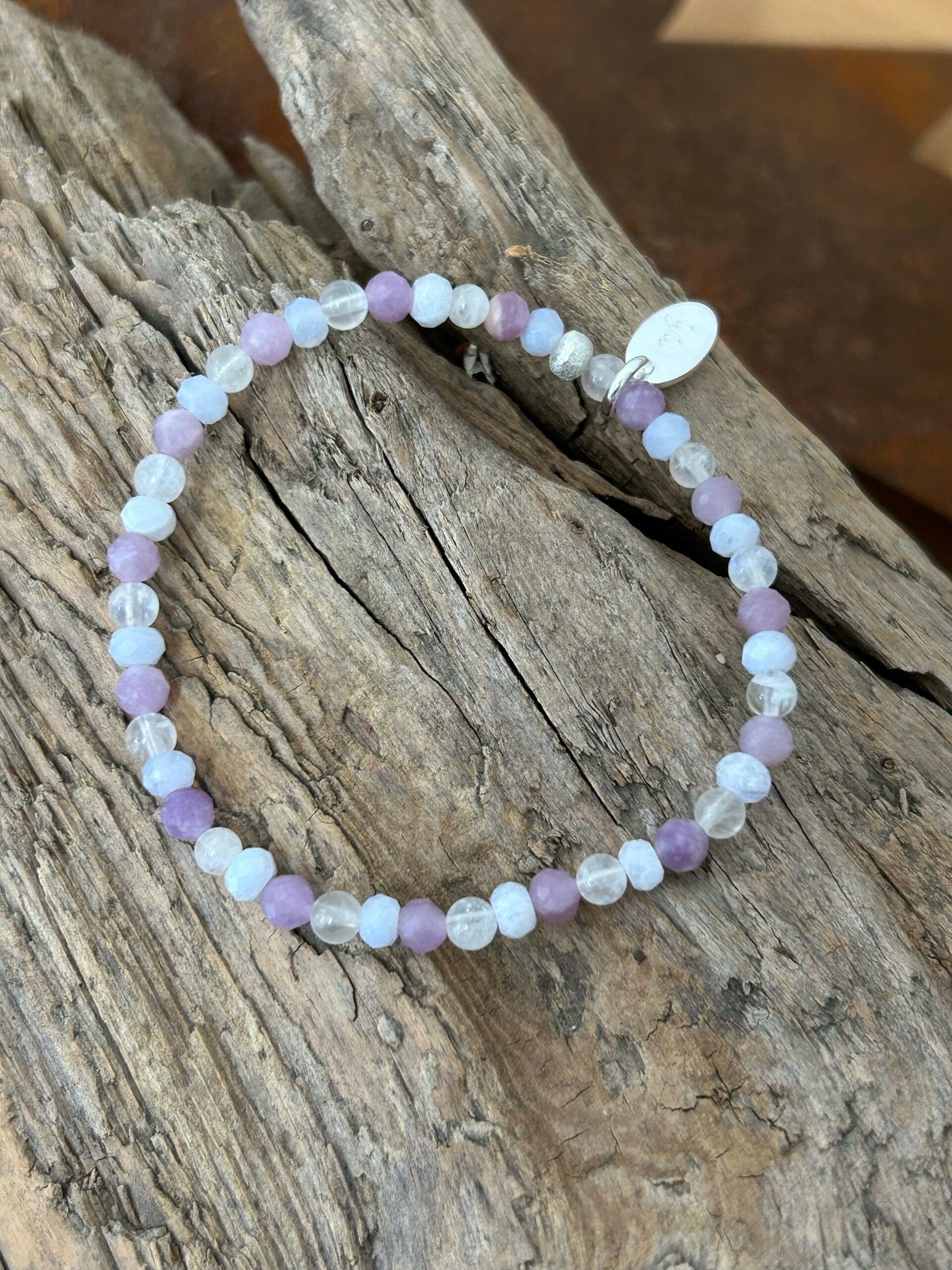 Heilsteine: Chalcedon blau, Lepidolith, Mondstein weiss