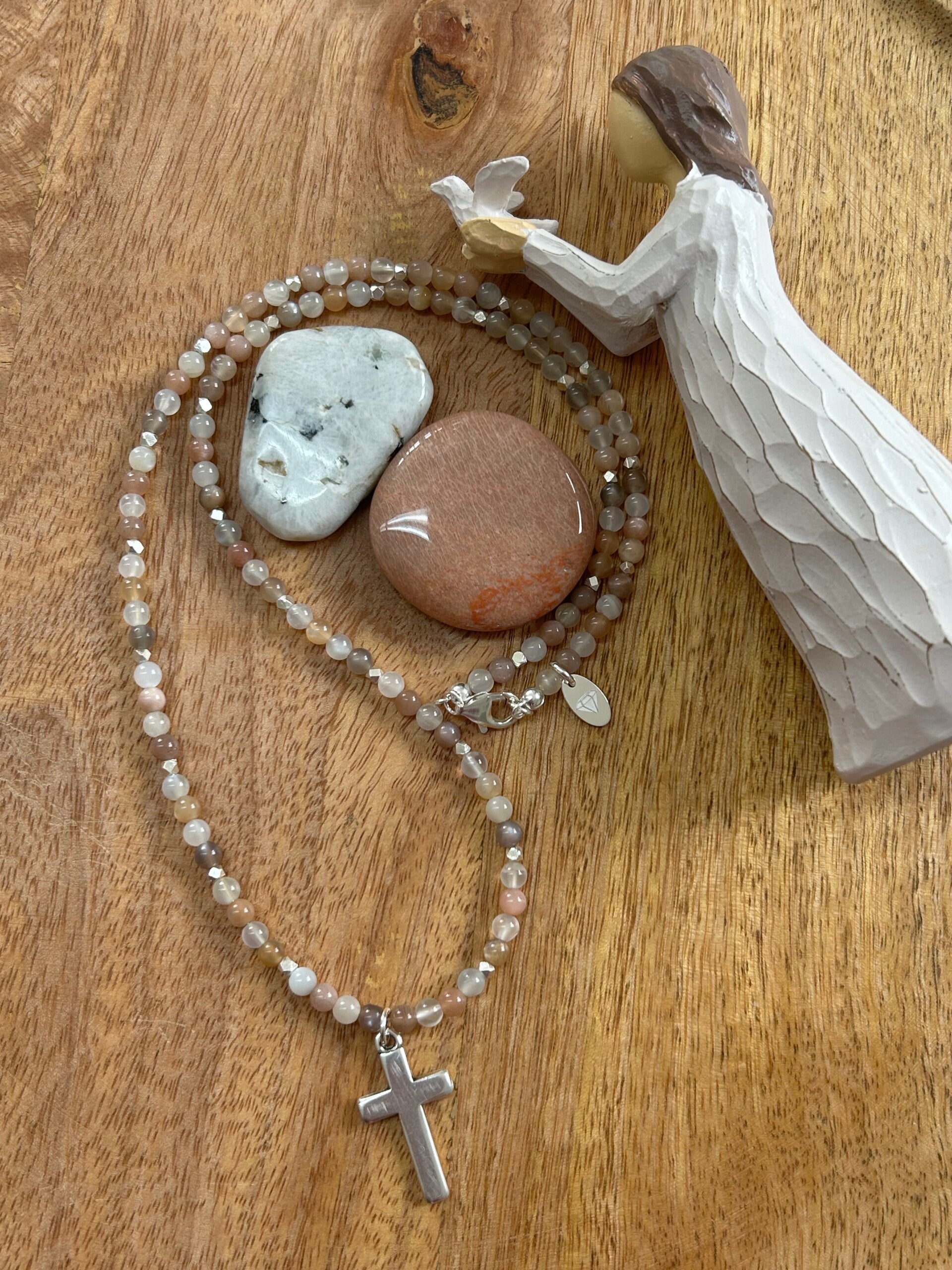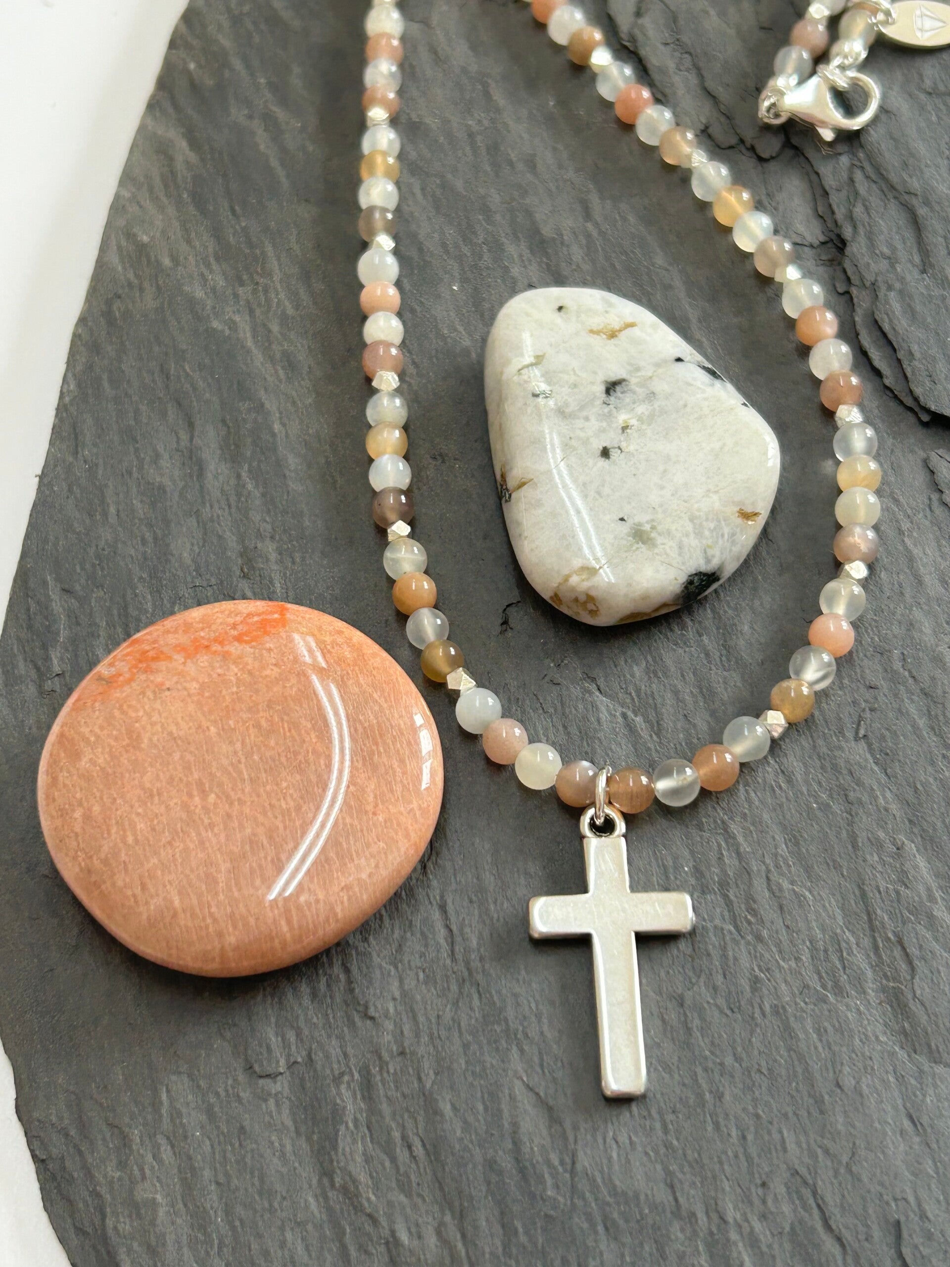 Länge auf diesem Bild: 60 cm (Deine genaue Wunschlänge bitte in den Kommentar eintragen und die entsprechende Preisklasse wählen); Silber 925 Anhänger "Kreuz" (30x19mm), Würfel facettiert und Verschluss; Kugeln 4mm