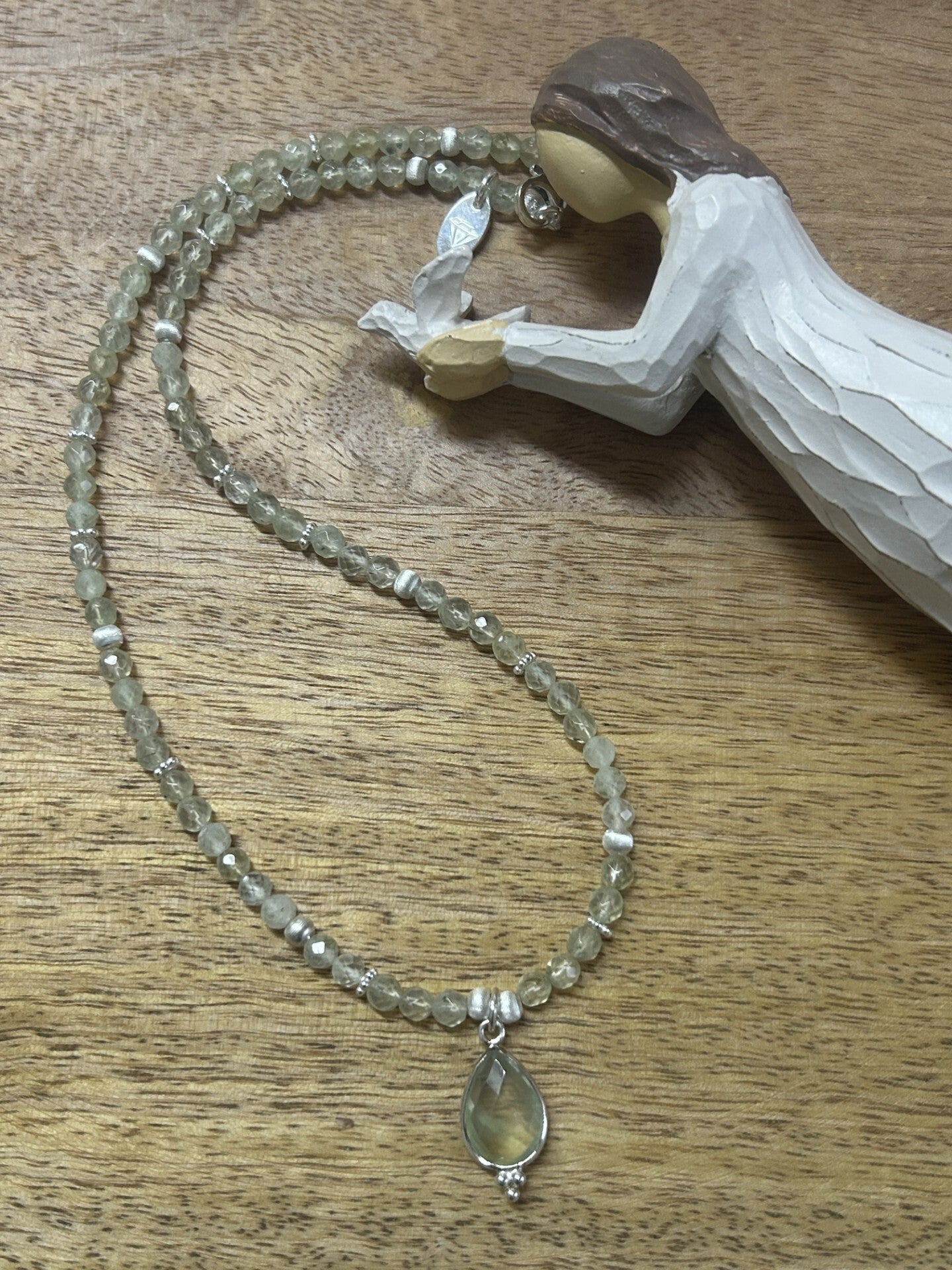 Länge auf diesem Bild: 43cm (Bitte deine genaue Wunschlänge im Kommentar erfassen und die entsprechende Preisklasse wählen); Silber 925 mattierte Elemente, Silber 925 Einfassung Anhänger (Prehnit facettiert); Kugeln 4mm facettiert