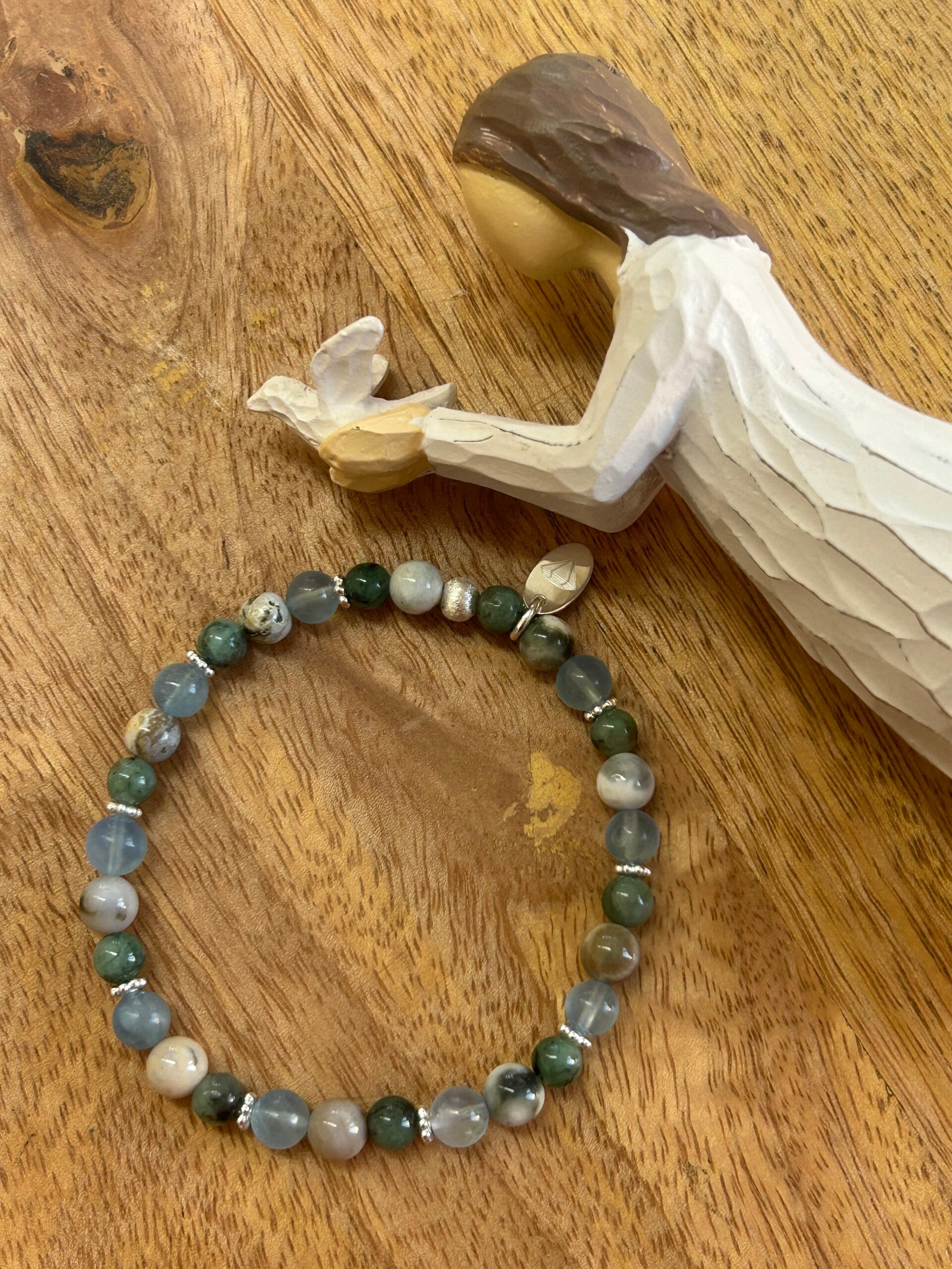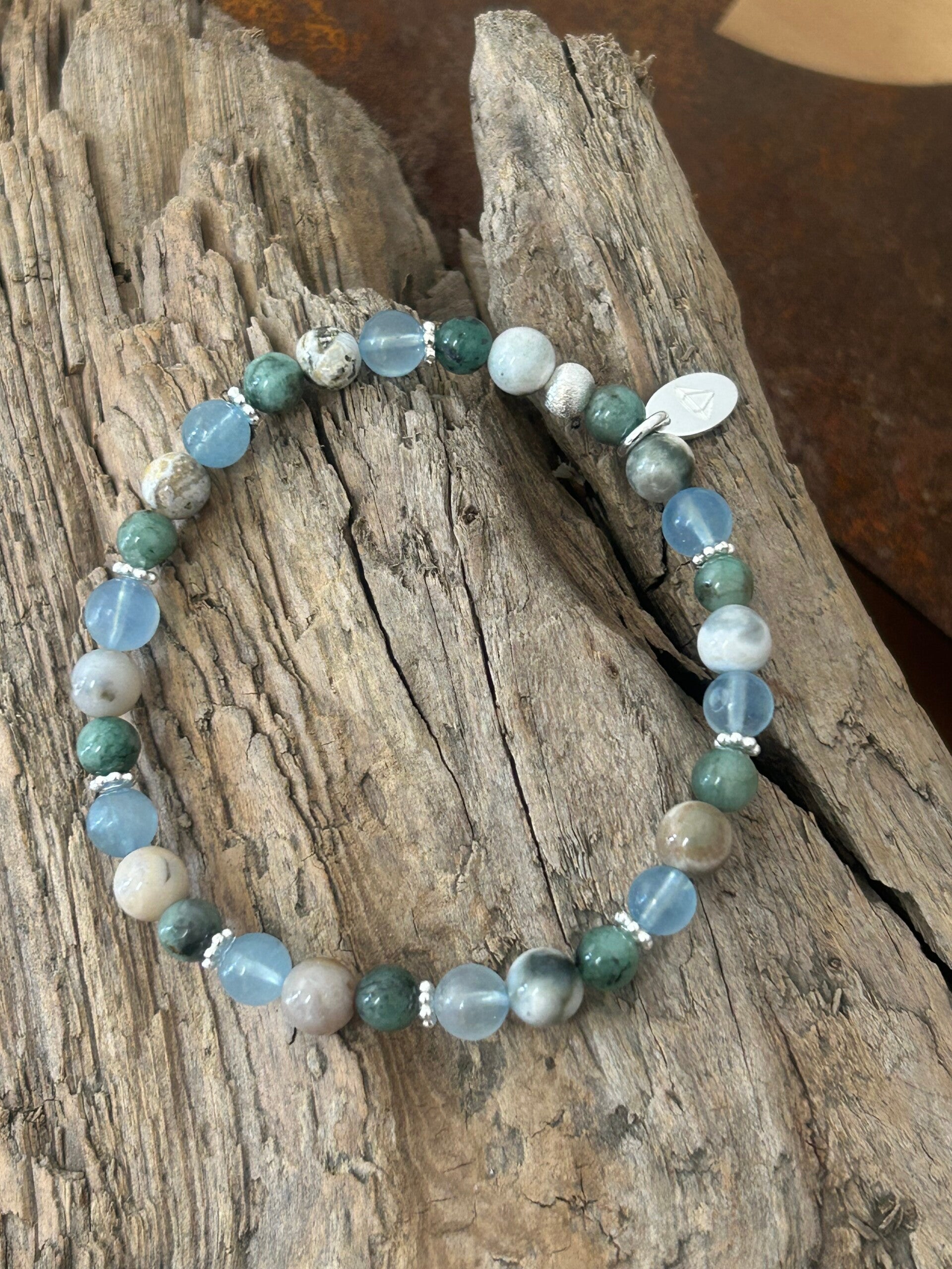 Heilsteine (Link zu Beschreibung und Wirkung): Beryll blau (Aquamarin), Ozean-Achat, Smaragd (Beryll grün)