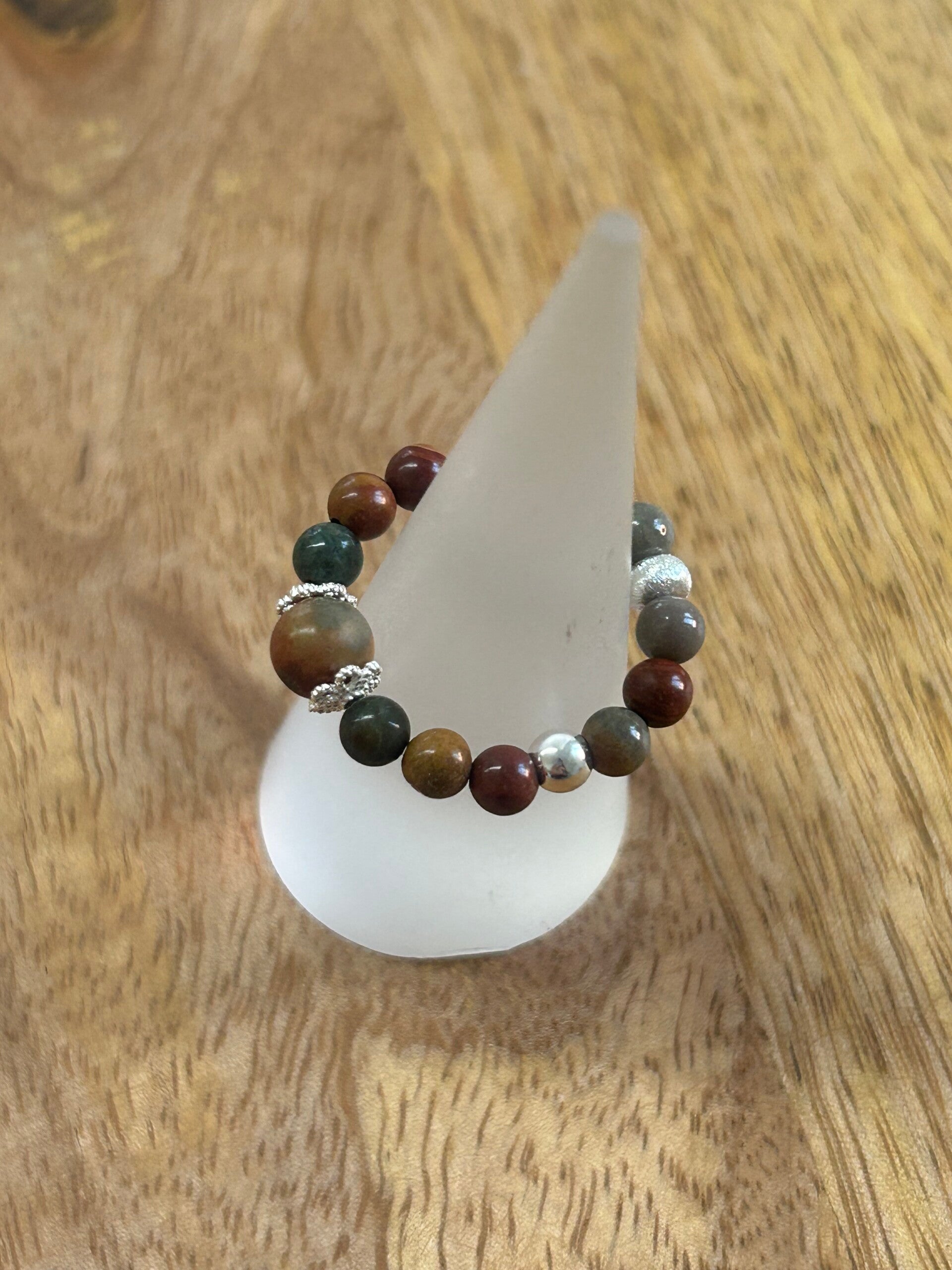 Polychrom-Jaspis: verbessert Elastizität und Festigkeit der Haut und des Bindegewebes; wirkt reizlindernd auf der Haut und Schleimhaut; reguliert sanft die Verdauung und erleichtert die Gewöhnung an ungewohnte Kost; fördert praktische Talente wie auch Kreativität, Fantasie und bildhaftes Denken, fördert Toleranz und Gelassenheit