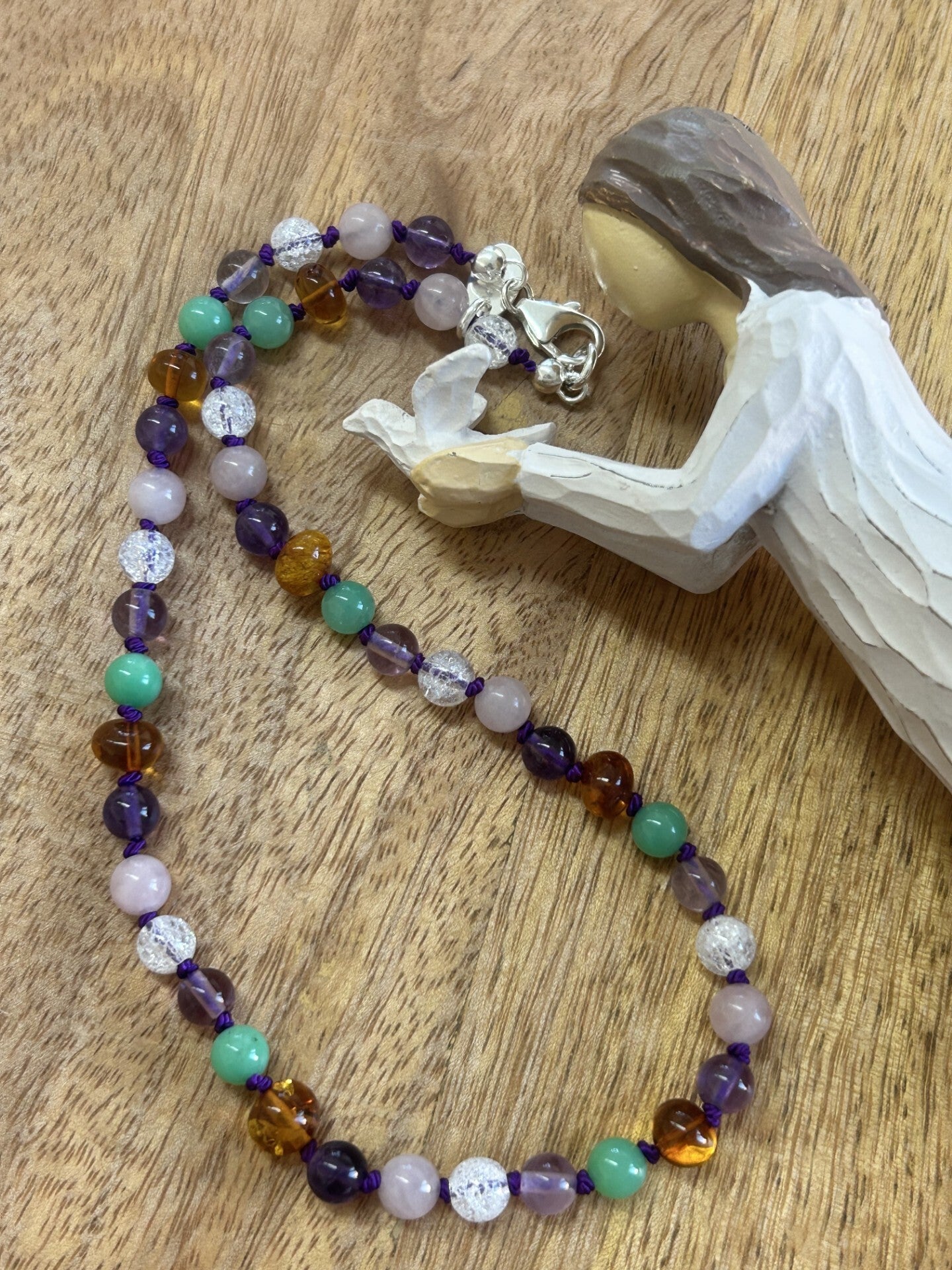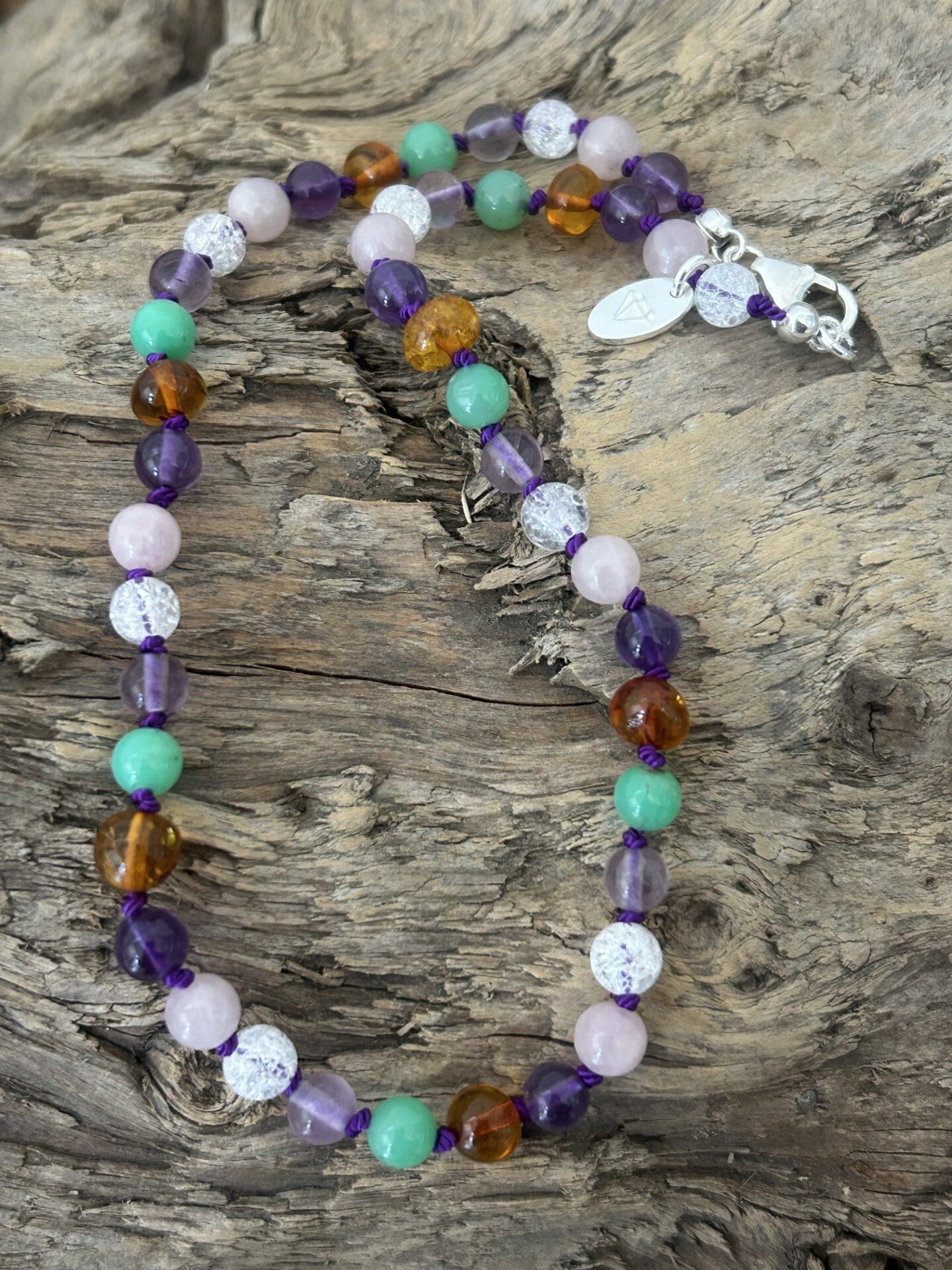 Heilsteine: Amethyst, Bergkristall Iris, Bernstein Barock, Chrysopras, Fluorit, Rosenquarz