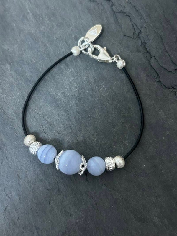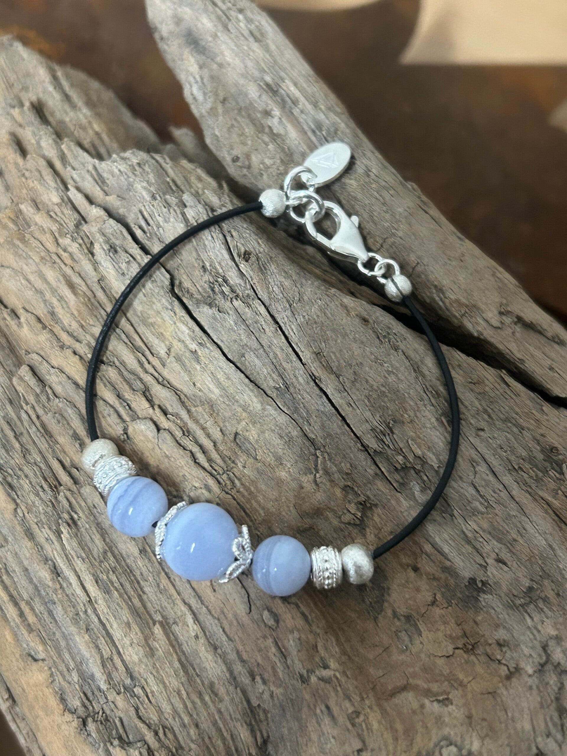 Hinweis: mit Lederband (1mm); Silber 925 Perlkappen, Elemente und Karabiner-Verschluss; Kugeln in Top Qualiät 8 und 10mm