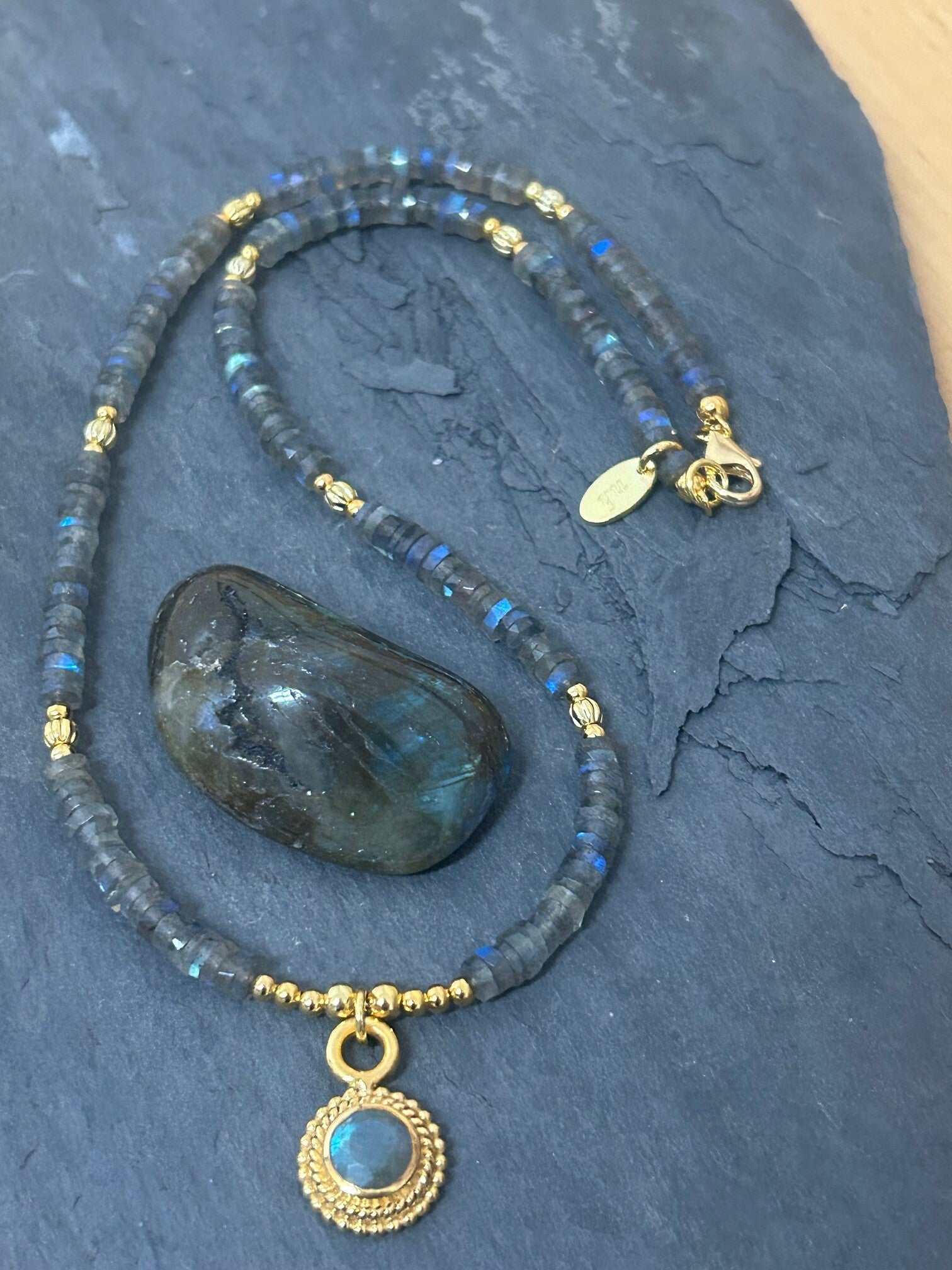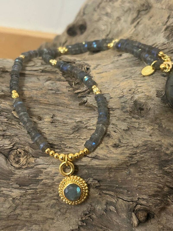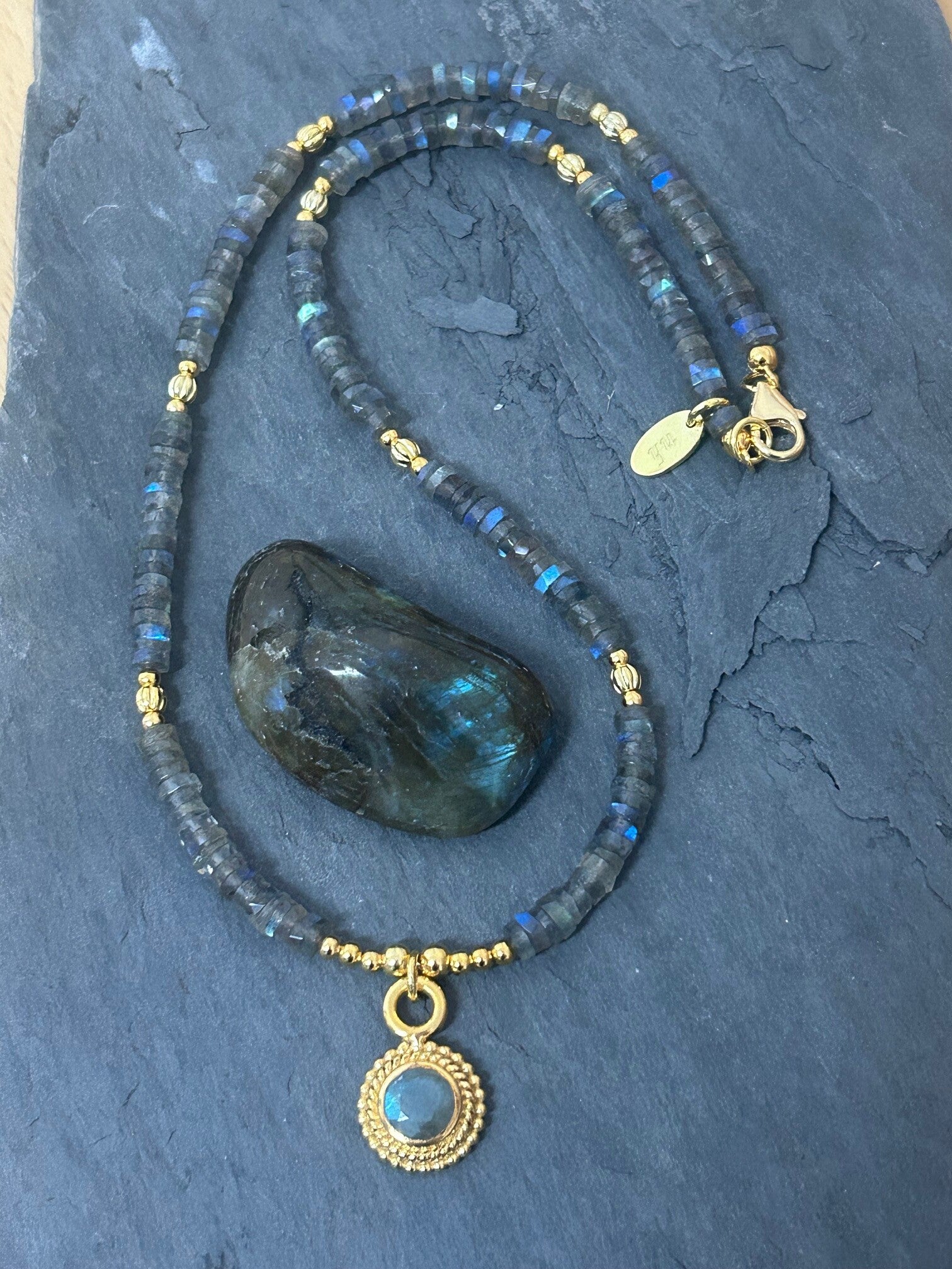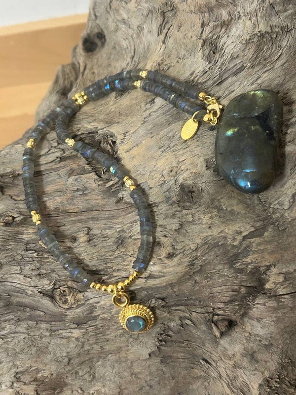 Länge auf diesem Bild: 48cm (Deine genaue Wunschlänge im Kommentar eintragen und die entsprechende Preisklasse wählen); Silber 925 vergoldeter Anhänger (facettierter Labradorit) und Elemente; Disc 6mm facettiert